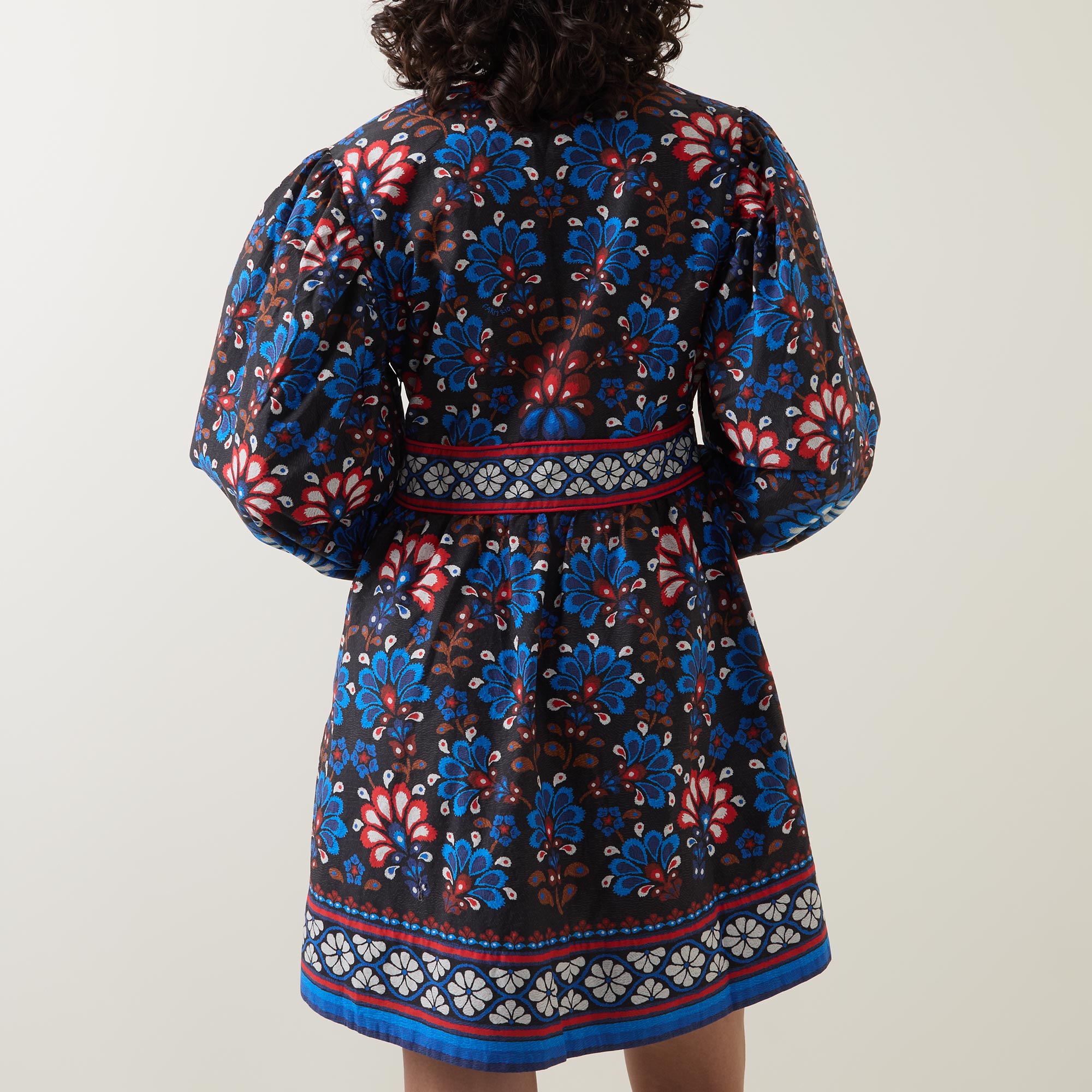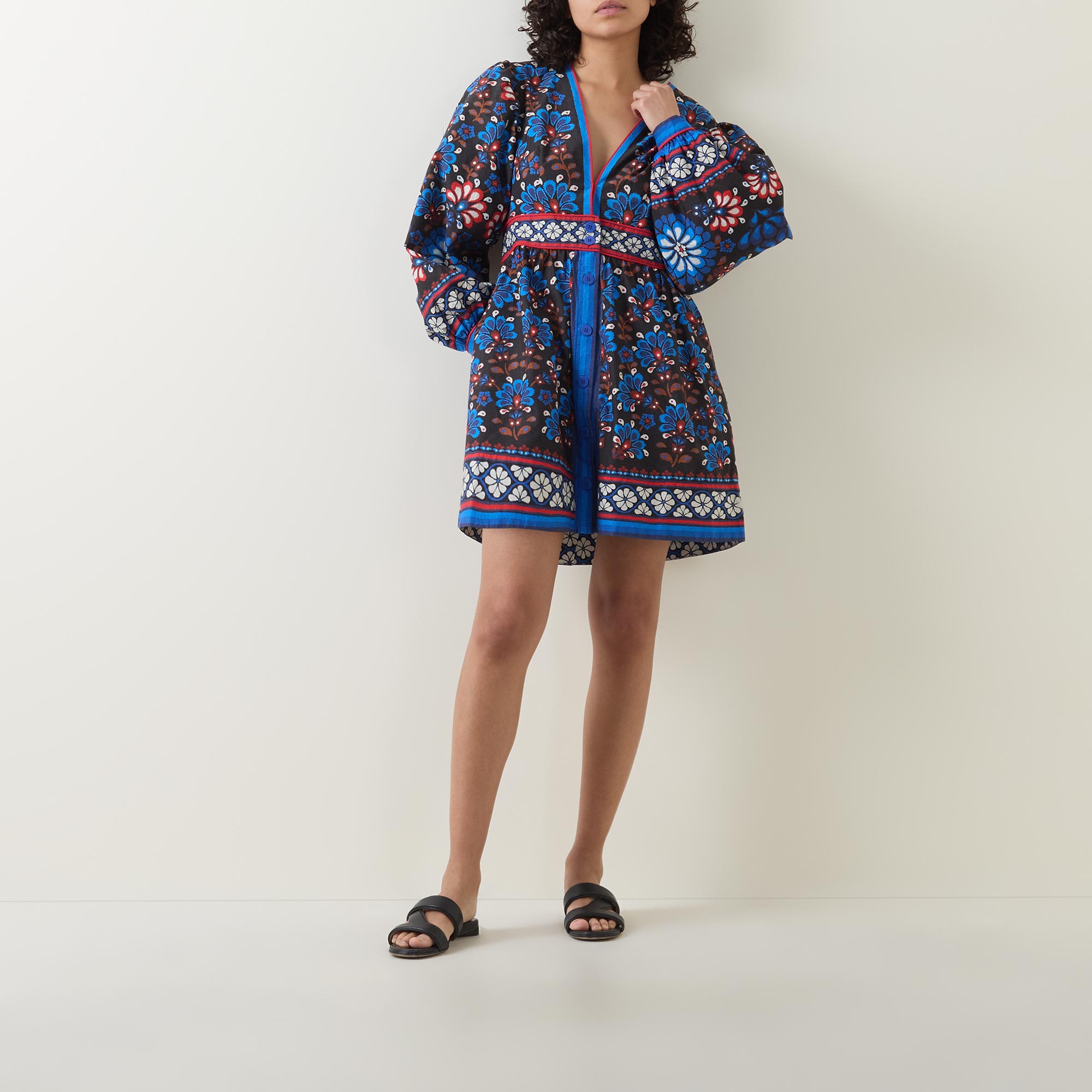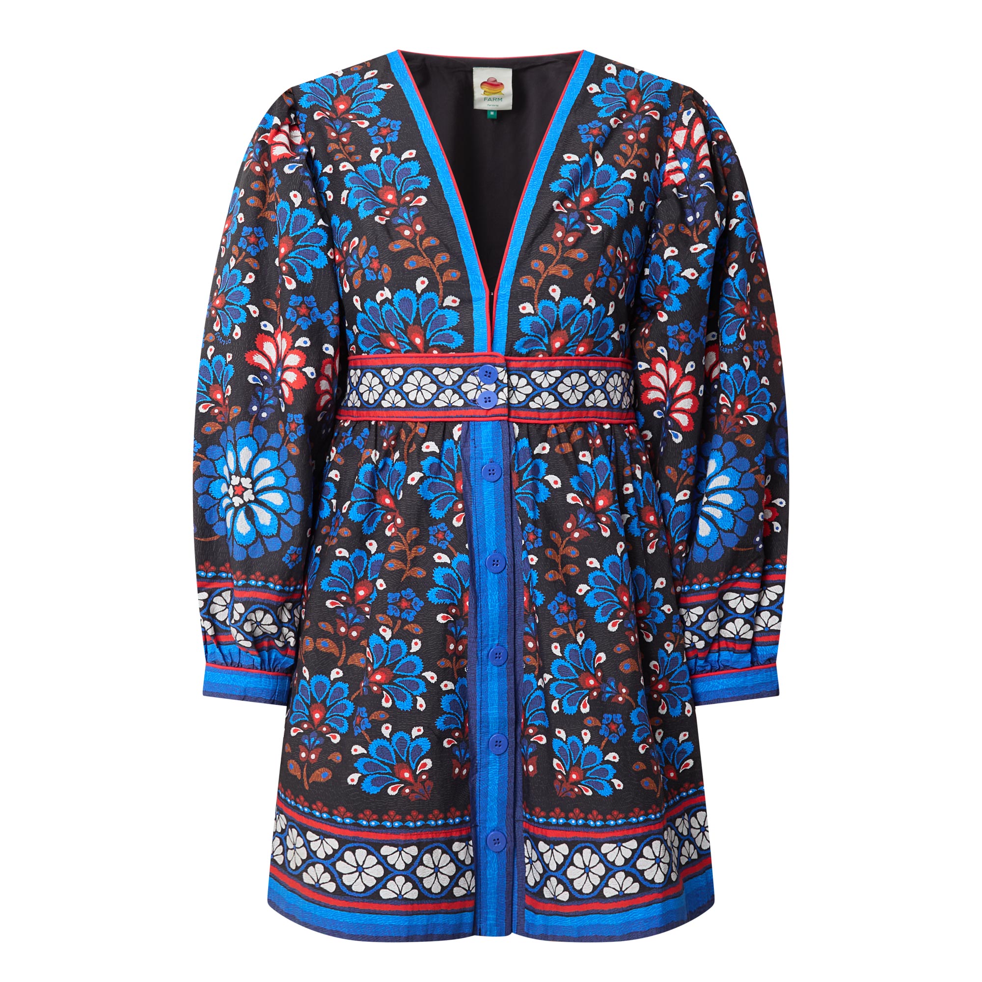 • V-neckline, long puff sleeves, buttoned cuffs, fitted waistband, concealed side zip fastening, front placket, flared skirt, two side entry pockets, straight hem, playful print throughout