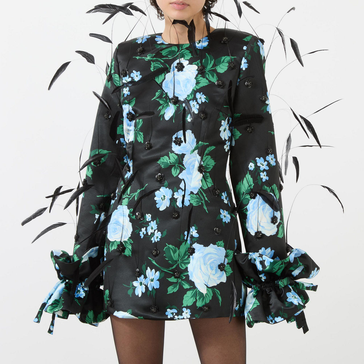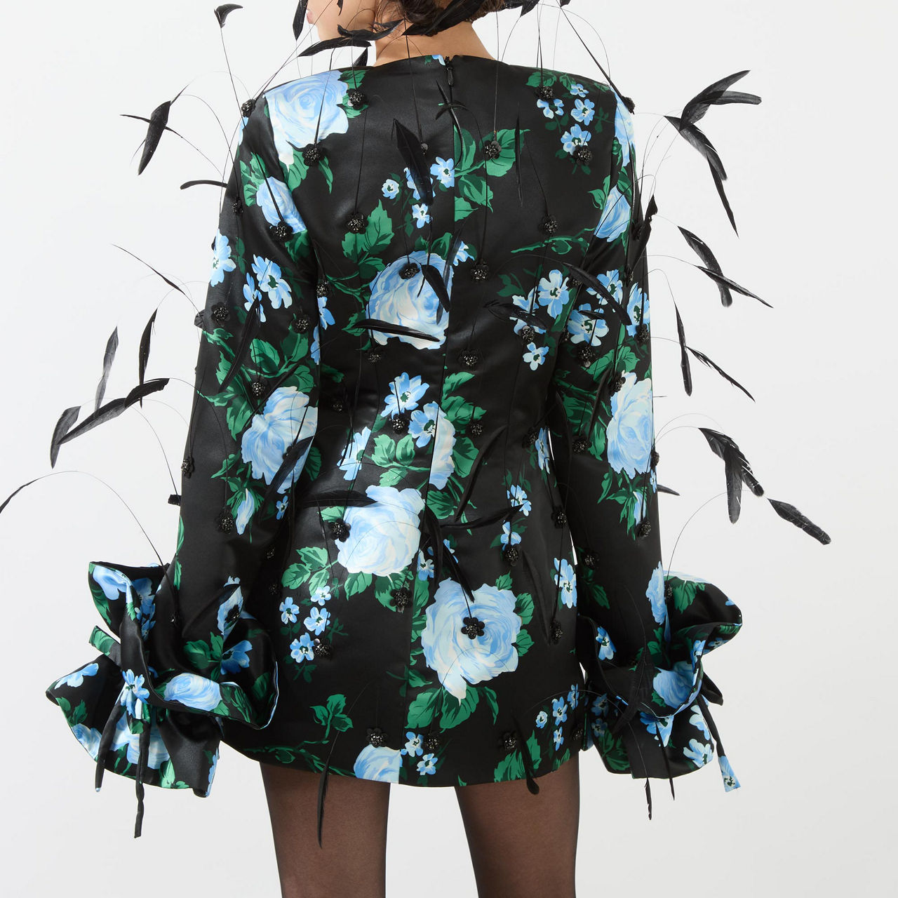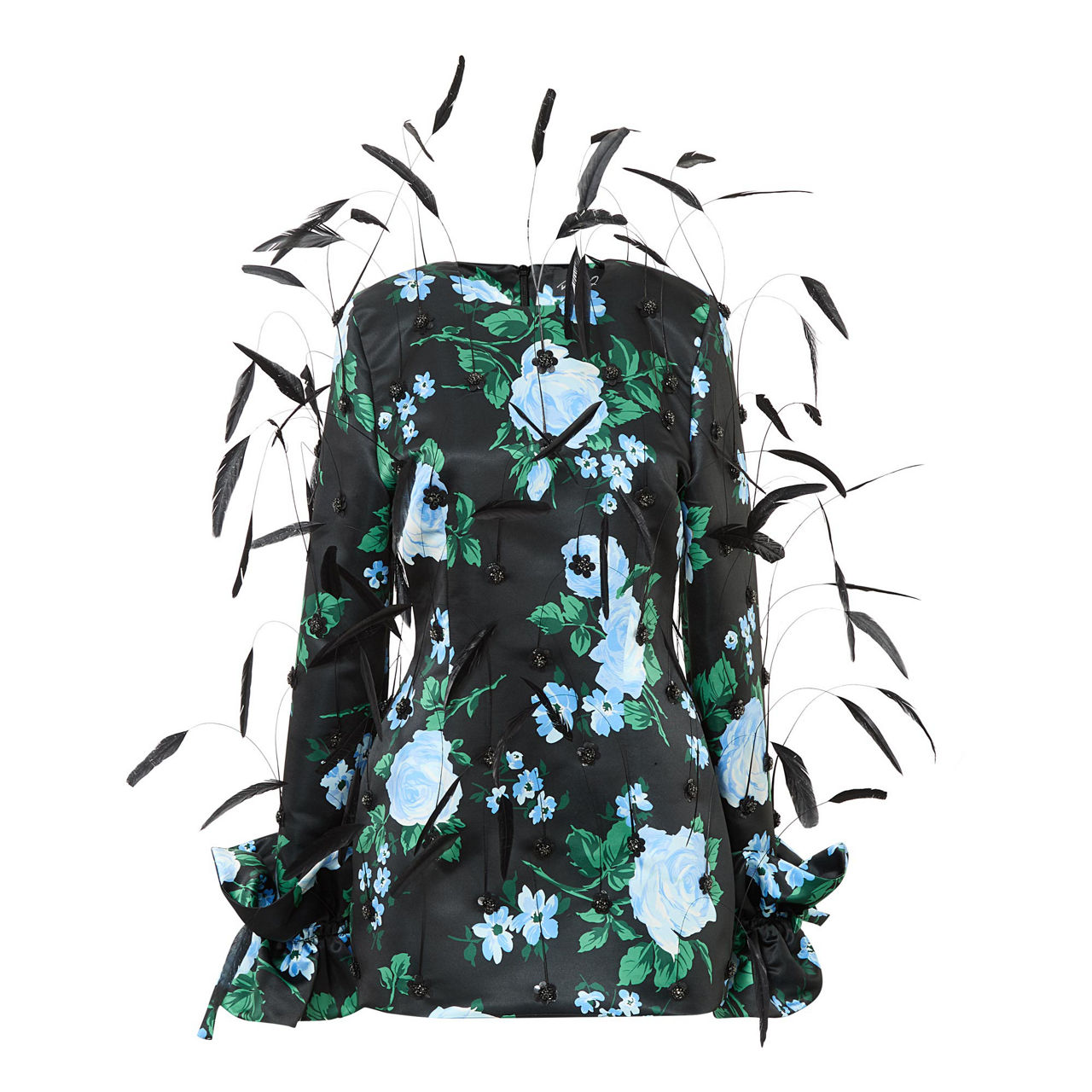 - Round neckline, long sleeves, oversized tie-fastening ruffle cuffs, floral pattern, sequin details, feather embellishments, back zip-fastening closure, smooth fabric