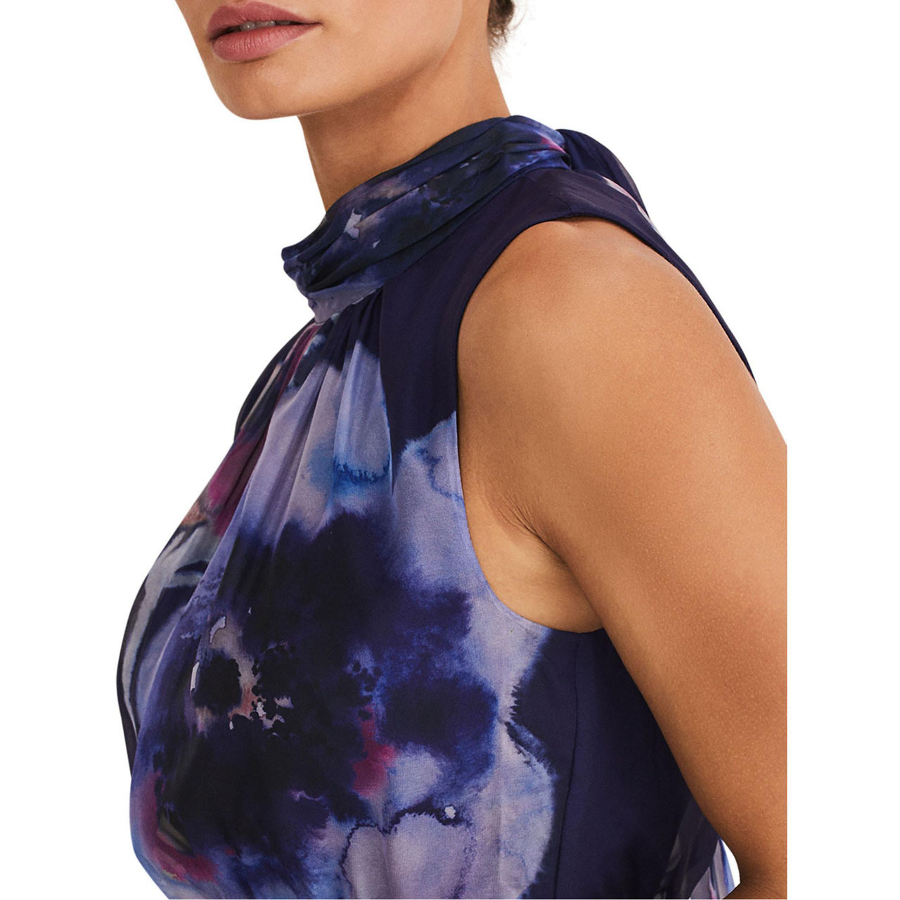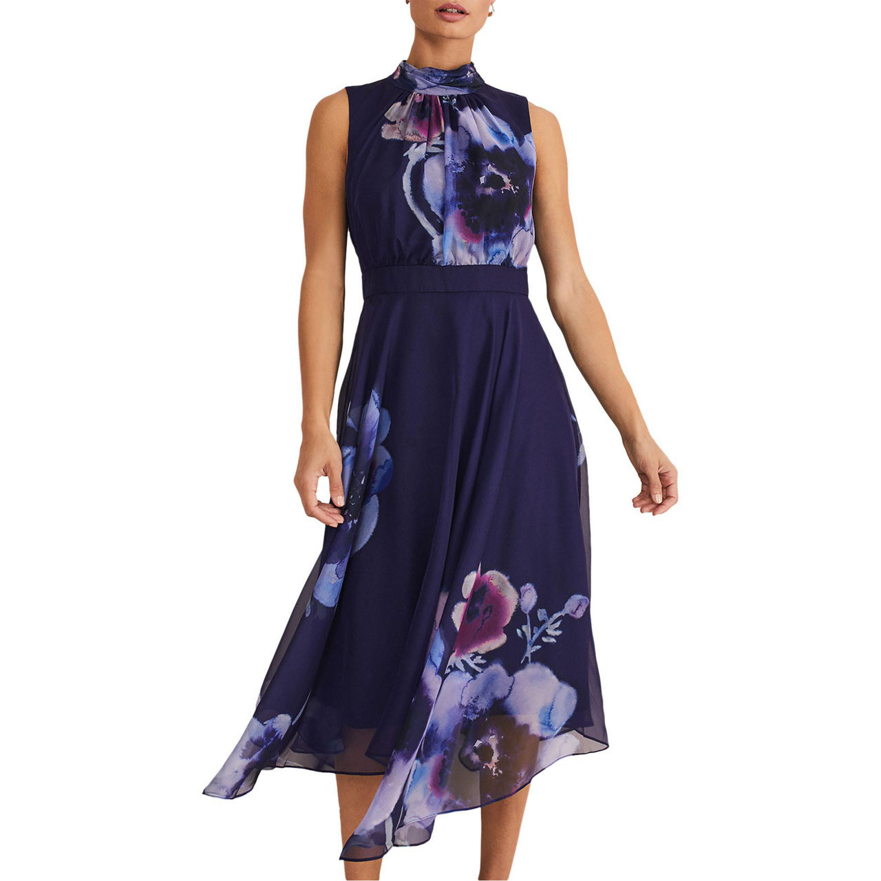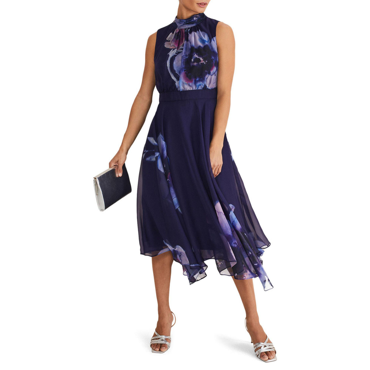 A new and contemporary style for Phase Eight this season. The Lucinda dress showcases a stunning large floral print in a deep purple colour palette. Cut to a high neck with that falls to a flowing high low skirt, simply style it with heels and a matching clutch.