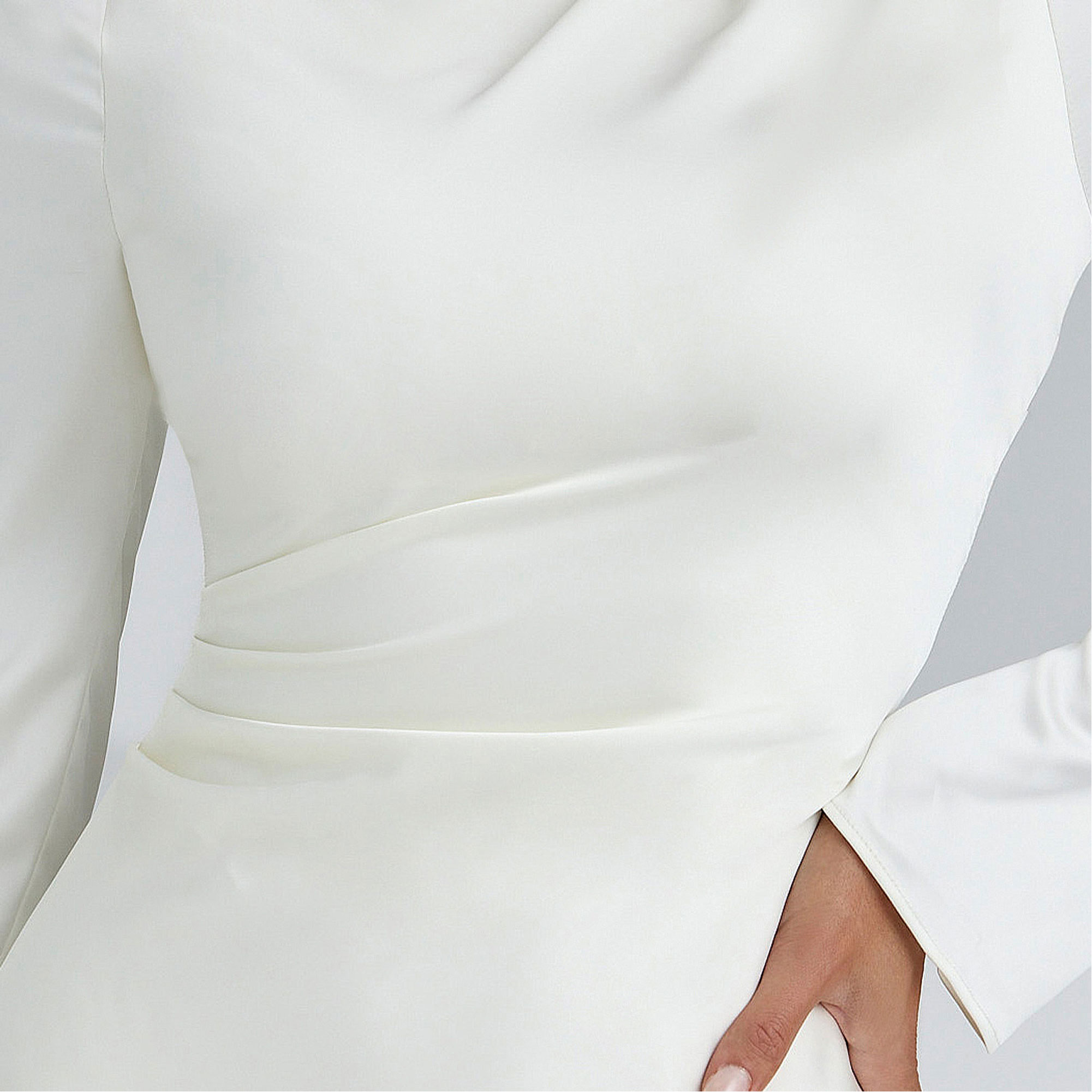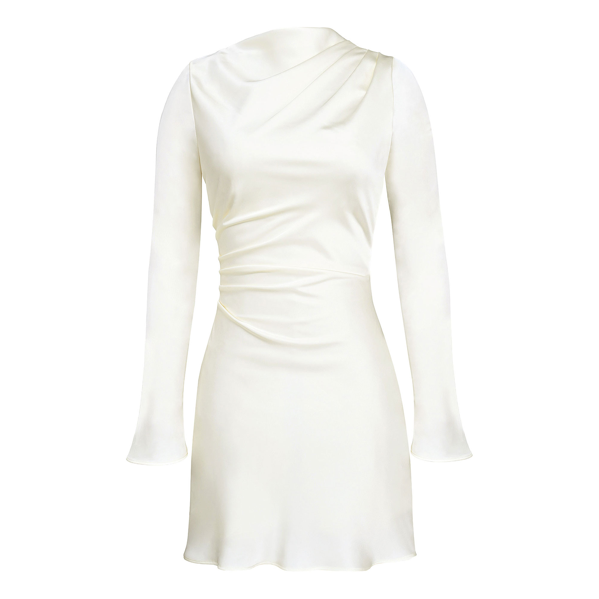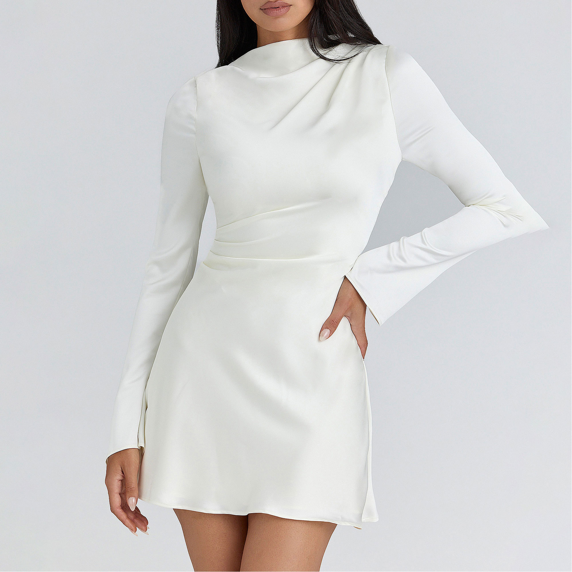 - Silky satin fabric with a hint of stretch, mini length, long fluted sleeves, high neck, zip fastening at the back, fully lined