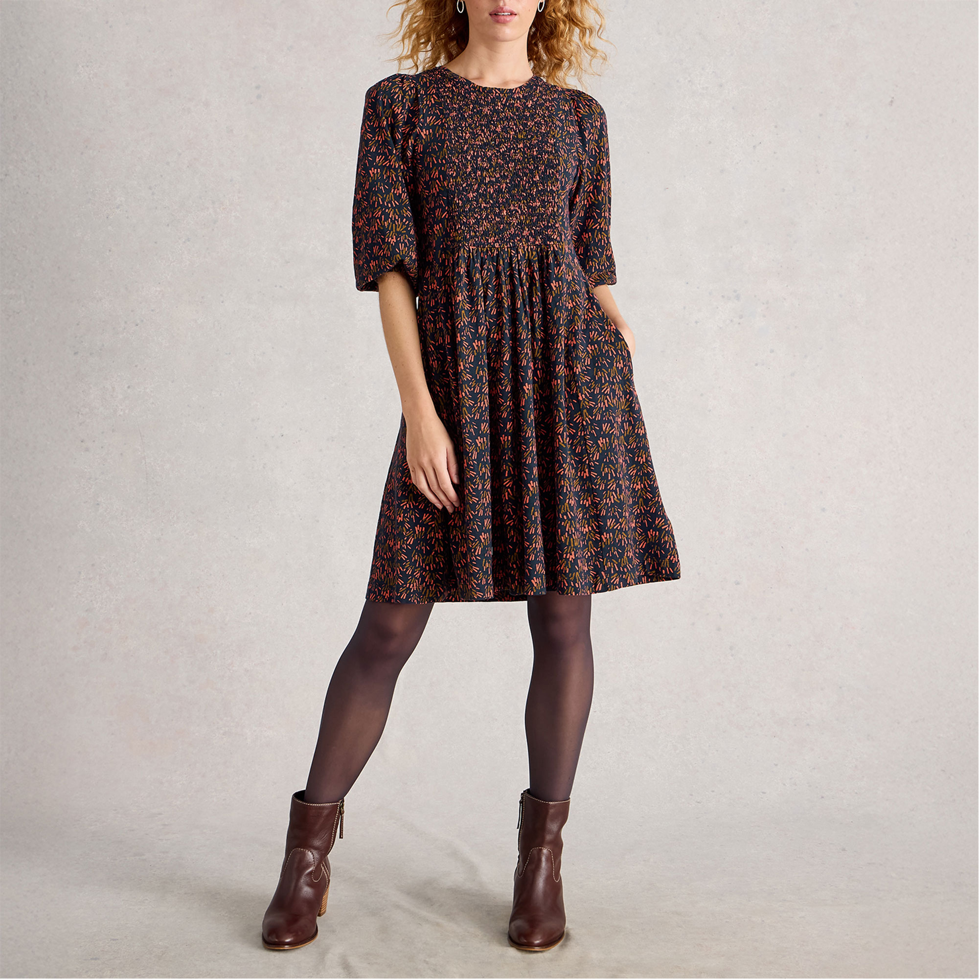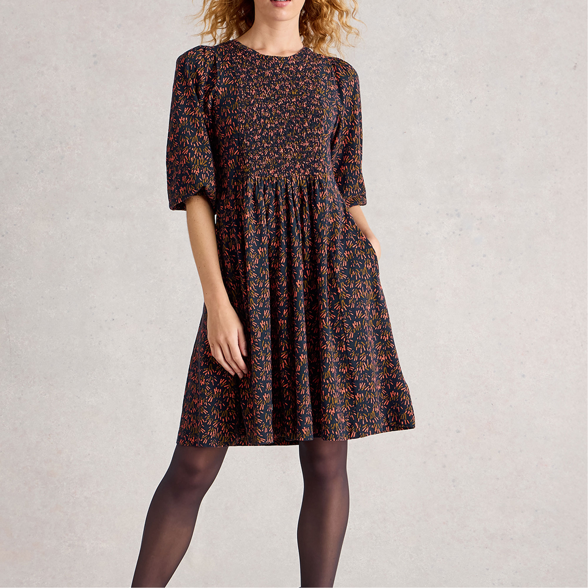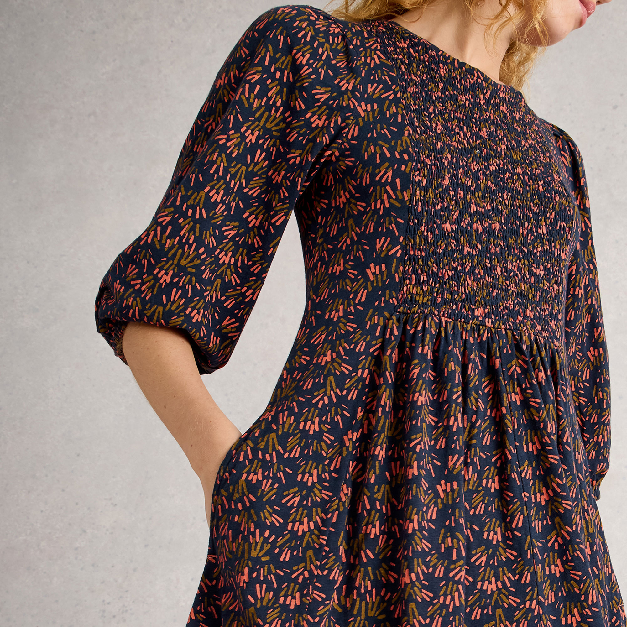 - Ruched elasticated front, shorter length, fuller sleeves, printed pattern
