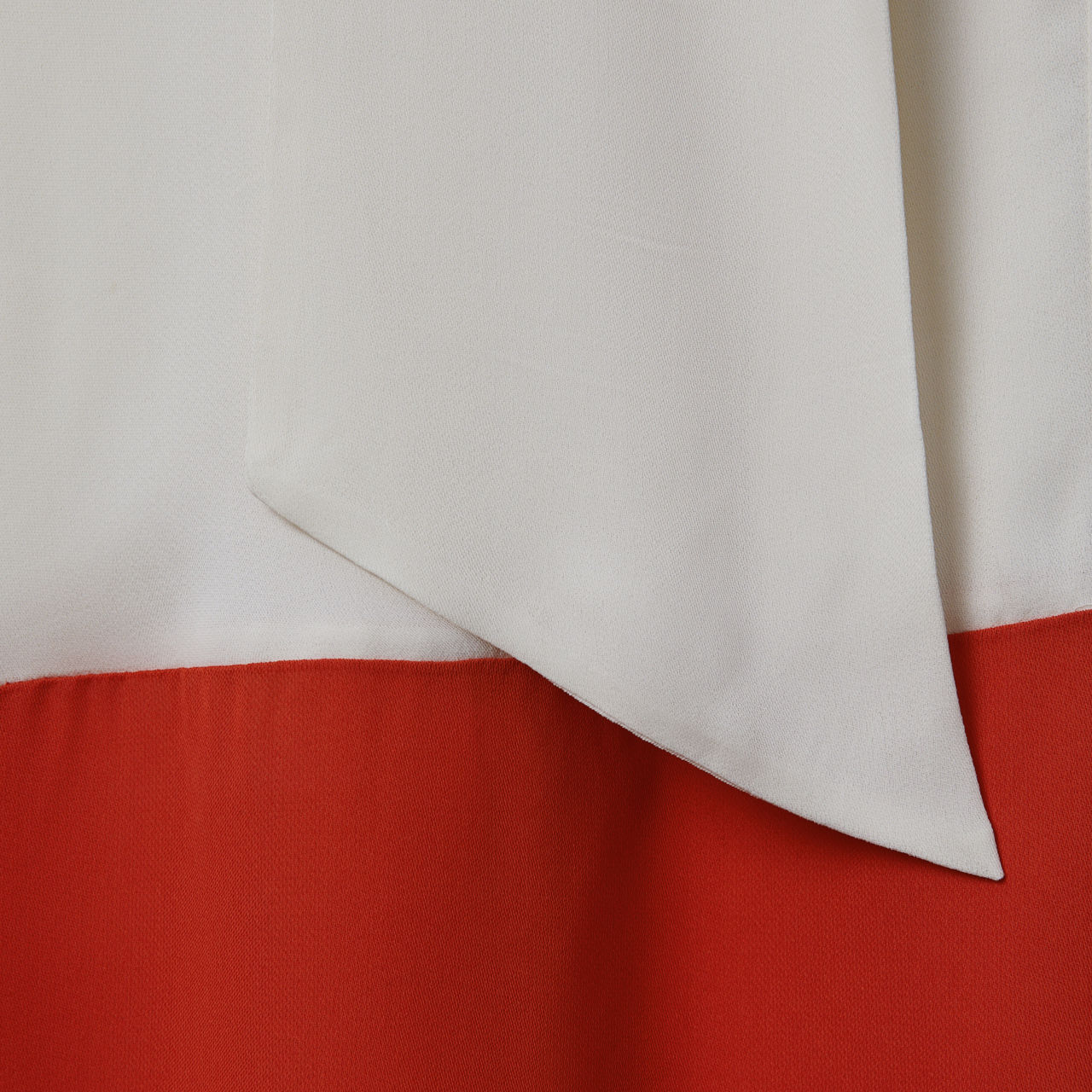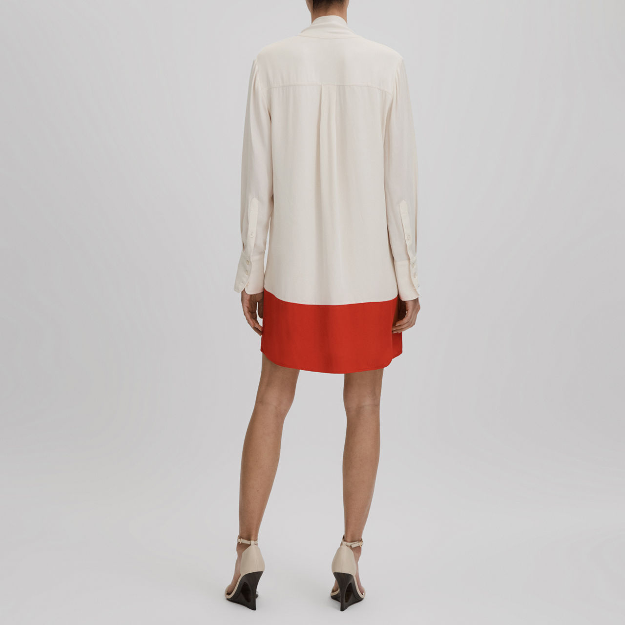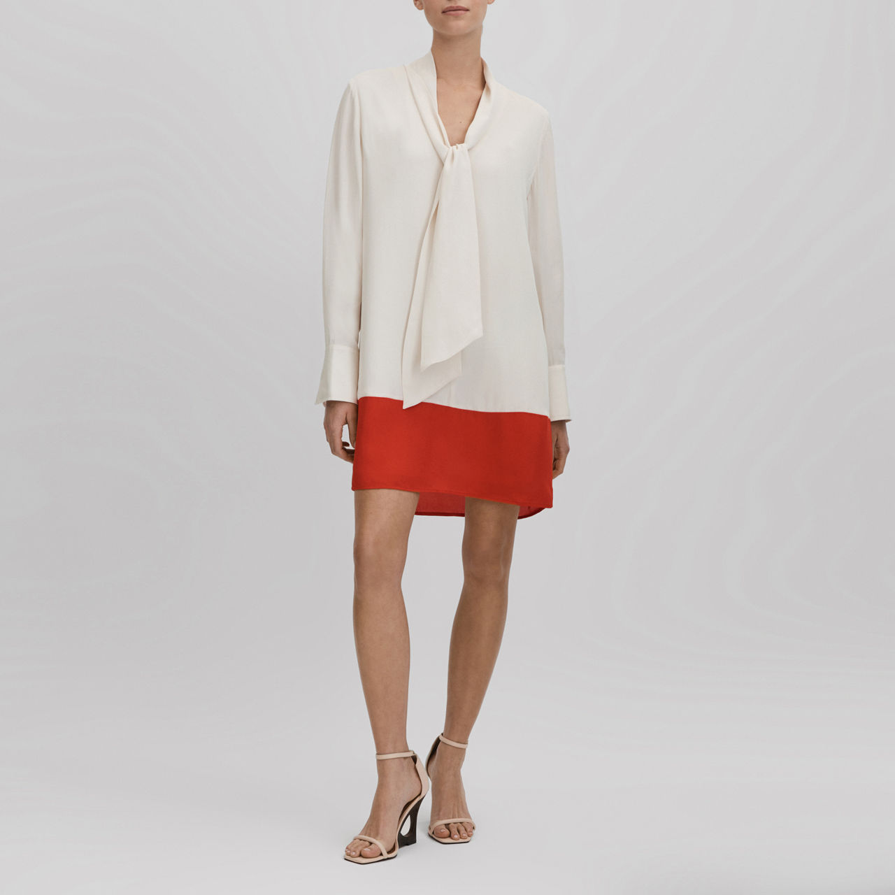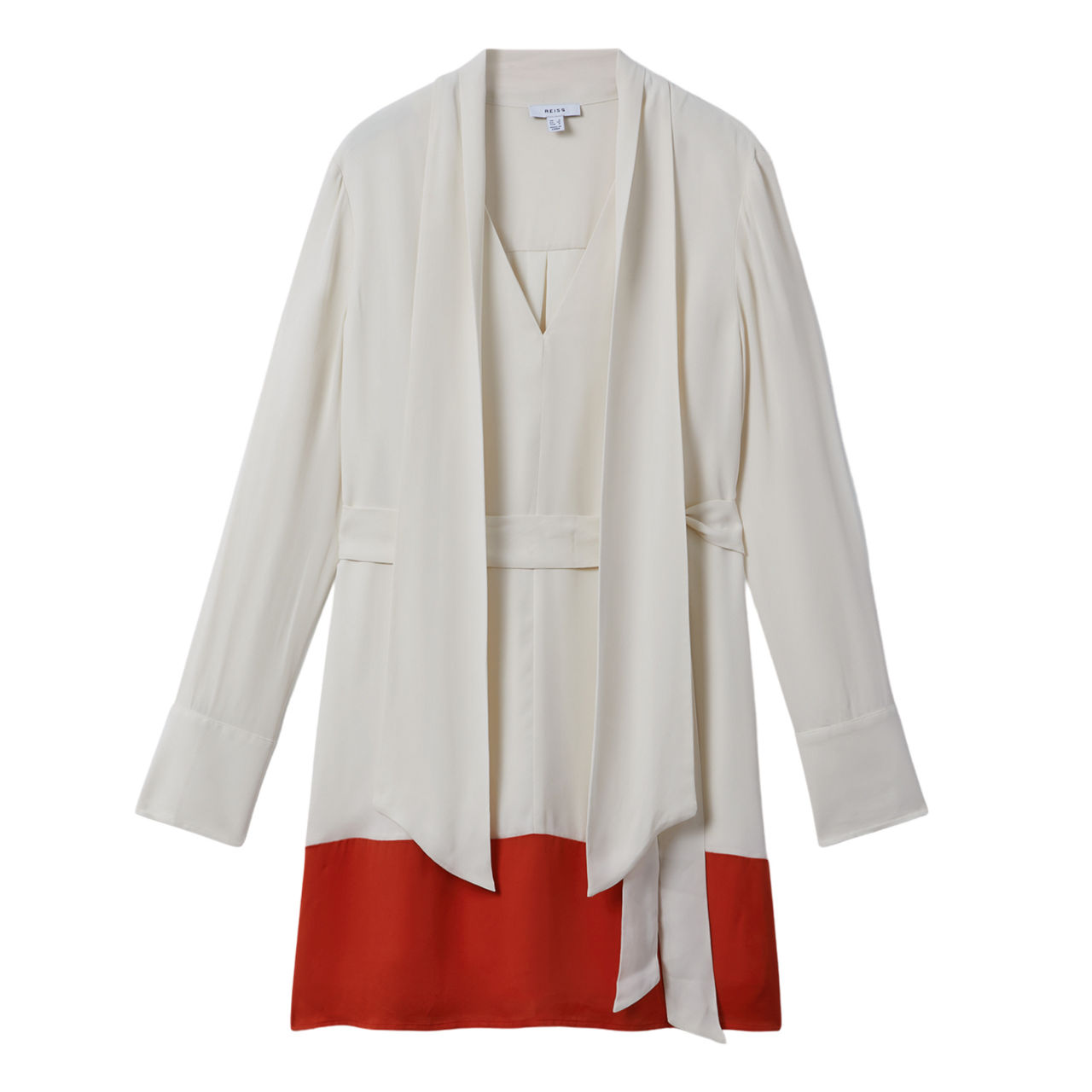 - Tie neck, V-neckline, long cuffed sleeves, colourblock detail to hem, tie belt, shift silhouette