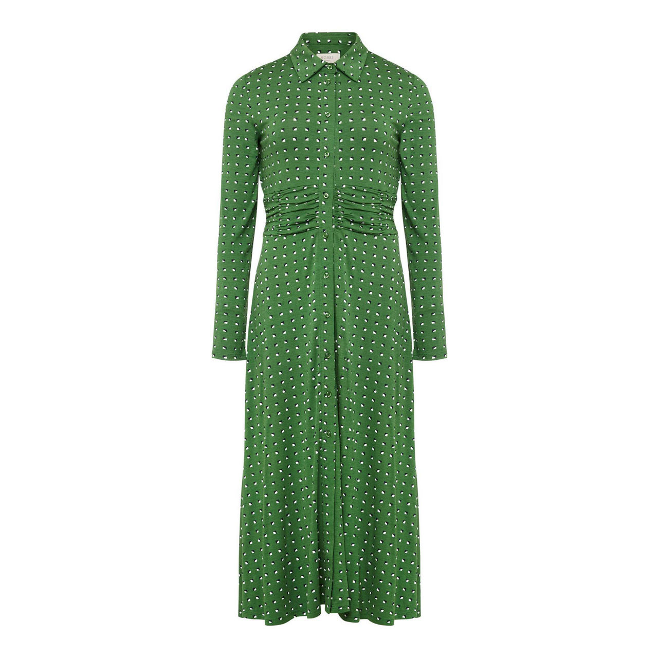 - Midi, collared neckline, long sleeves, gathered waist, button fastening, printed