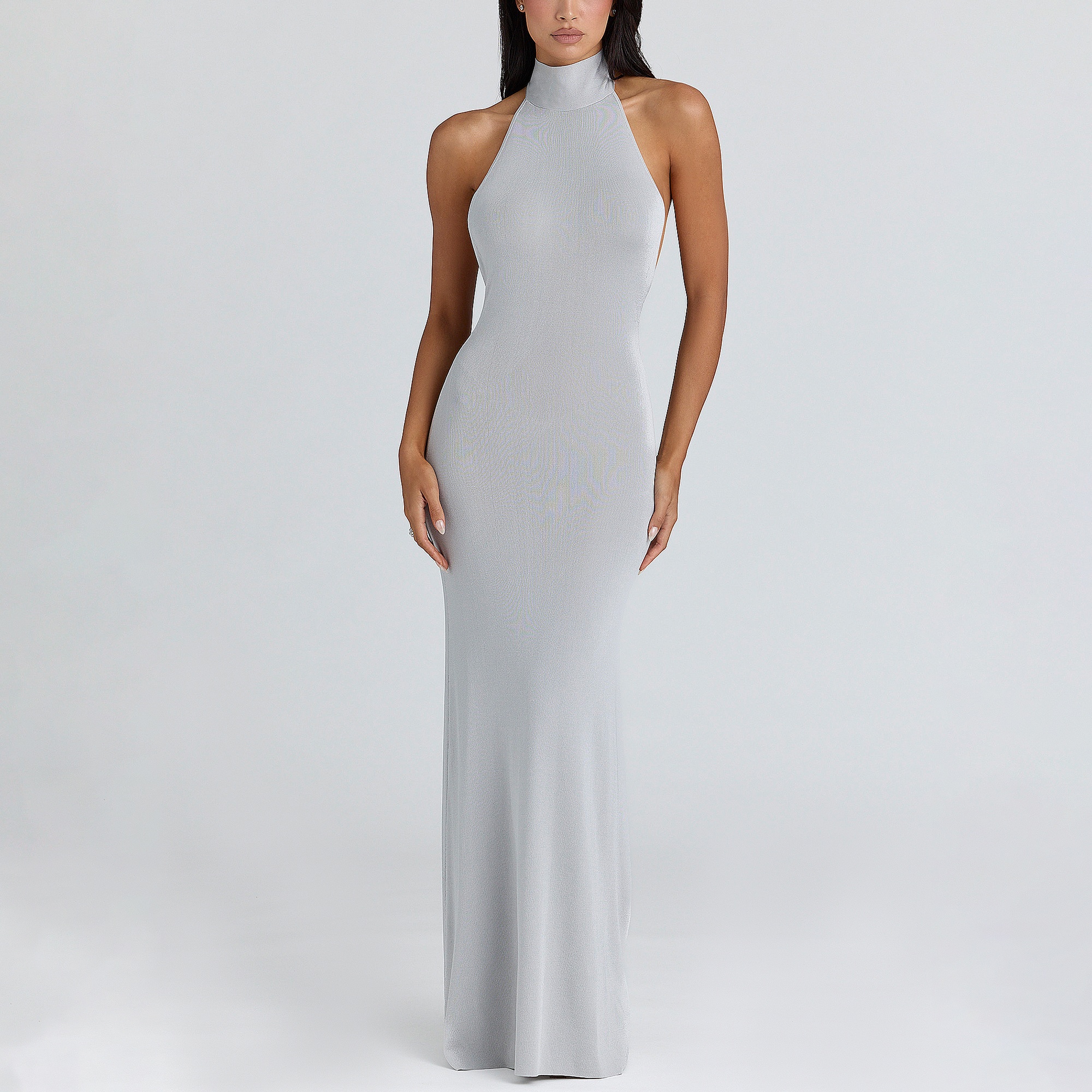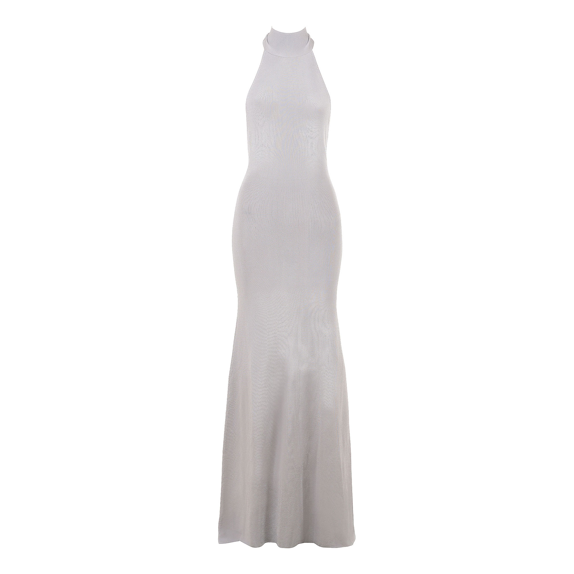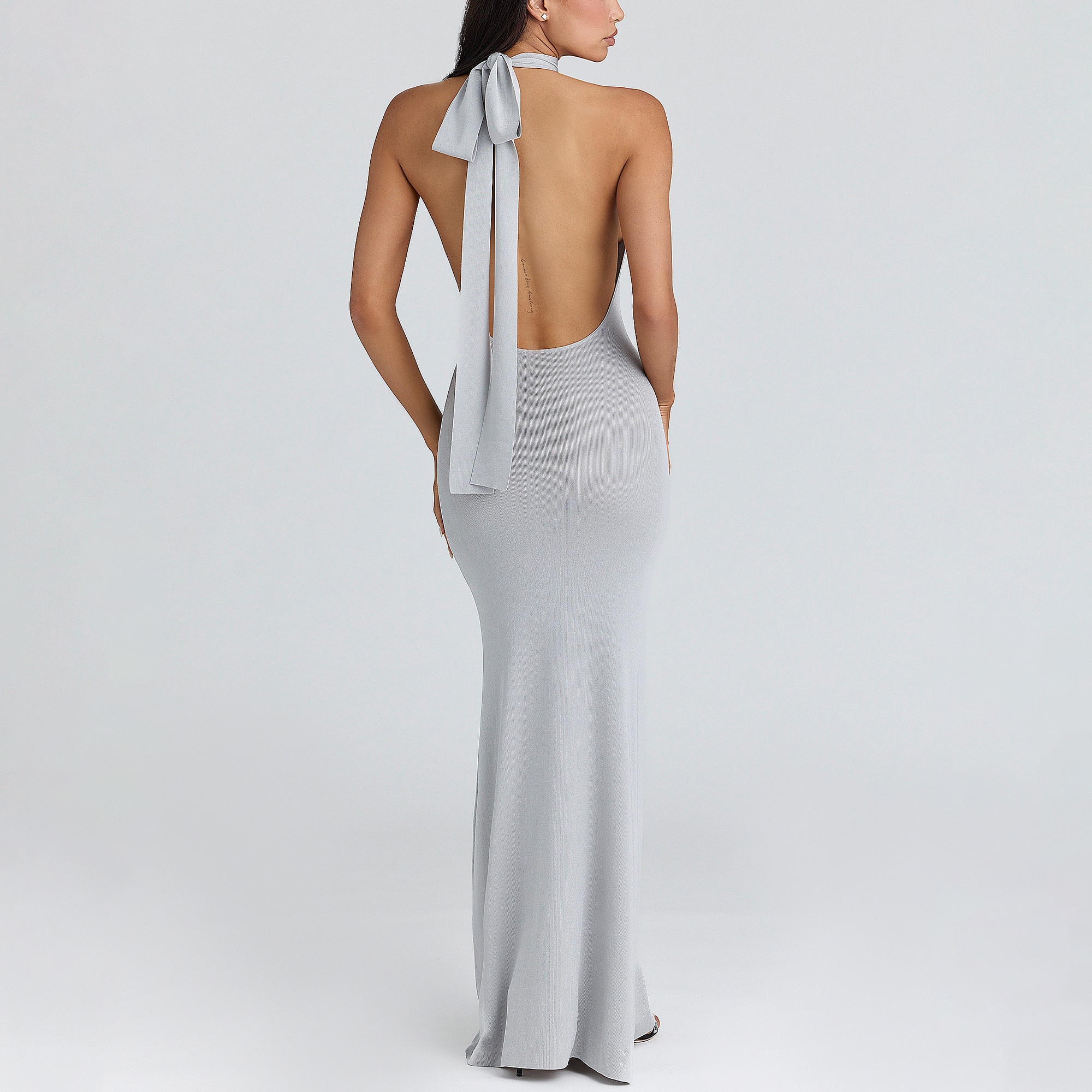 - Knitted style, high halter neckline, extra-long bow detailing, maxi silhouette, low cut back