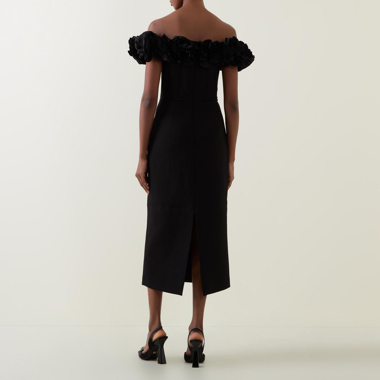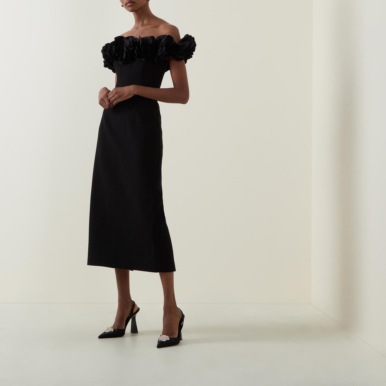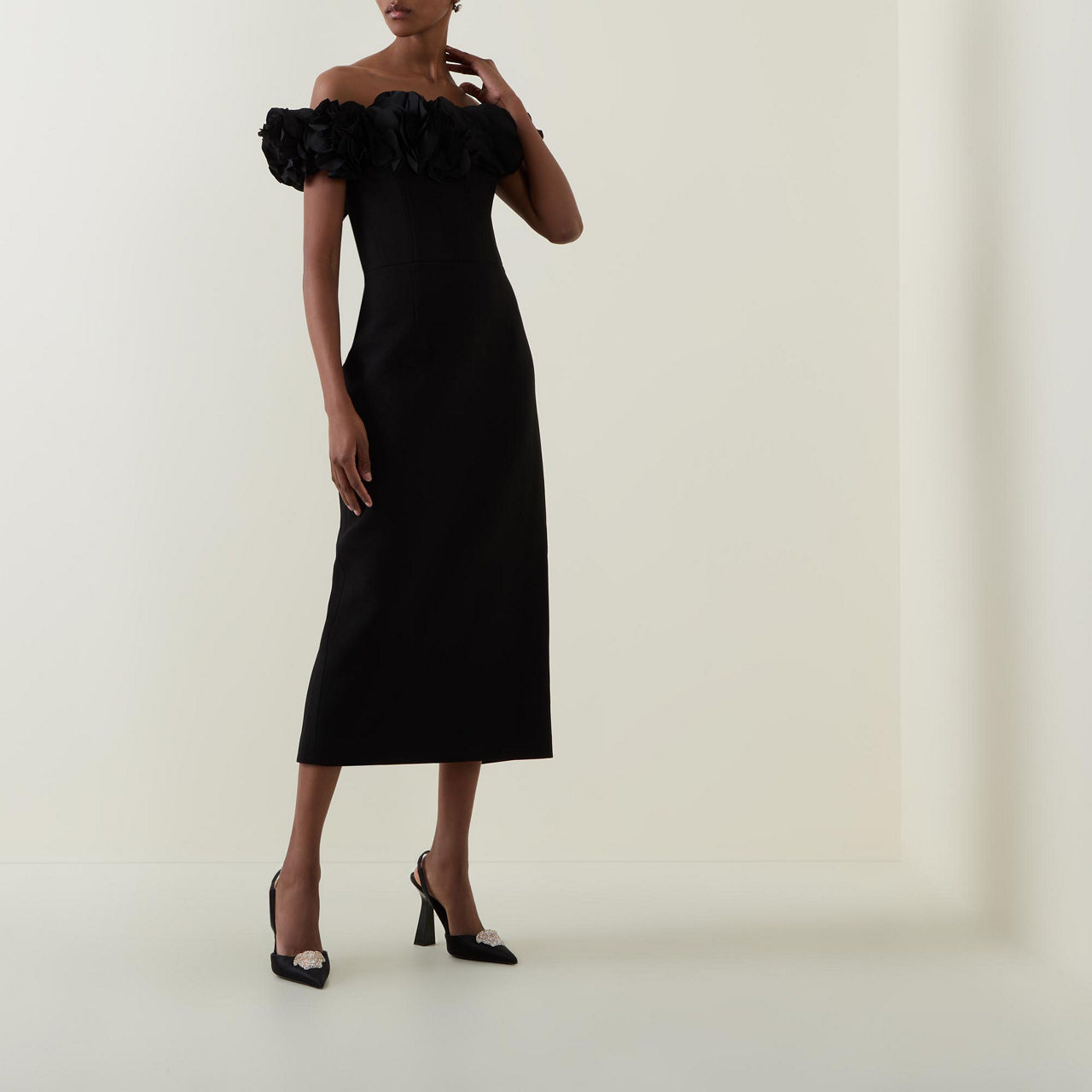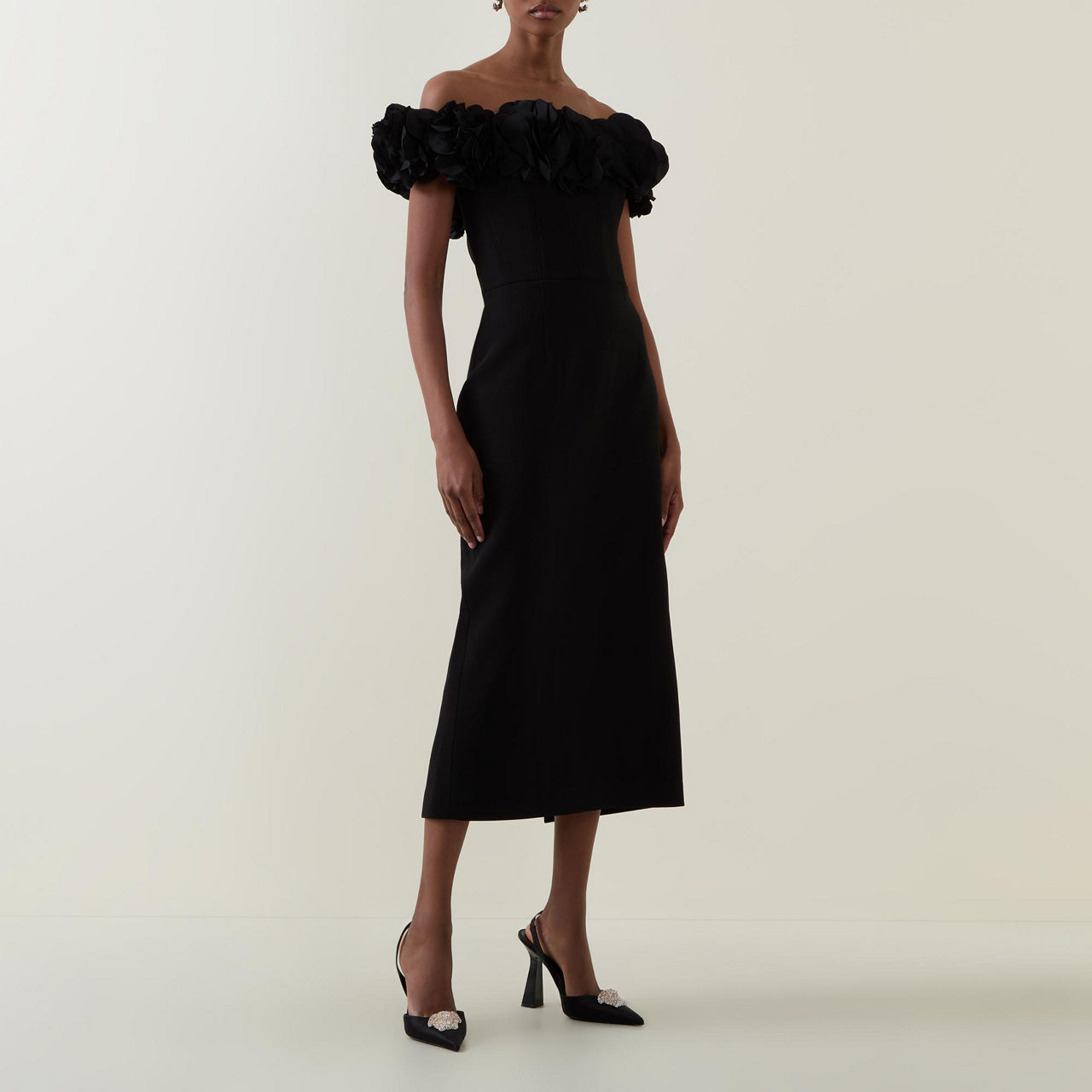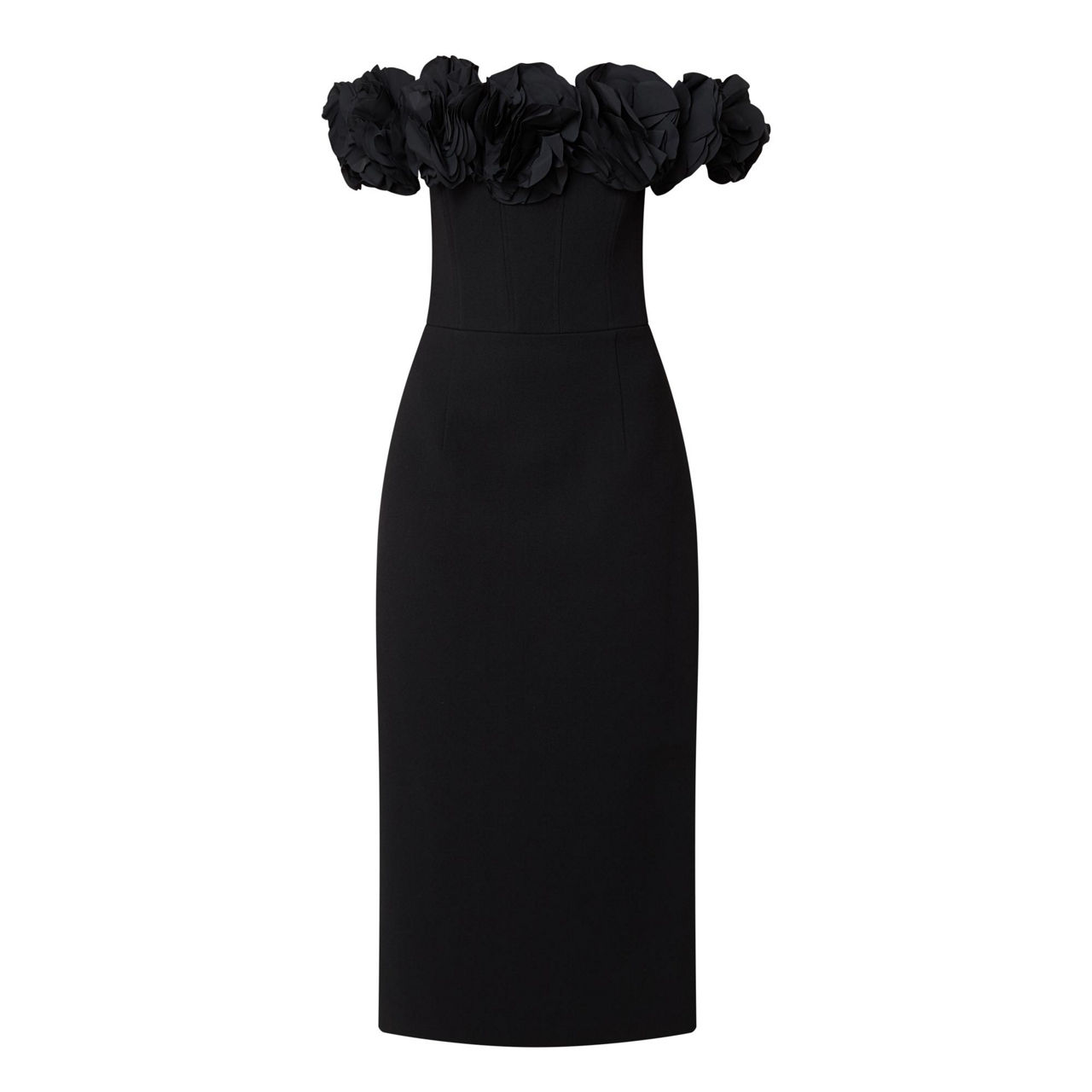 - Floral taffeta shoulder, boned bodice, pencil fit, cinched waist, zip fastening, midi-length