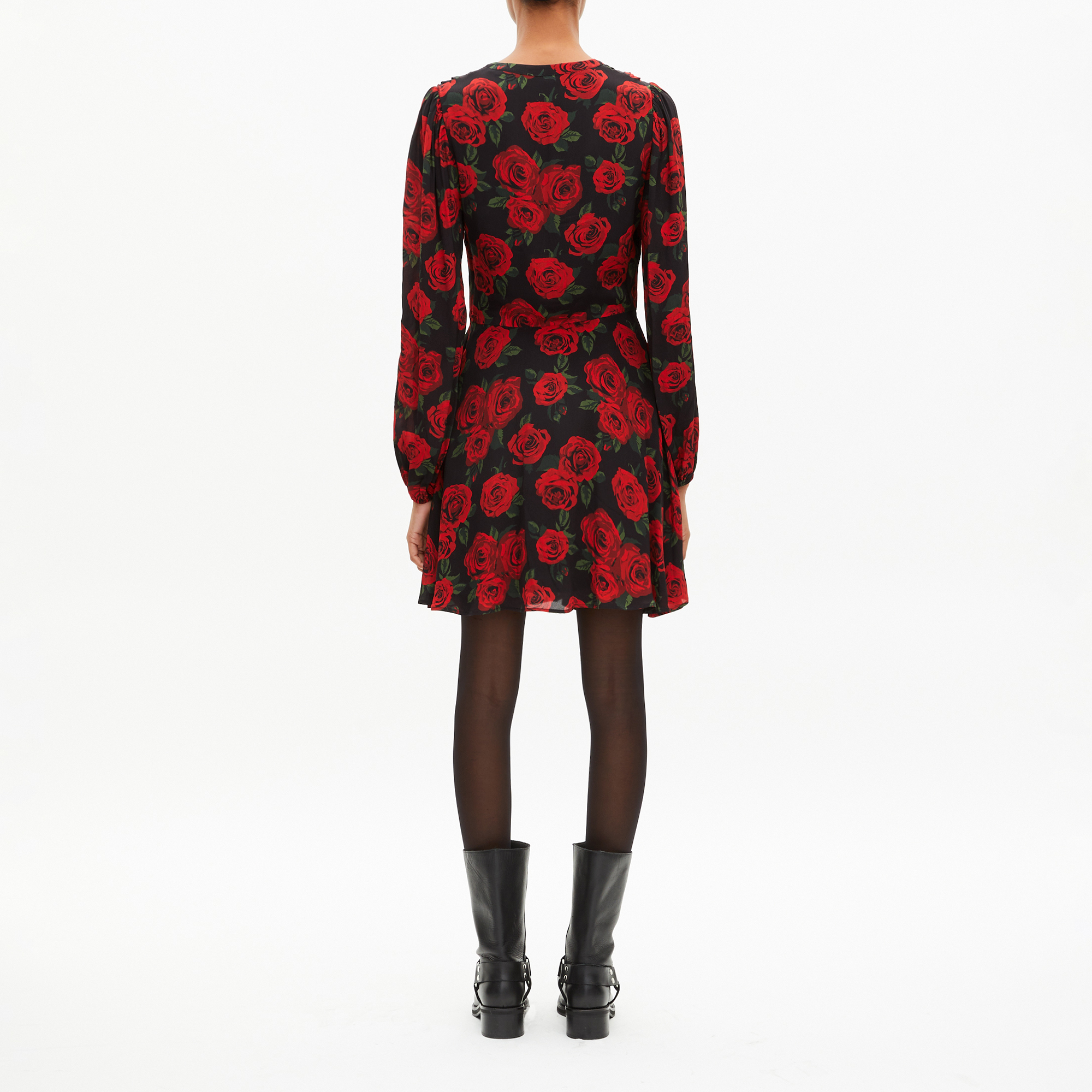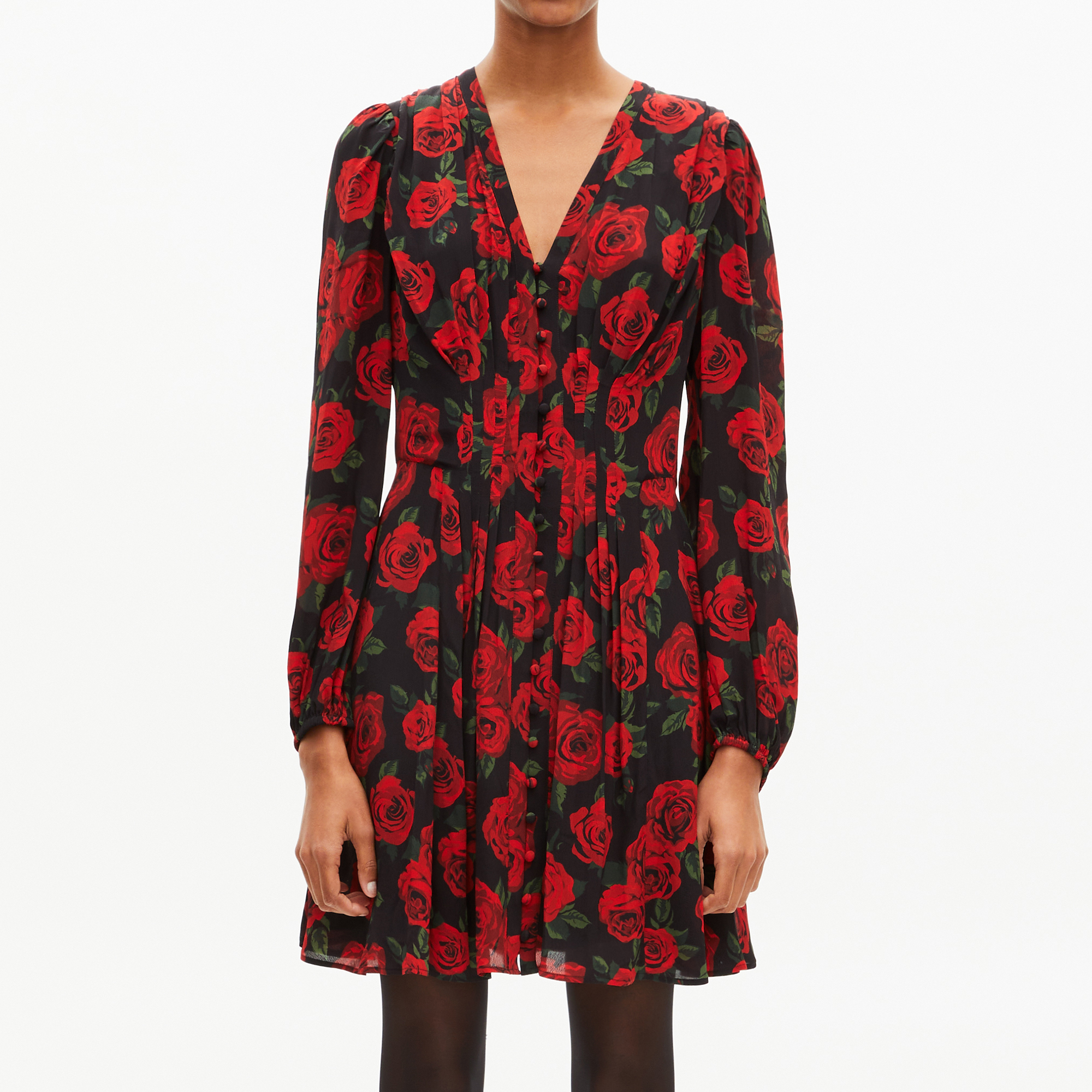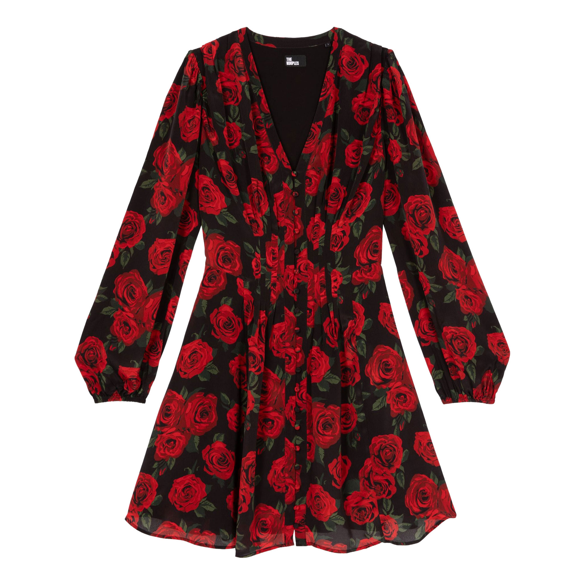 - V-neckline, long sleeves, elasticated cuffs, fitted waist, flared cut, pleated detailing, covered button fastening, rose print, mini length