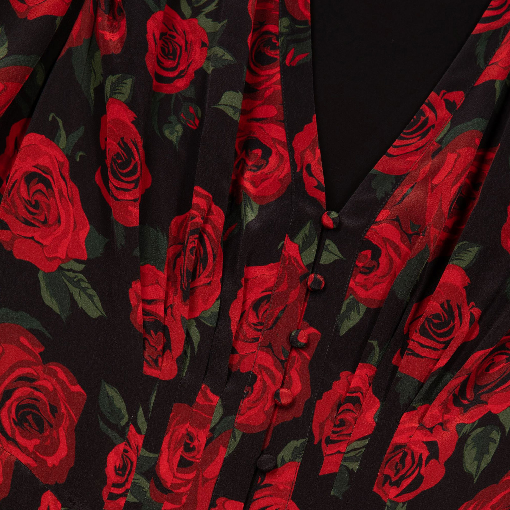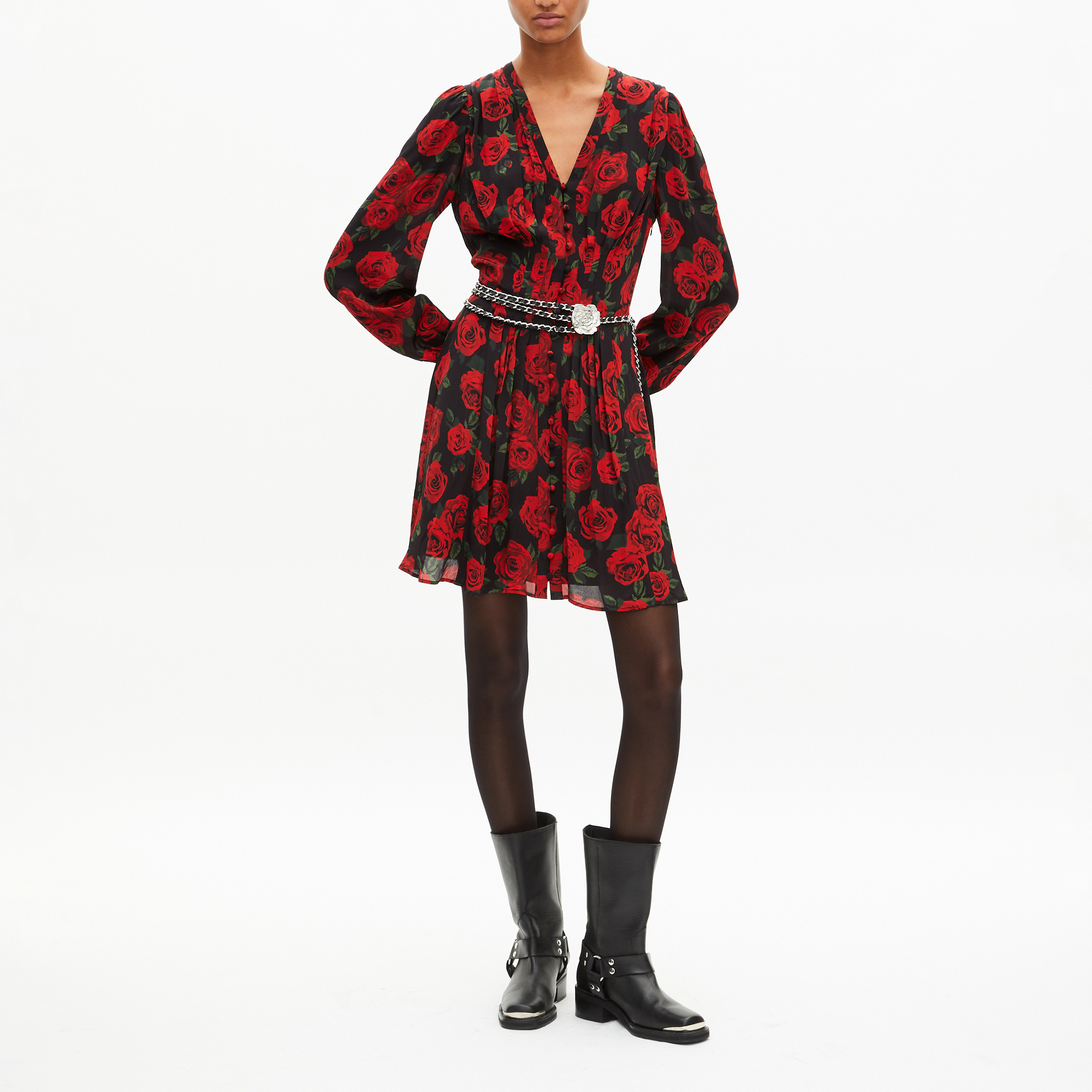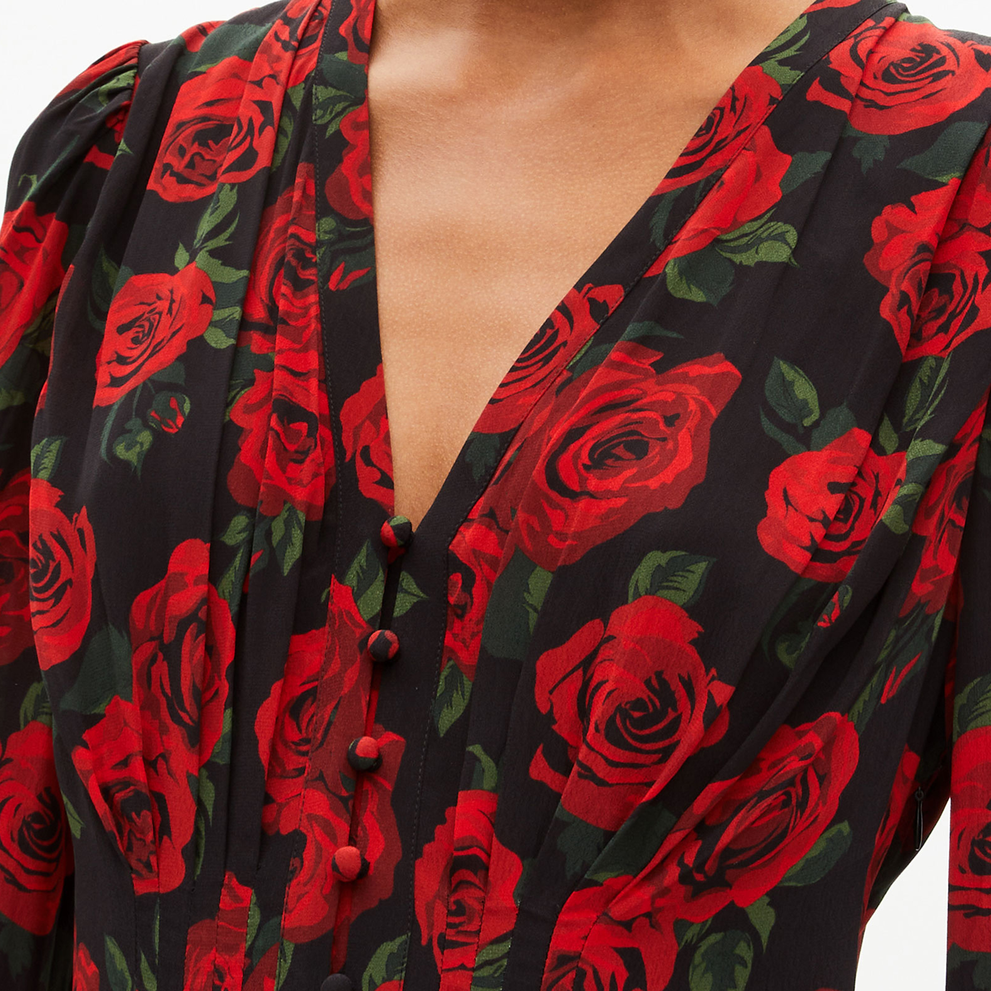 - V-neckline, long sleeves, elasticated cuffs, fitted waist, flared cut, pleated detailing, covered button fastening, rose print, mini length