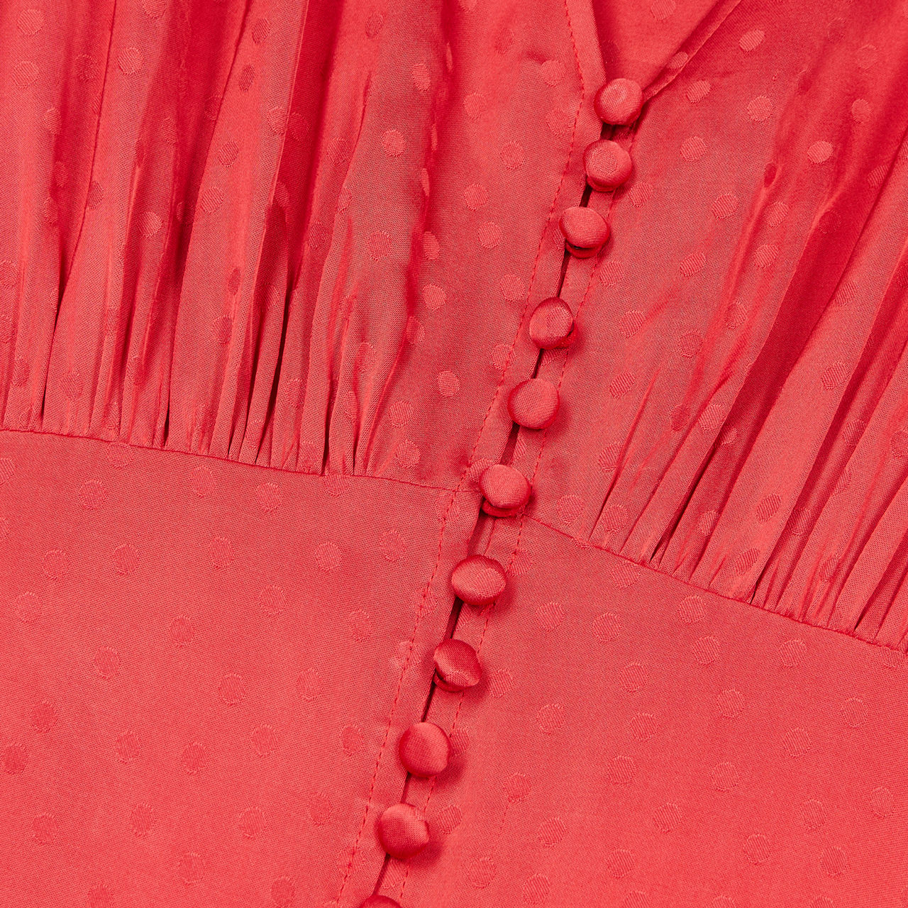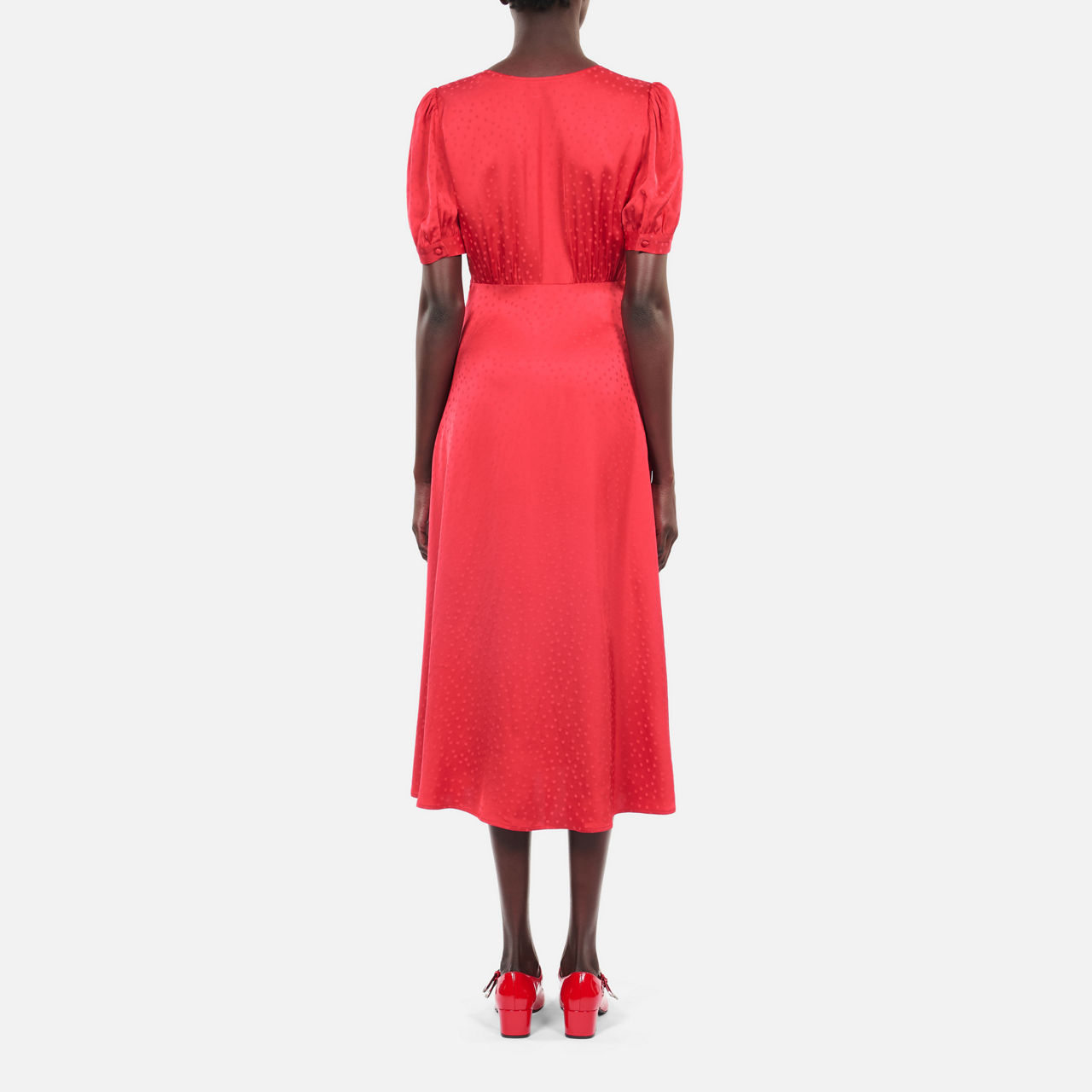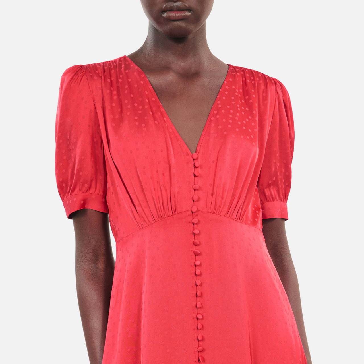- Jacquard polka-dot print, V-neckline, short sleeves, buttoned cuffs, fitted empire waist, front button fastening, fabric covered buttons, front slit detail, midi length