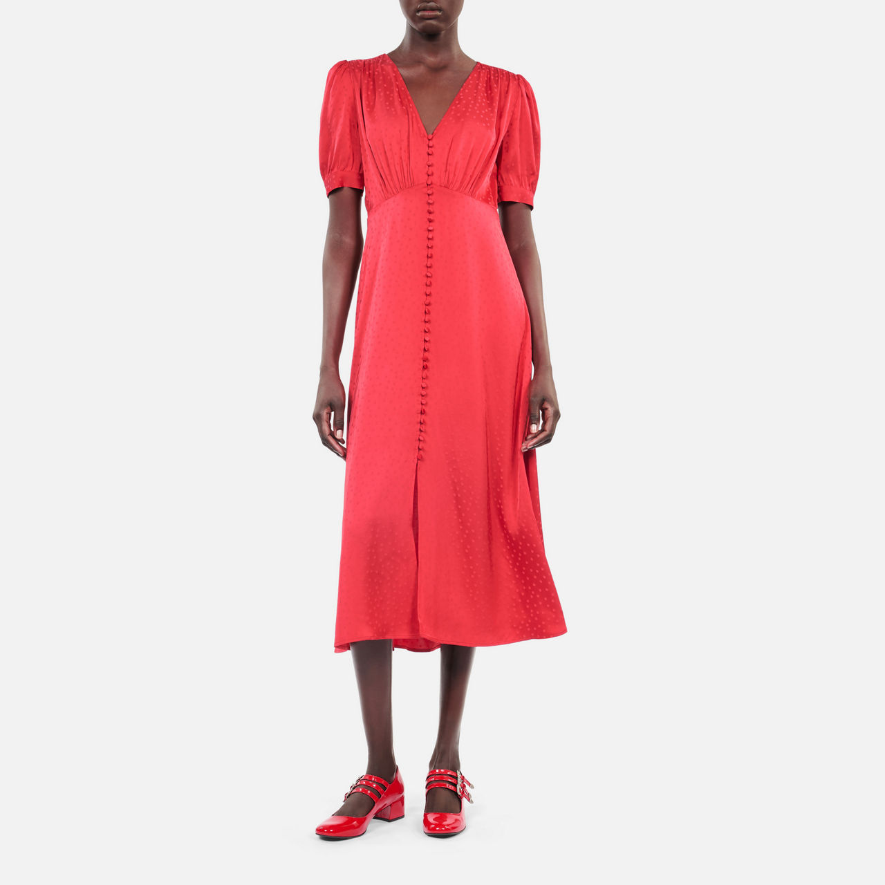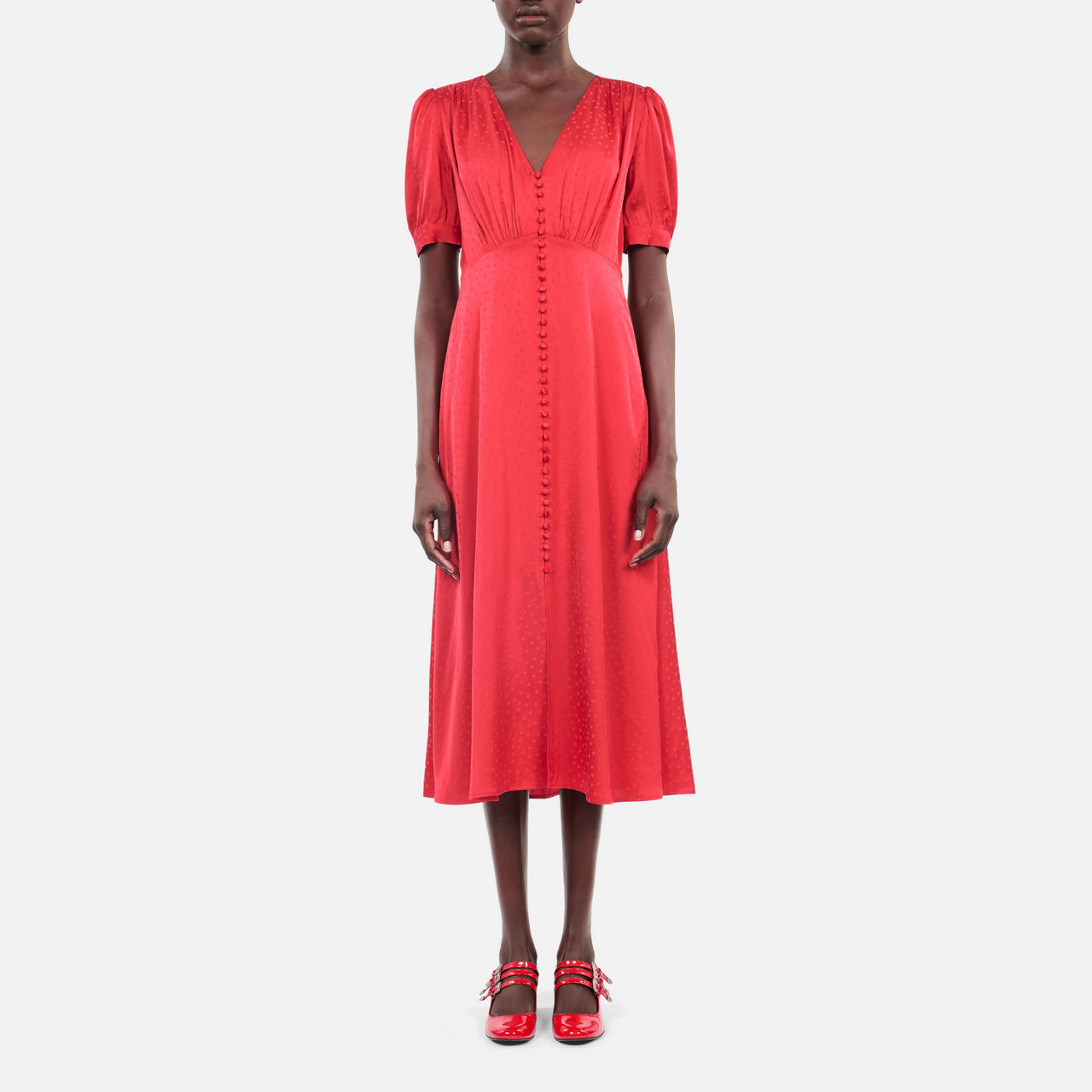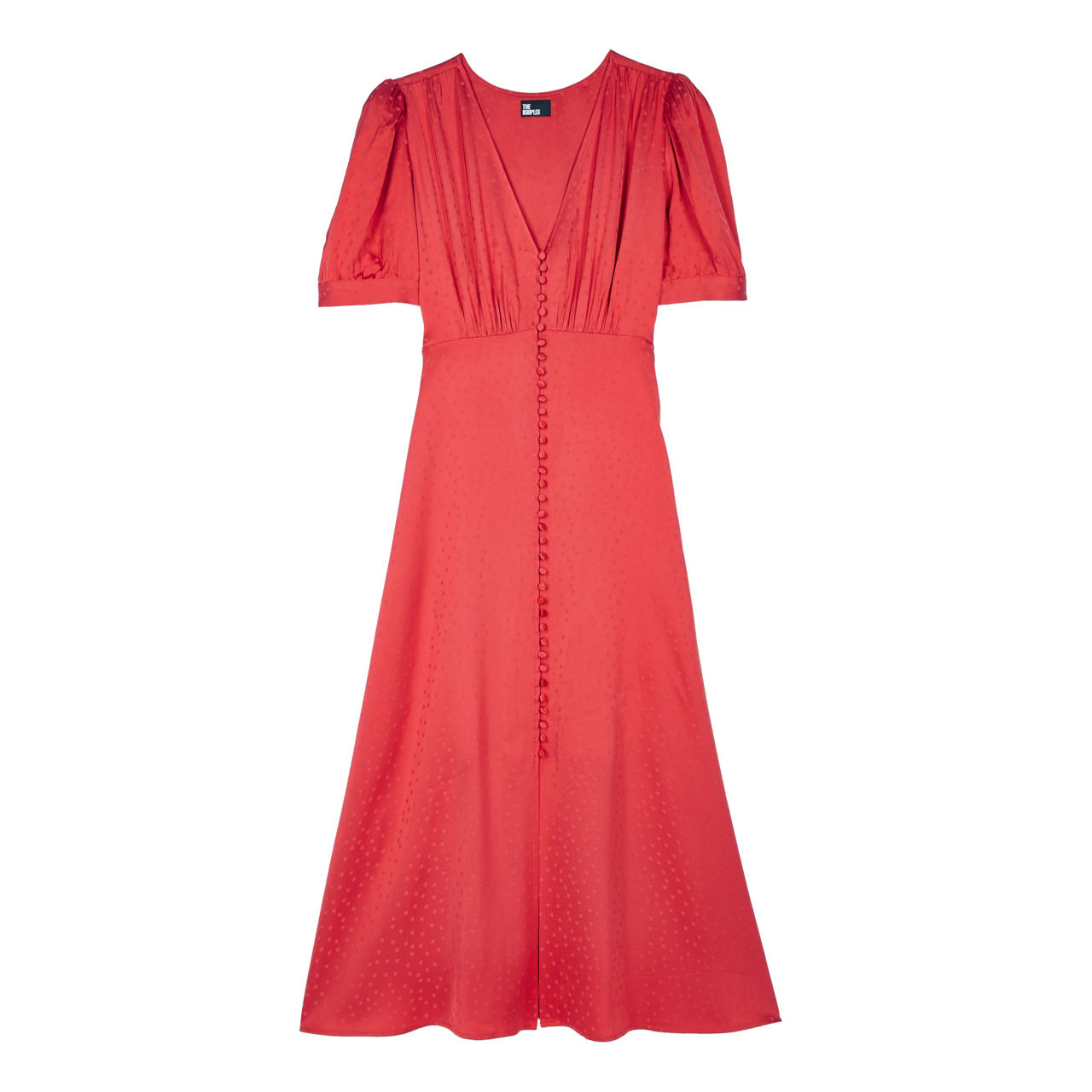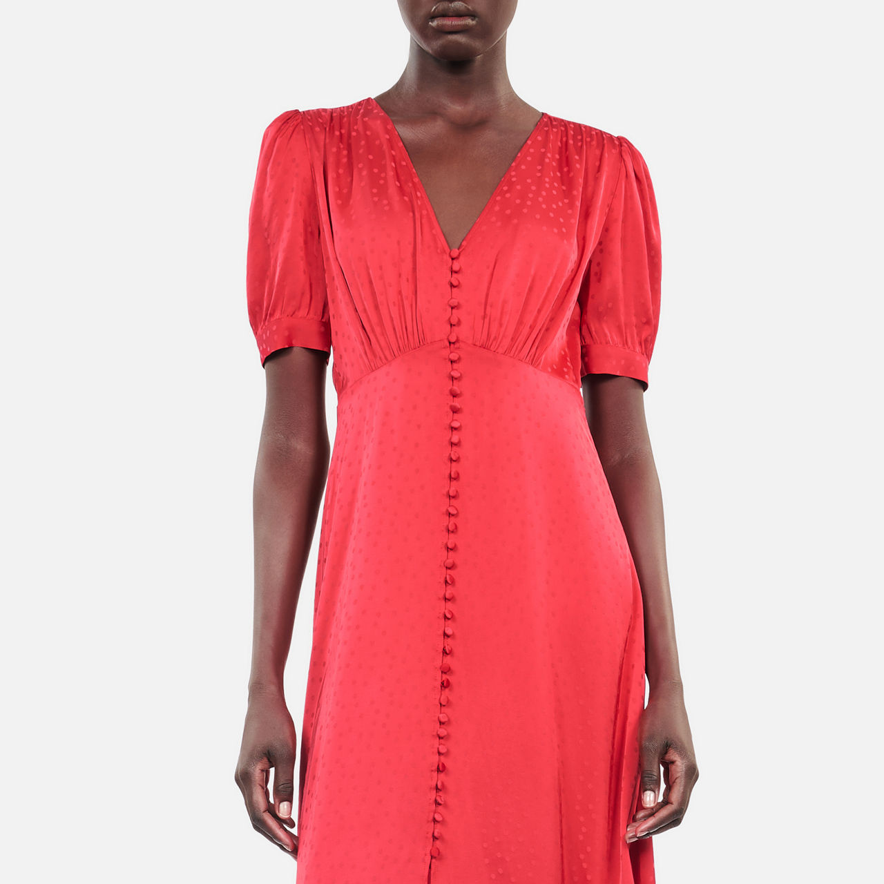- Jacquard polka-dot print, V-neckline, short sleeves, buttoned cuffs, fitted empire waist, front button fastening, fabric covered buttons, front slit detail, midi length