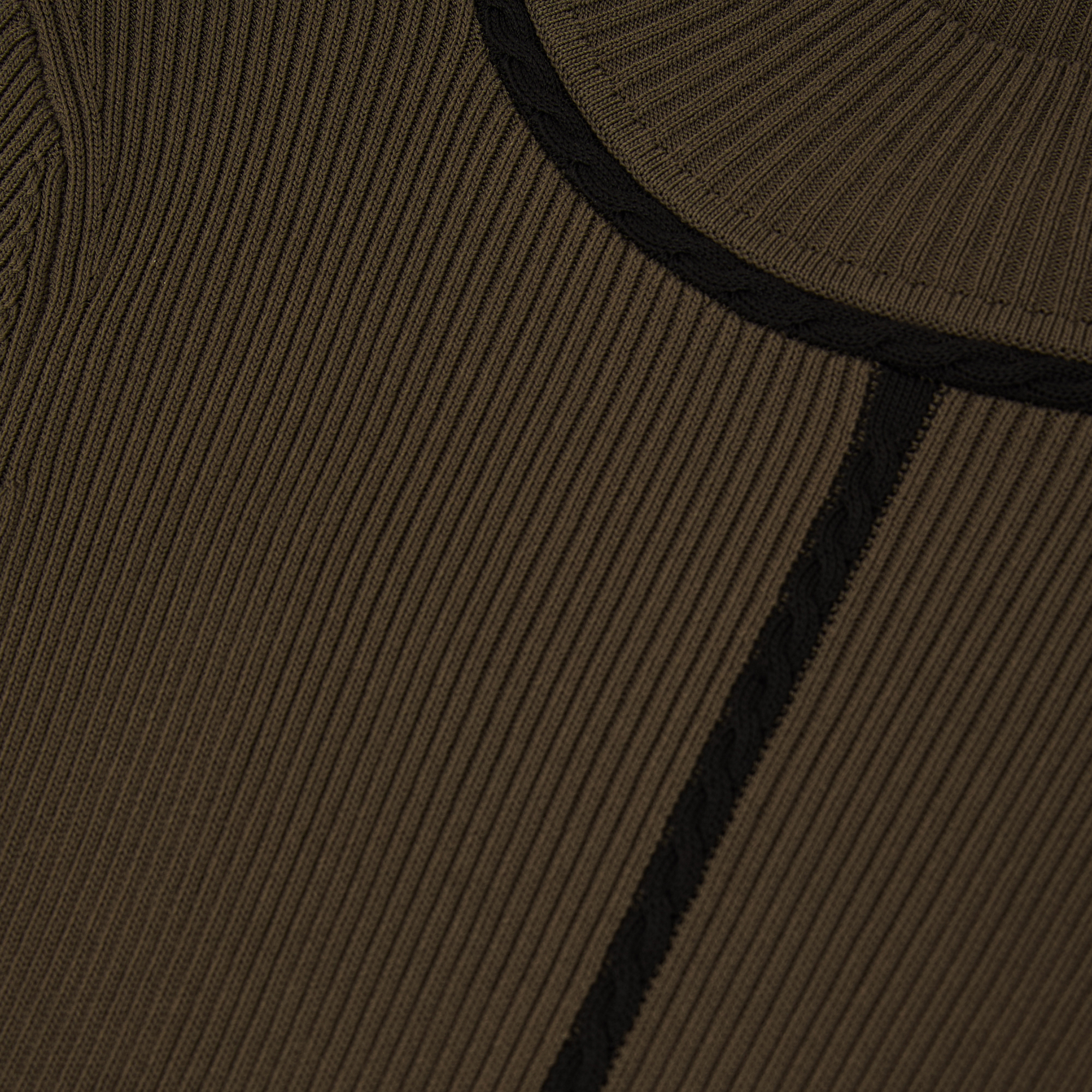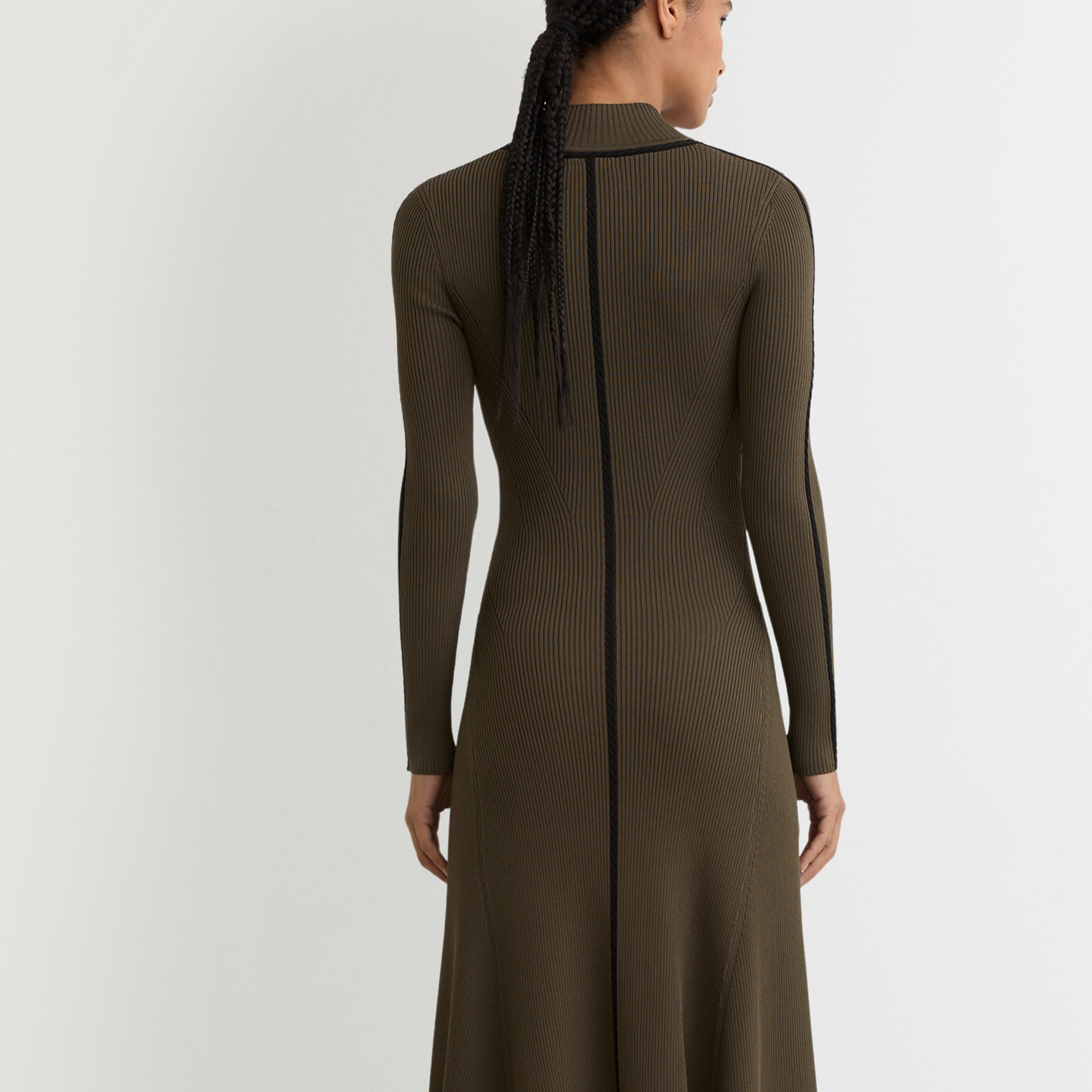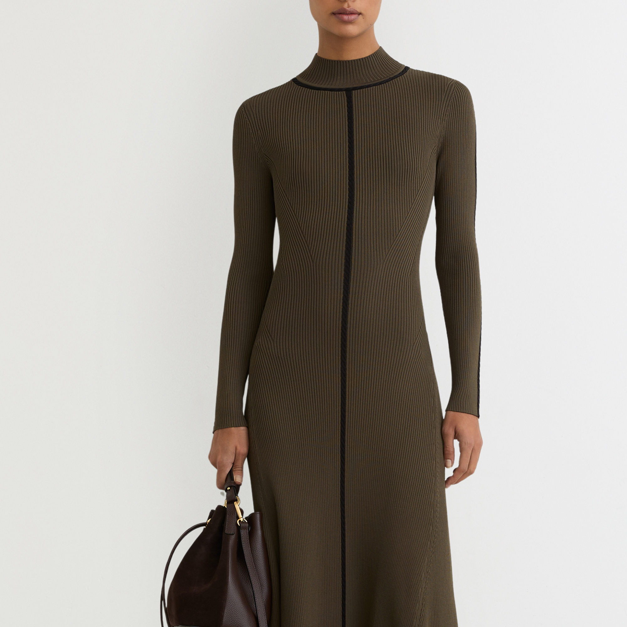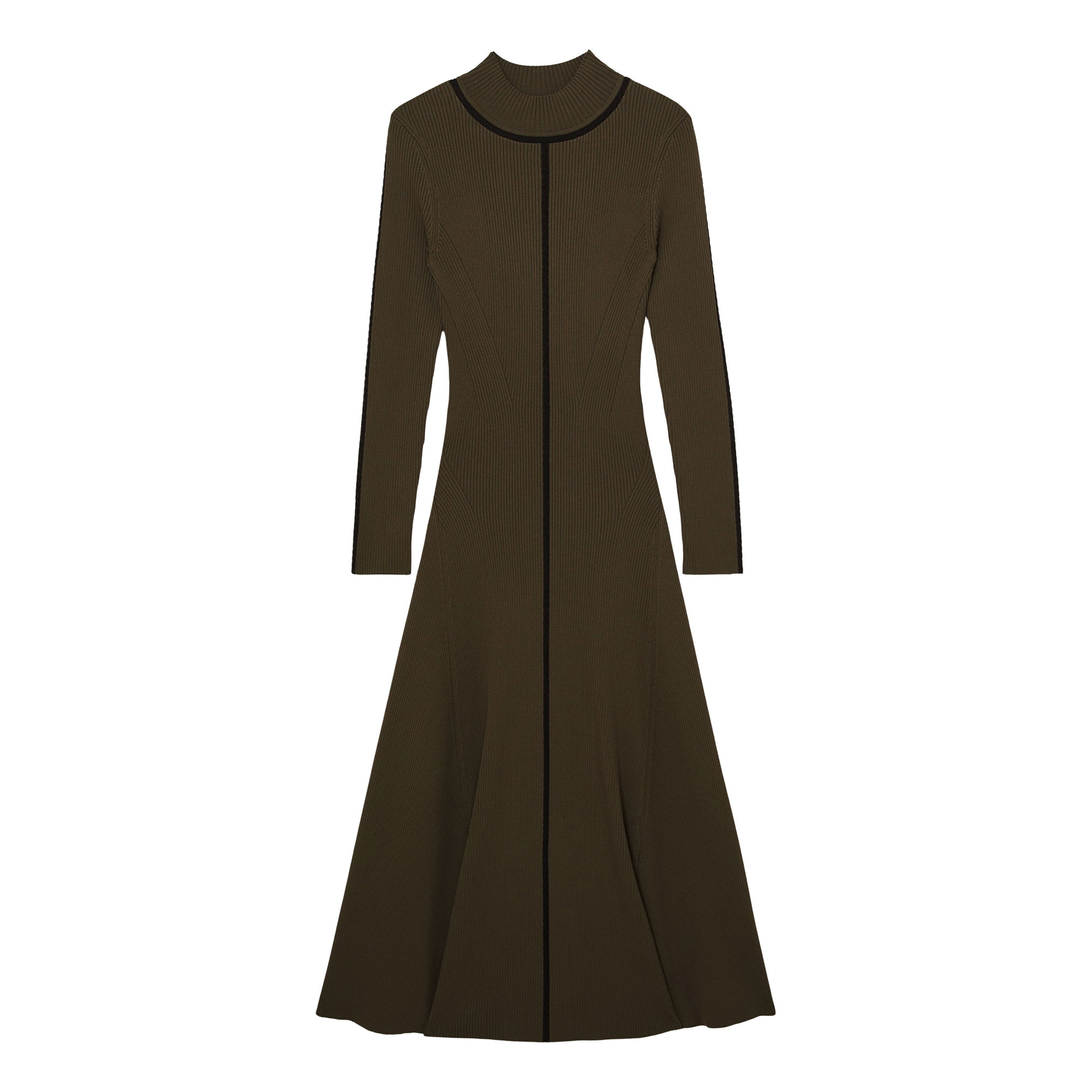- High neckline, long sleeves, subtly flared skirt, contrasting cable stitching, midi length
