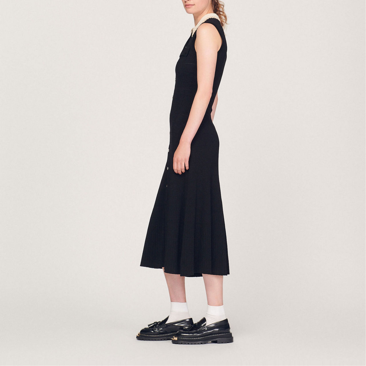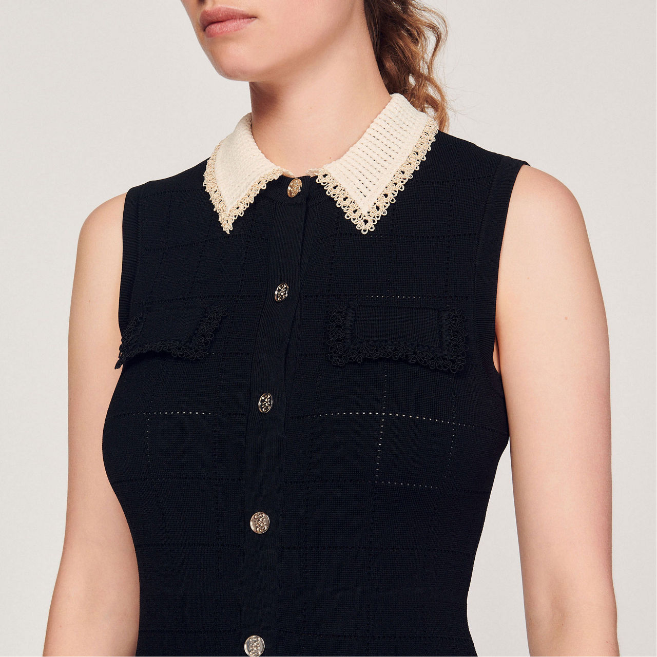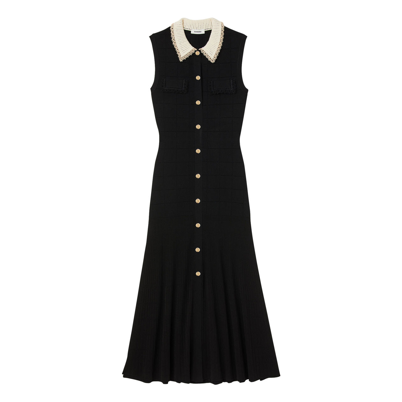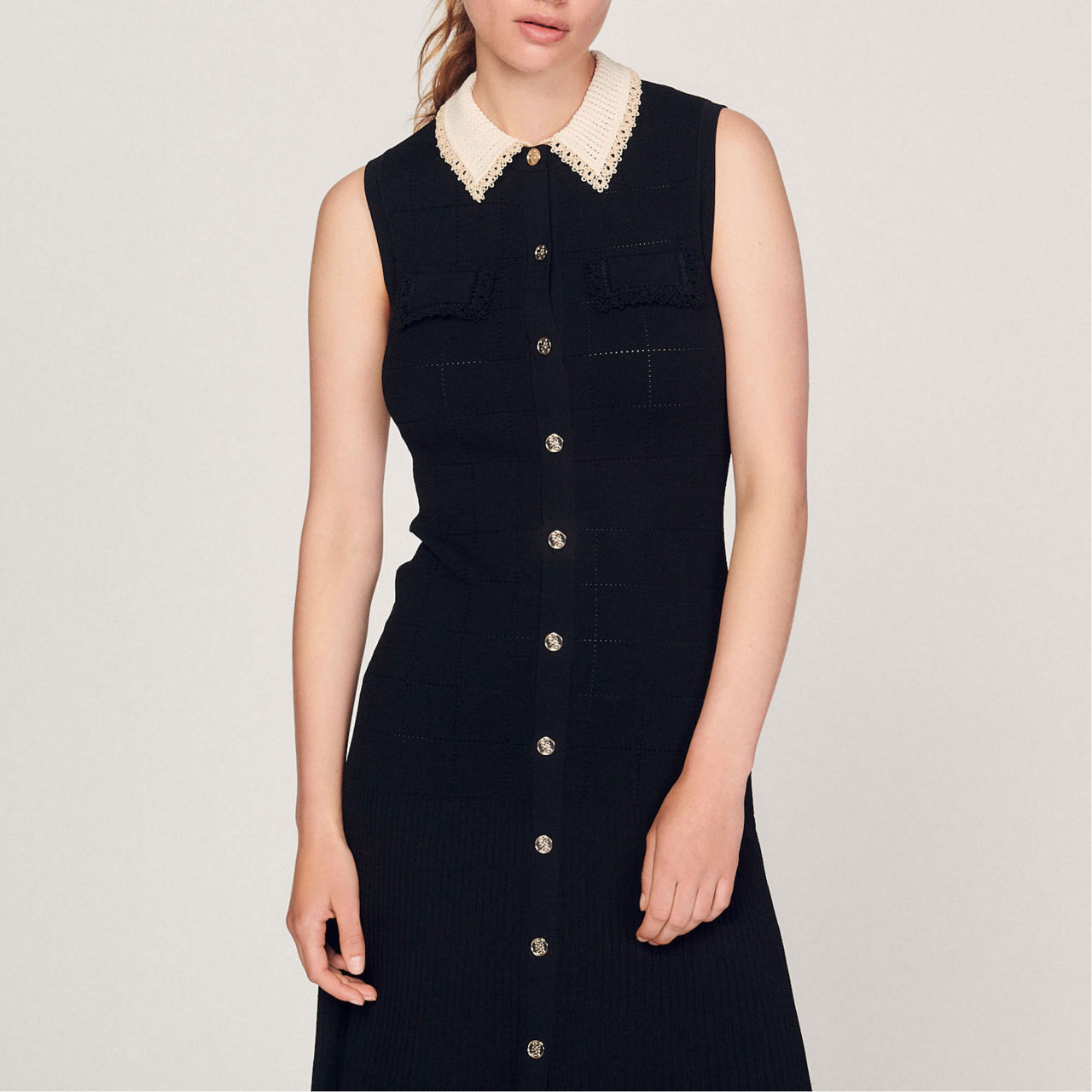 Parisian brand Sandro is known for giving classic designs a contemporary appeal, like this knit midi dress. The sleeveless silhouette is trimmed with a placket of gold-tone buttons and topped with a knit lace collar that offers a textural finish.