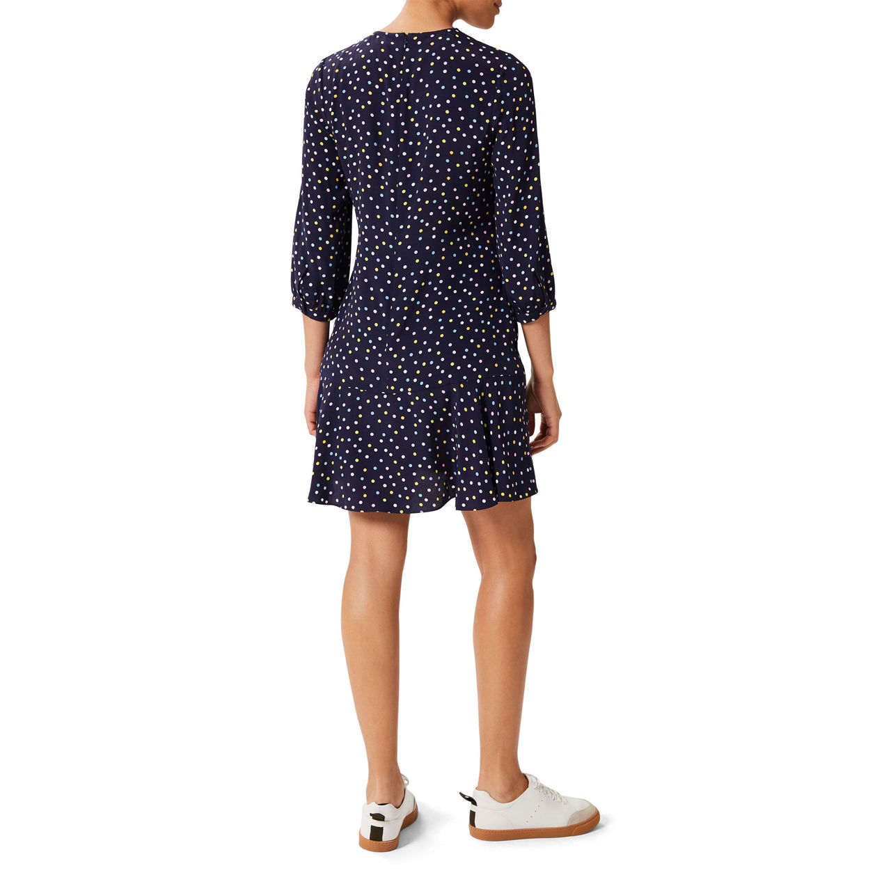 - 3/4 sleeves, round neck, mini length, fluted hem, polka dot pattern.