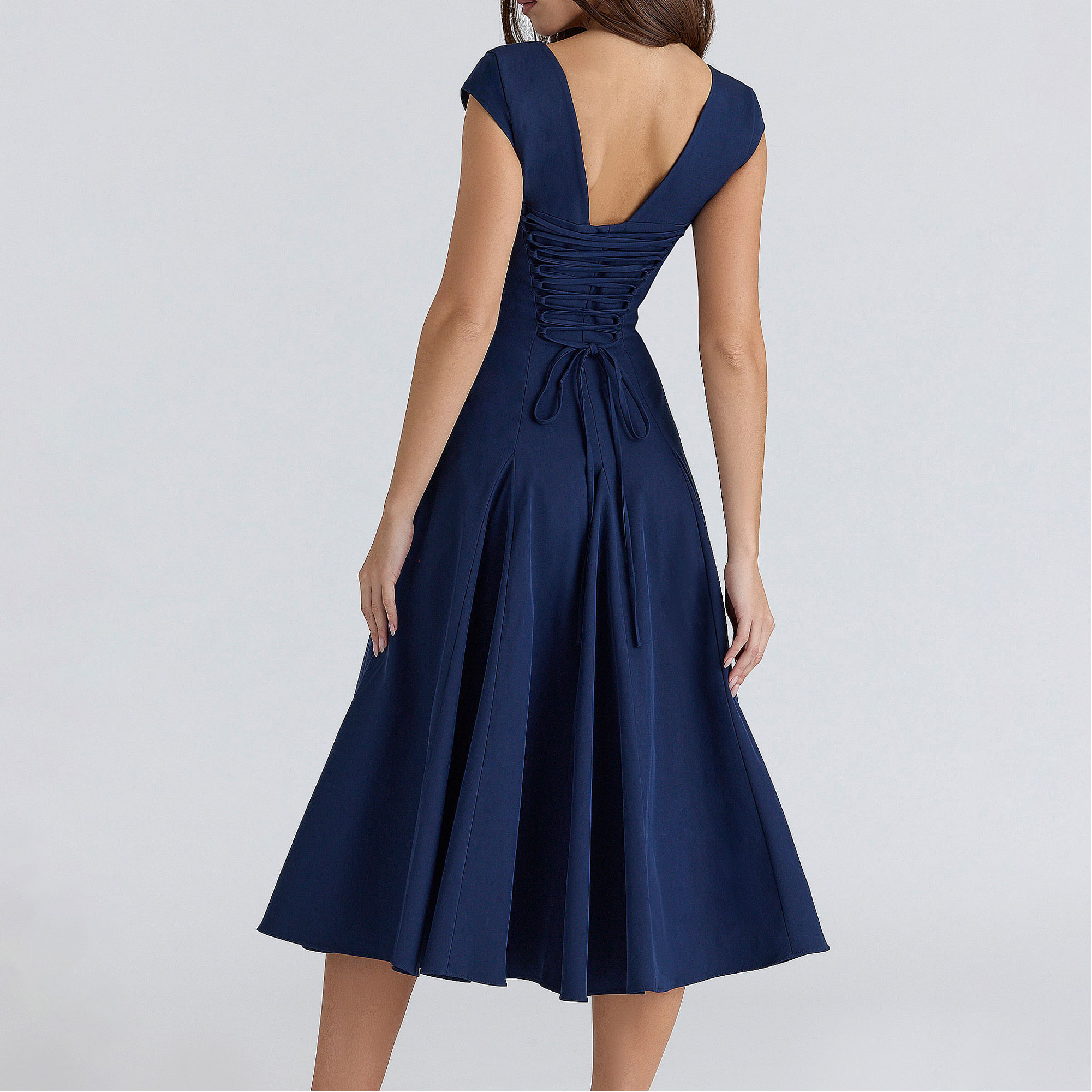 - Super soft peached twill, lined, square framed neckline, cap sleeves, lace up ties at the back, fully adjustable fit, side zip fastening