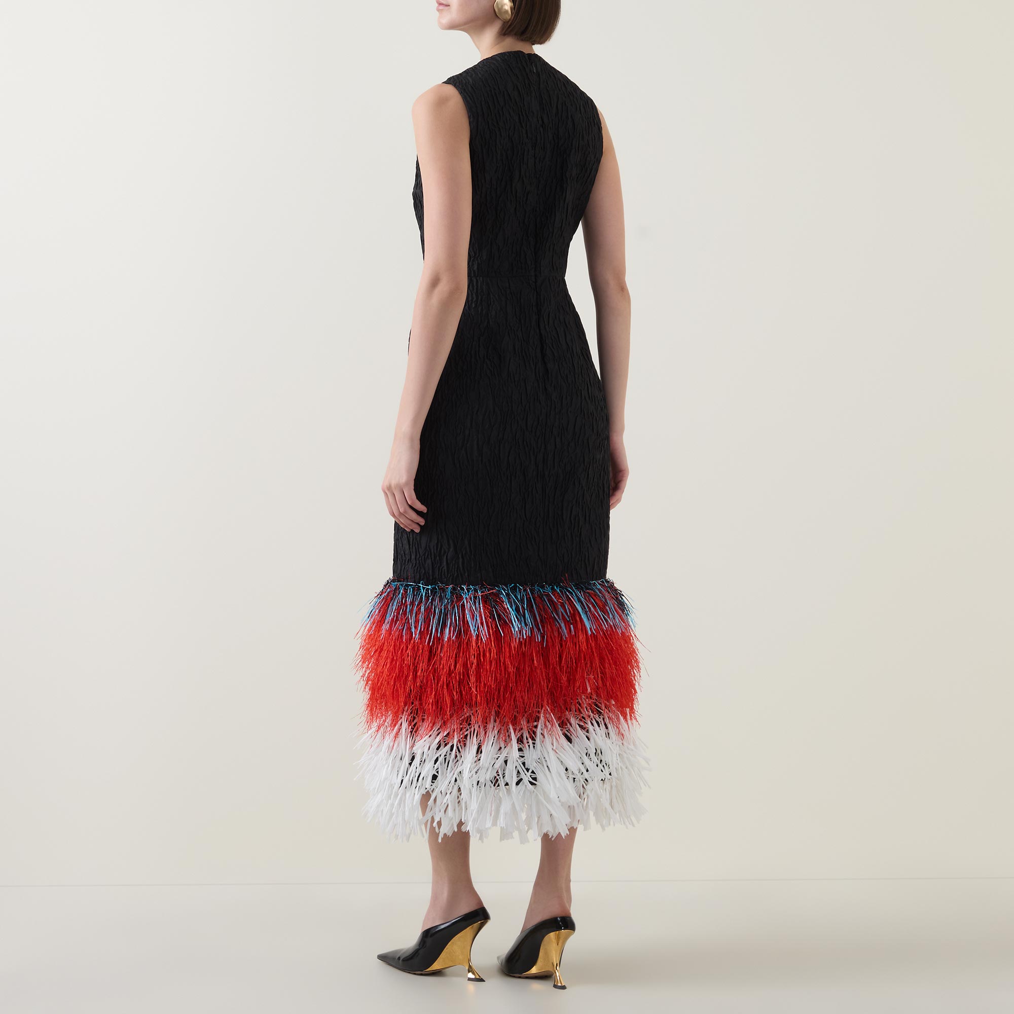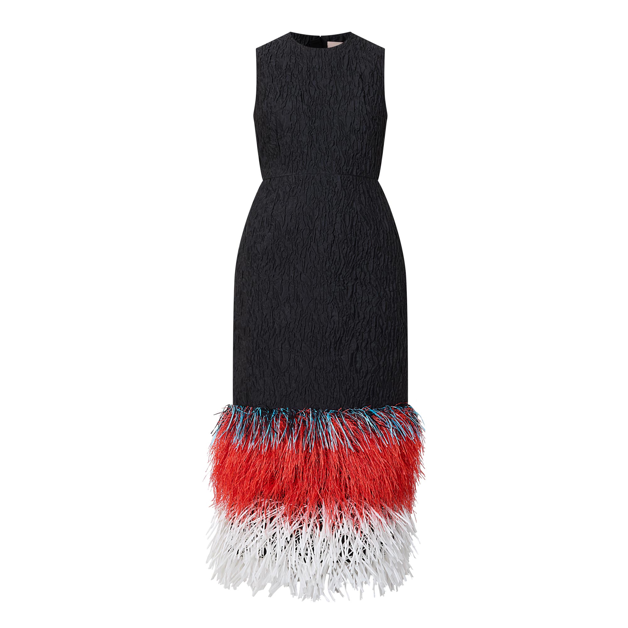- Sleeveless, round neckline, back zip-fastening closure, raffia fringe hem, midi length, textured finish
