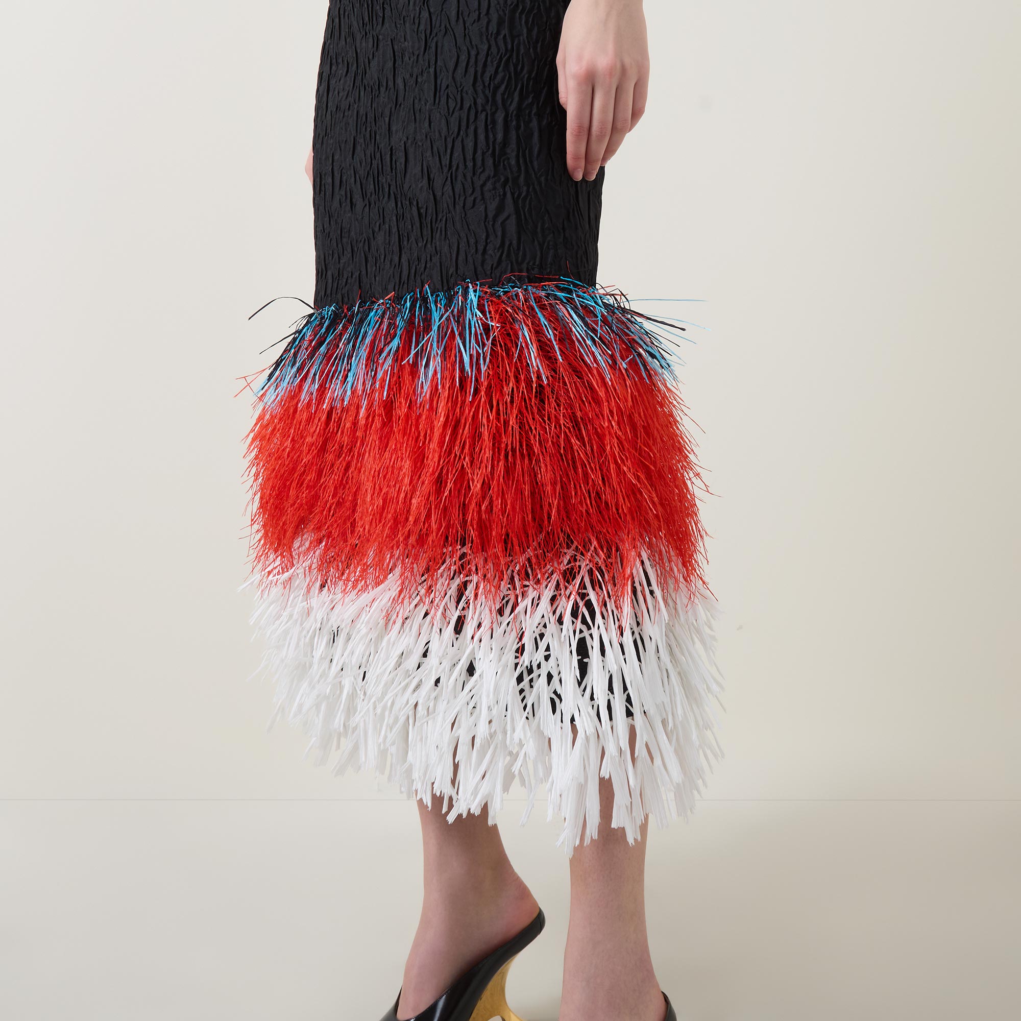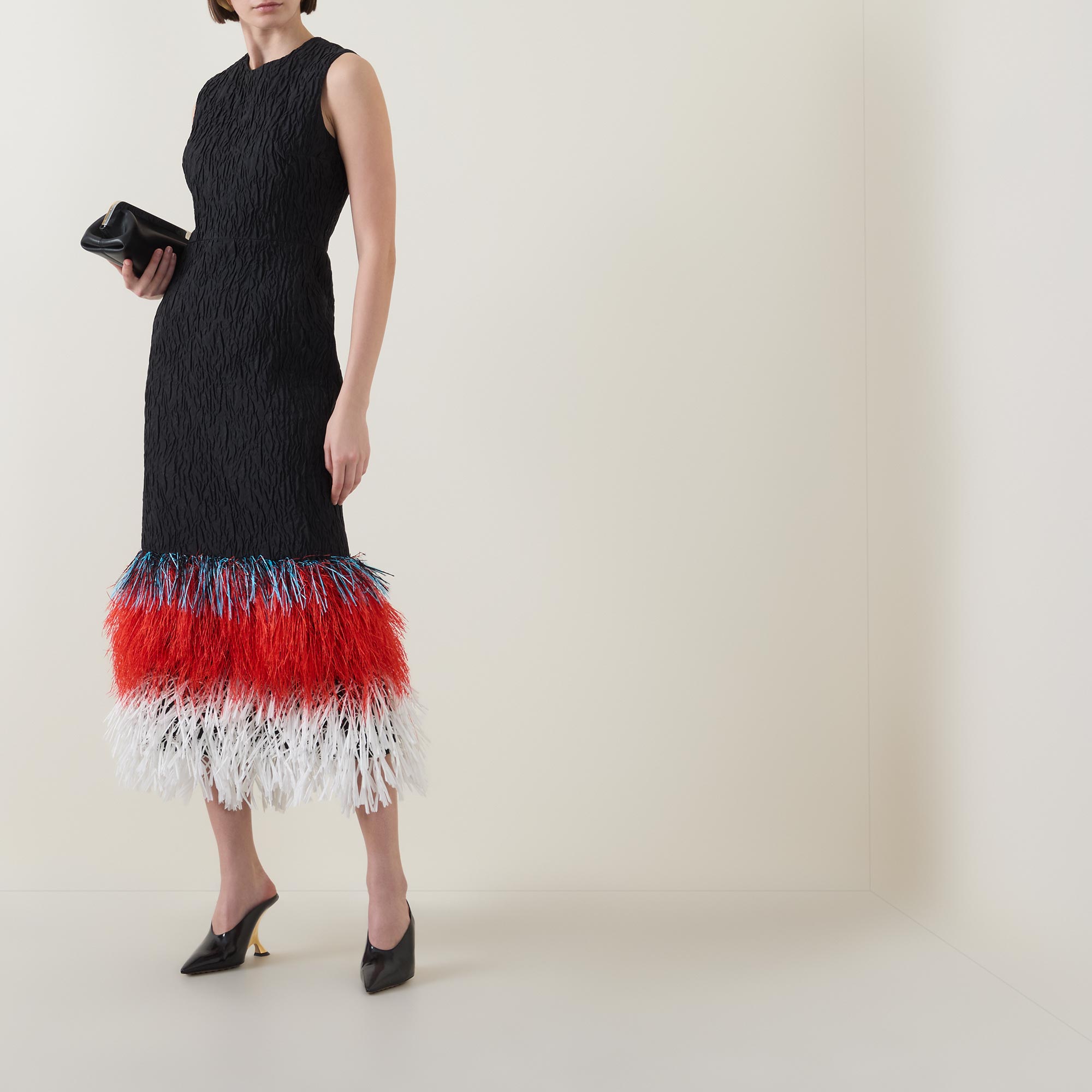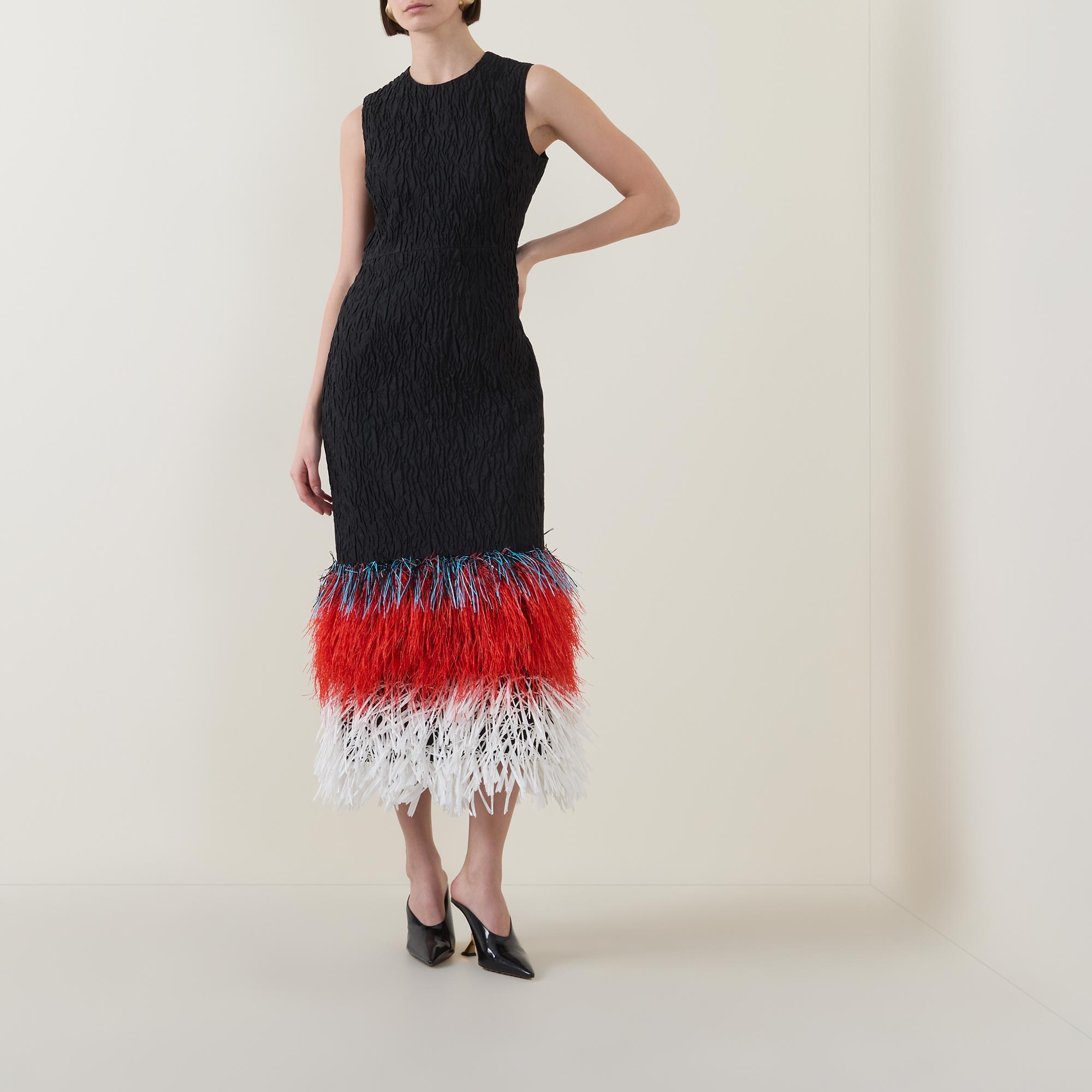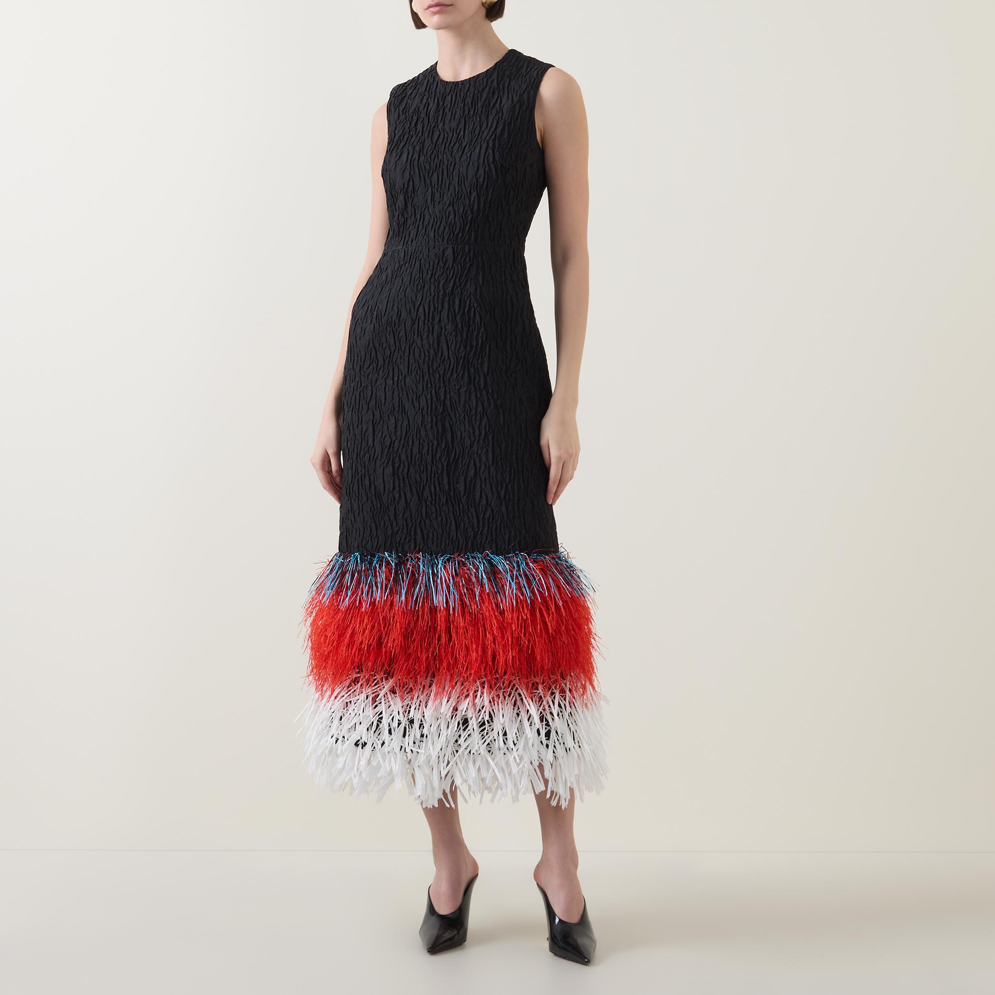 The new SS26 collection from Roksanda celebrates the brand’s 20th anniversary with an artful, sculptural focus, exemplified by the Razy dress. Cut to a form-fitting silhouette, the fabric is woven to a rippled, textured finish, while the hem is detailed with fringed raffia in three bold, tiered colours. Secured with a zip fastening at the back, the design is defined by a classic round neckline and falls to a refined midi length.