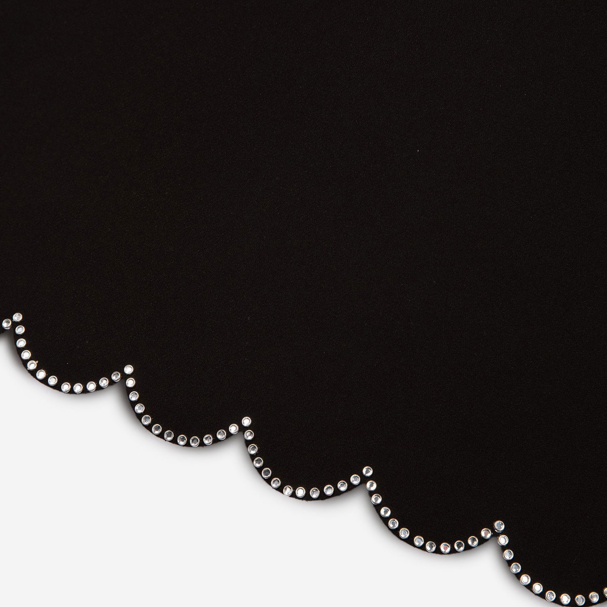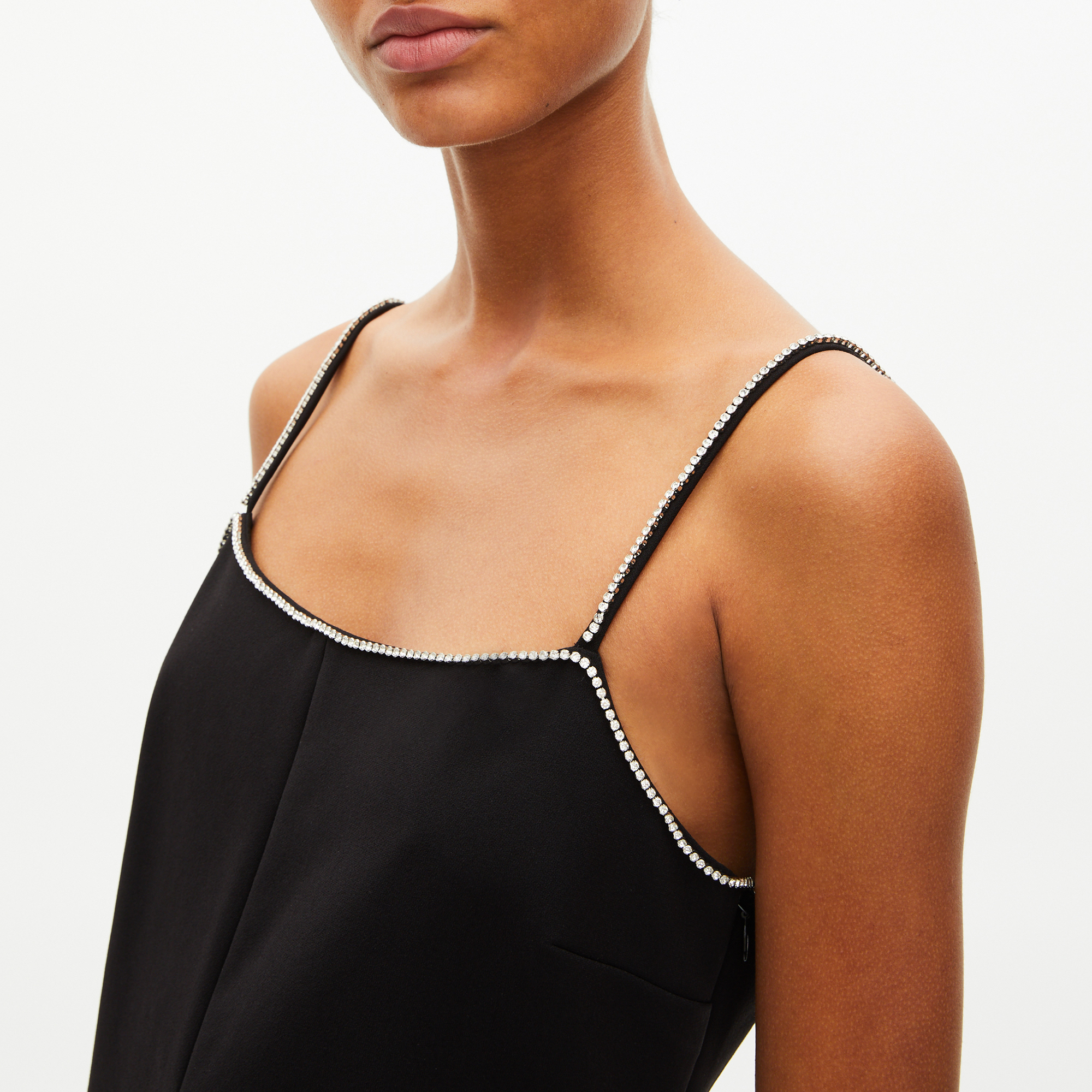 - Rhinestone-embellished neckline, narrow straps, cloud-shaped hem with rhinestones, straight cut, mini length