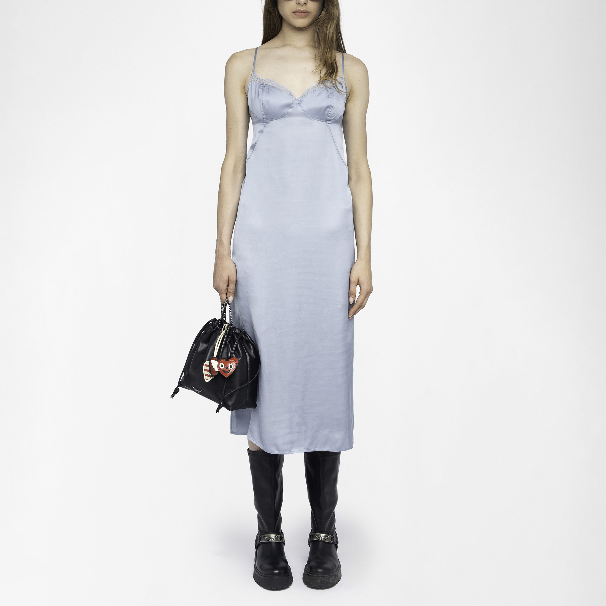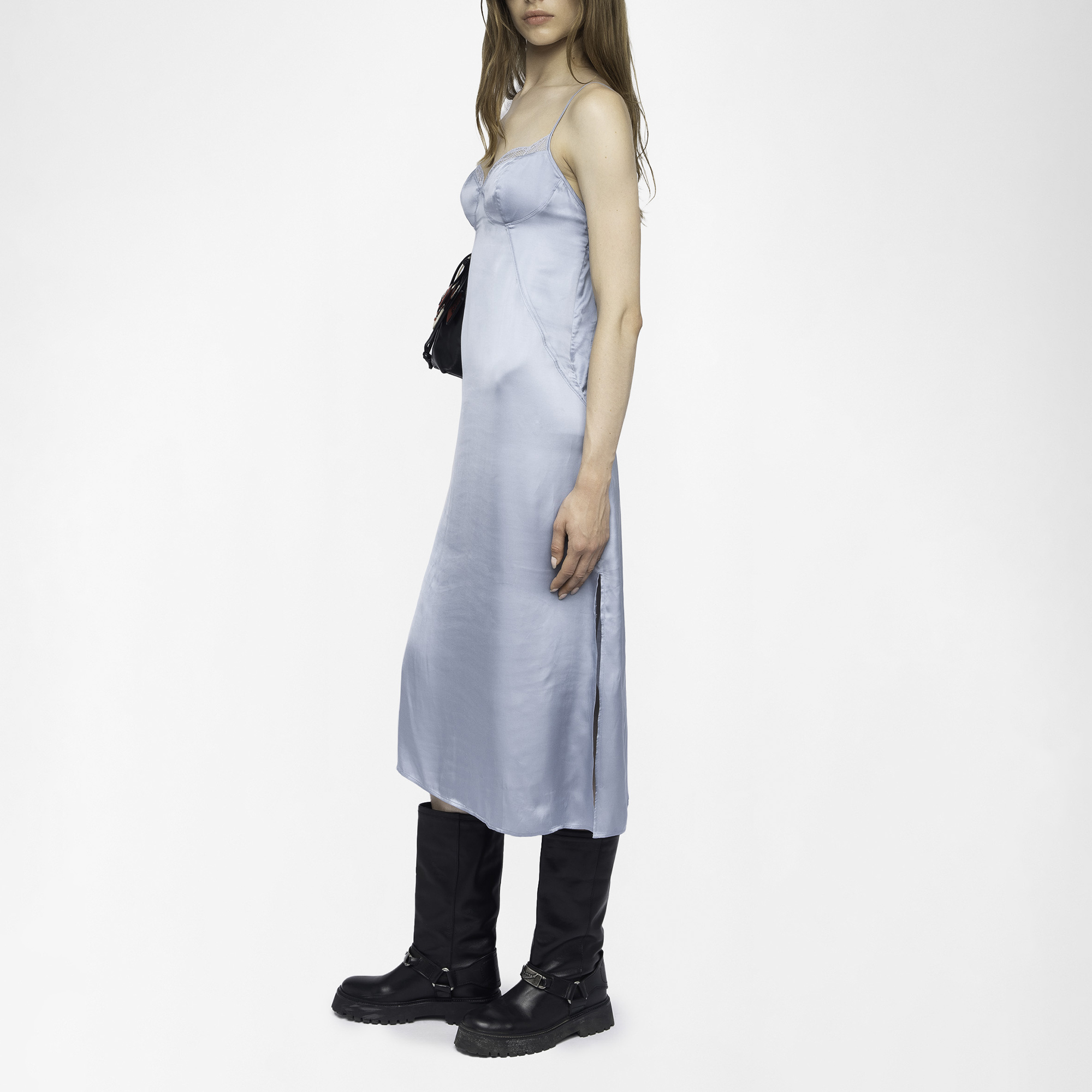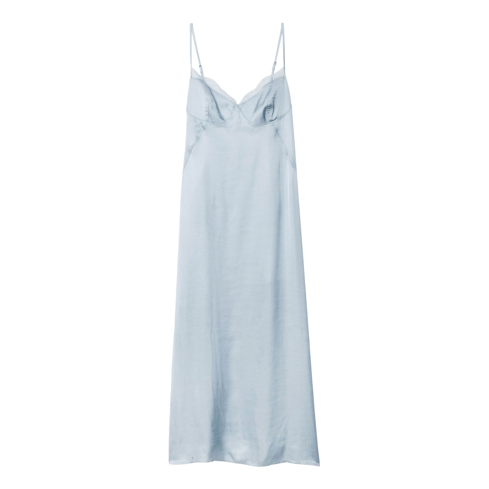 - V-neckline, French lace trim, adjustable straps, rear cut out detailing, lingerie-inspired design, midi length, satin finish