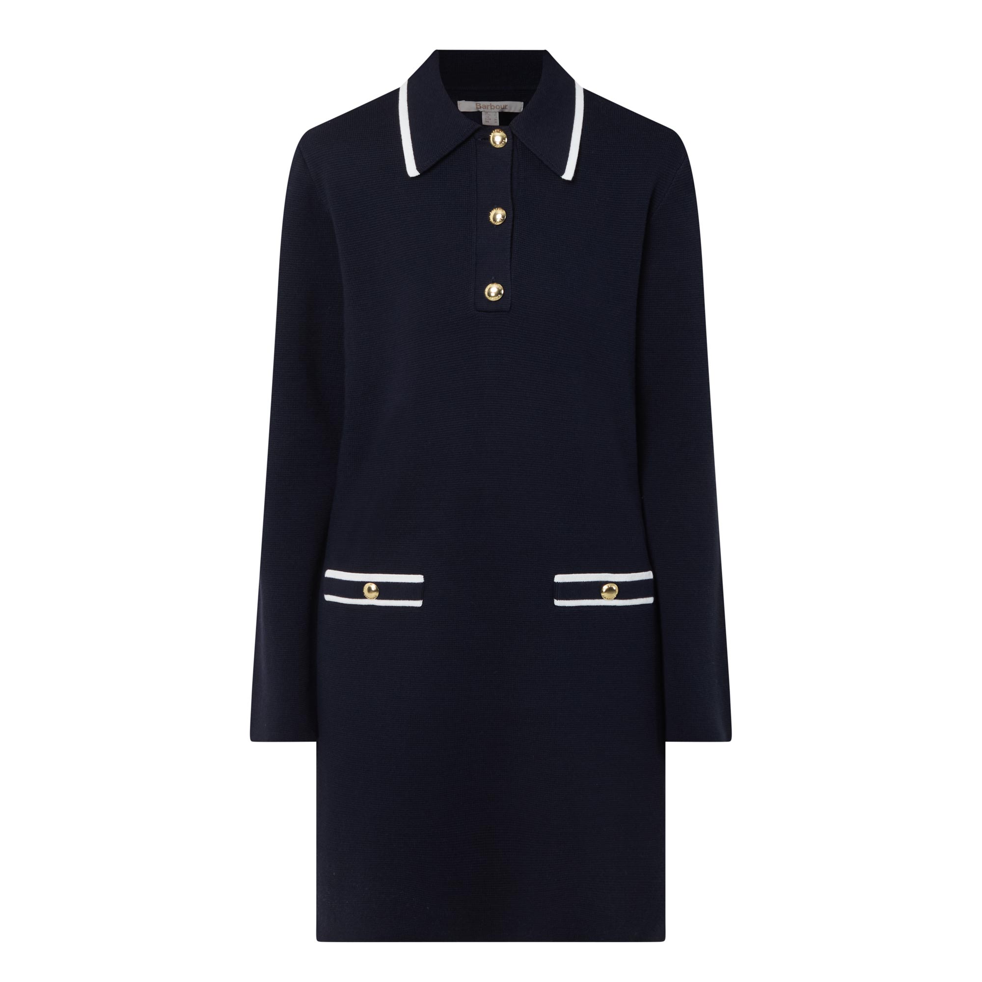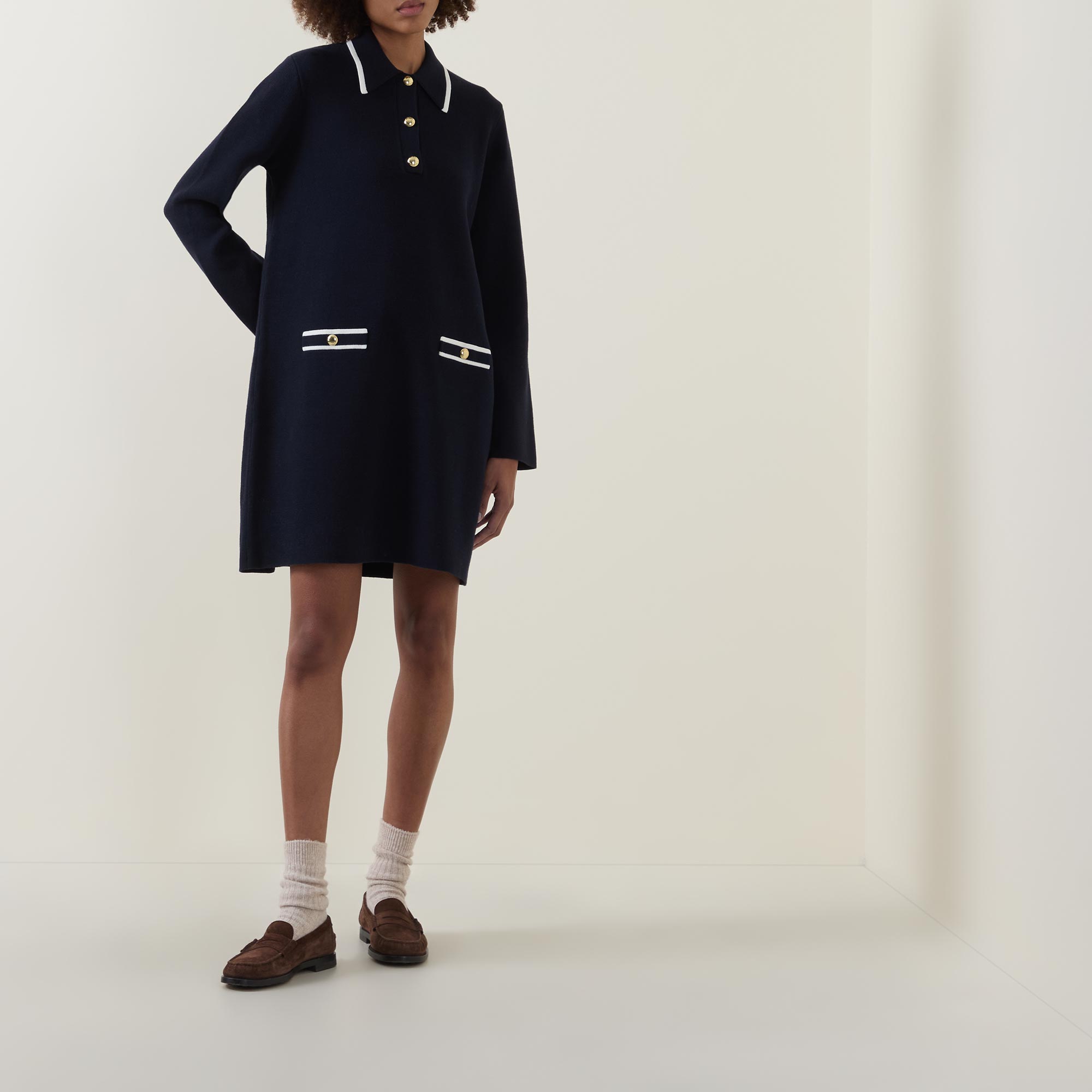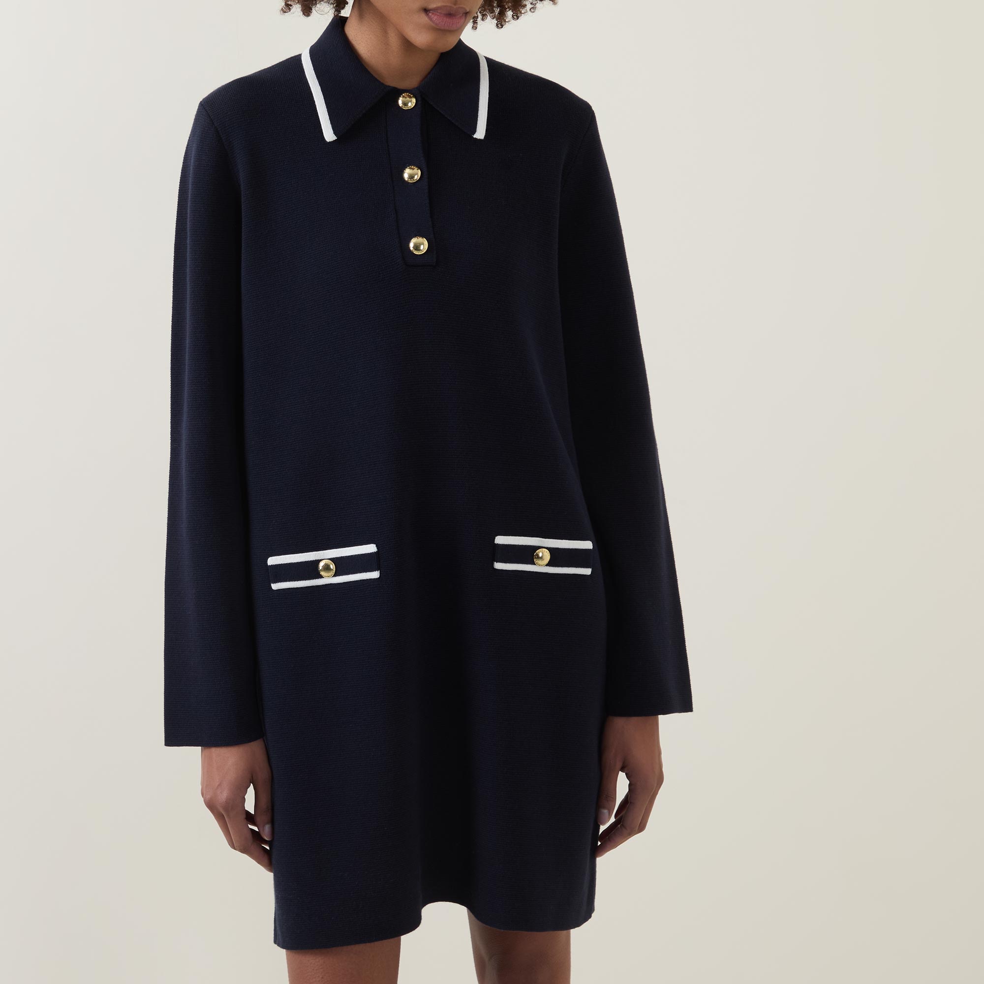 - Contrast trims, polo collar, long sleeves, mini length, knitted, faux front pockets, gold-toned buttons