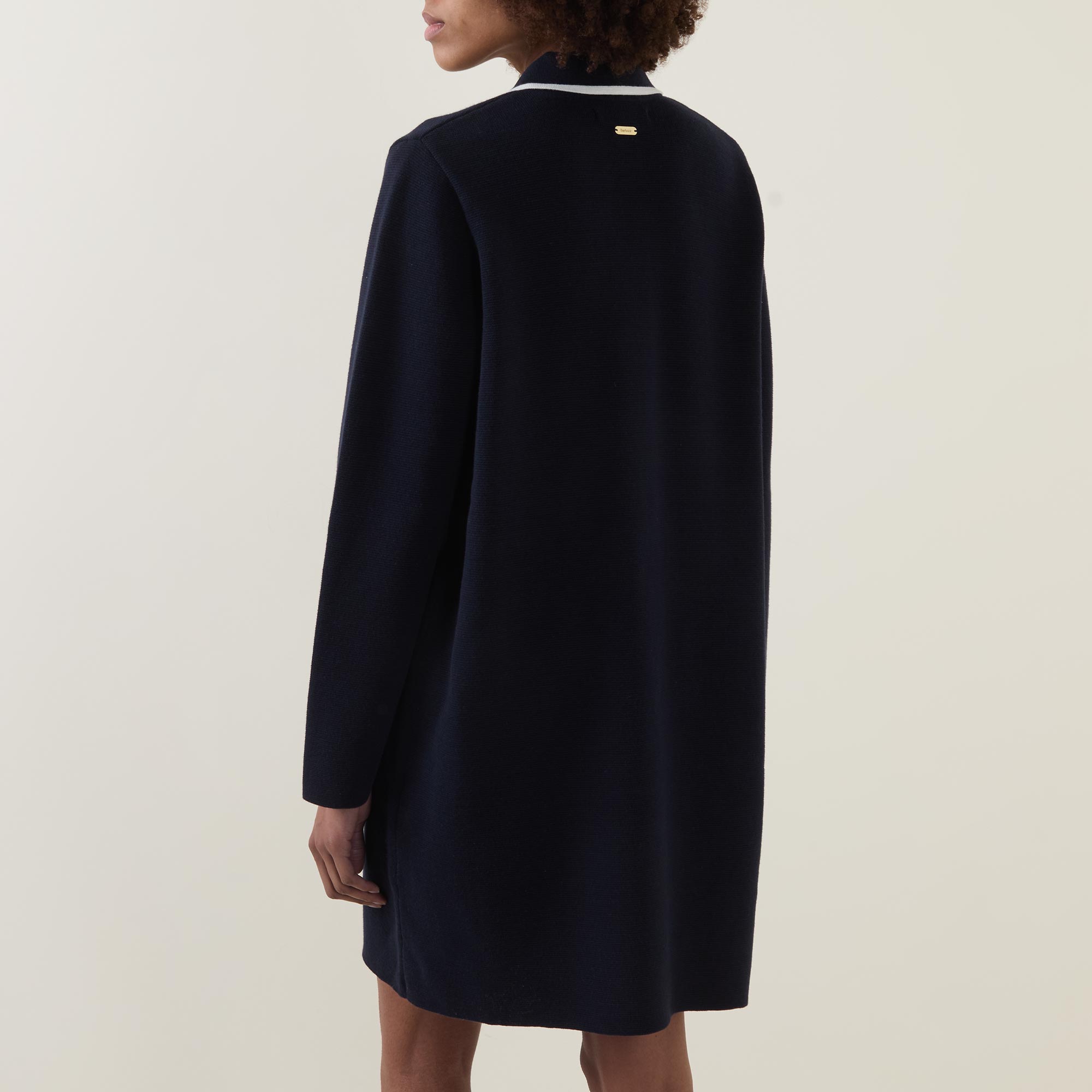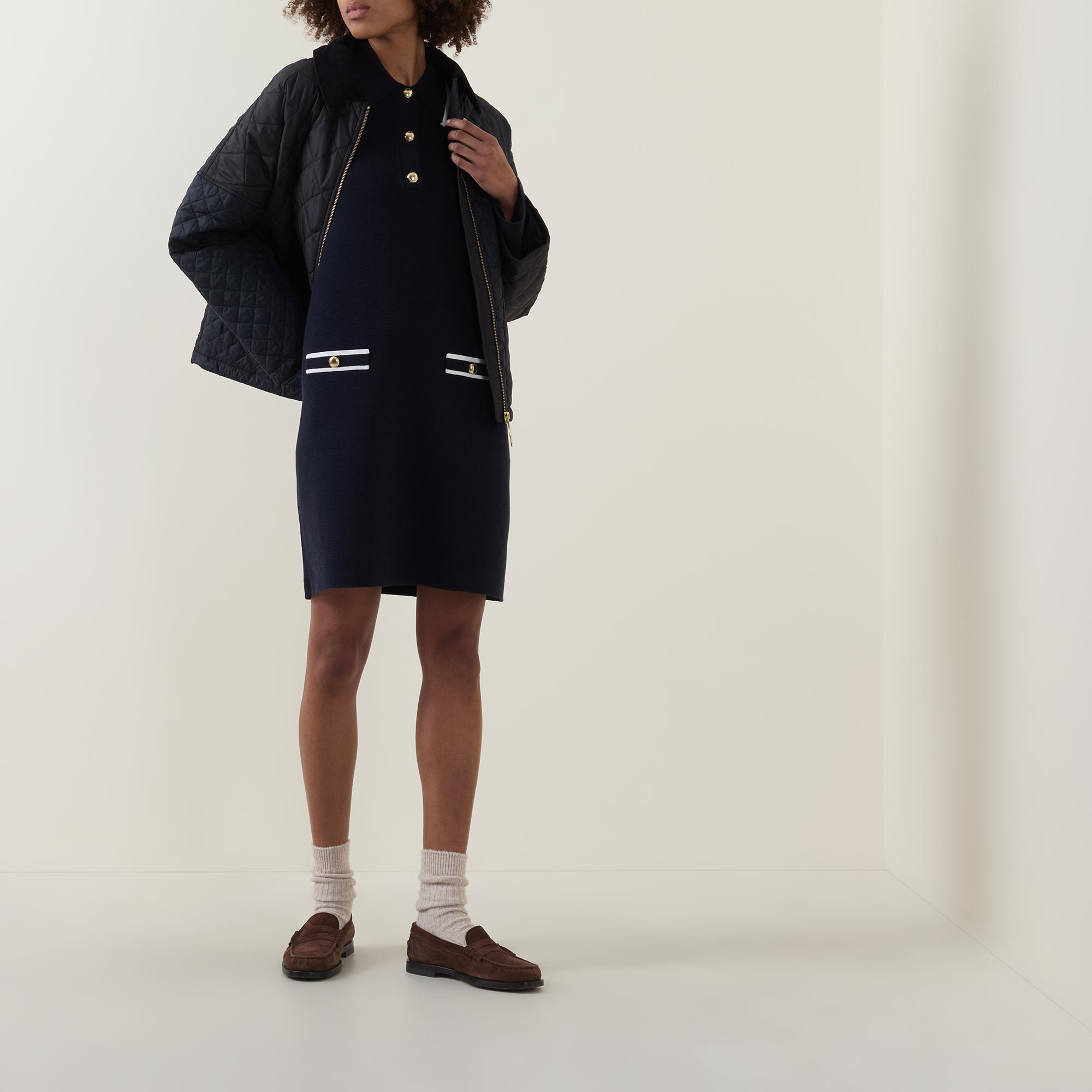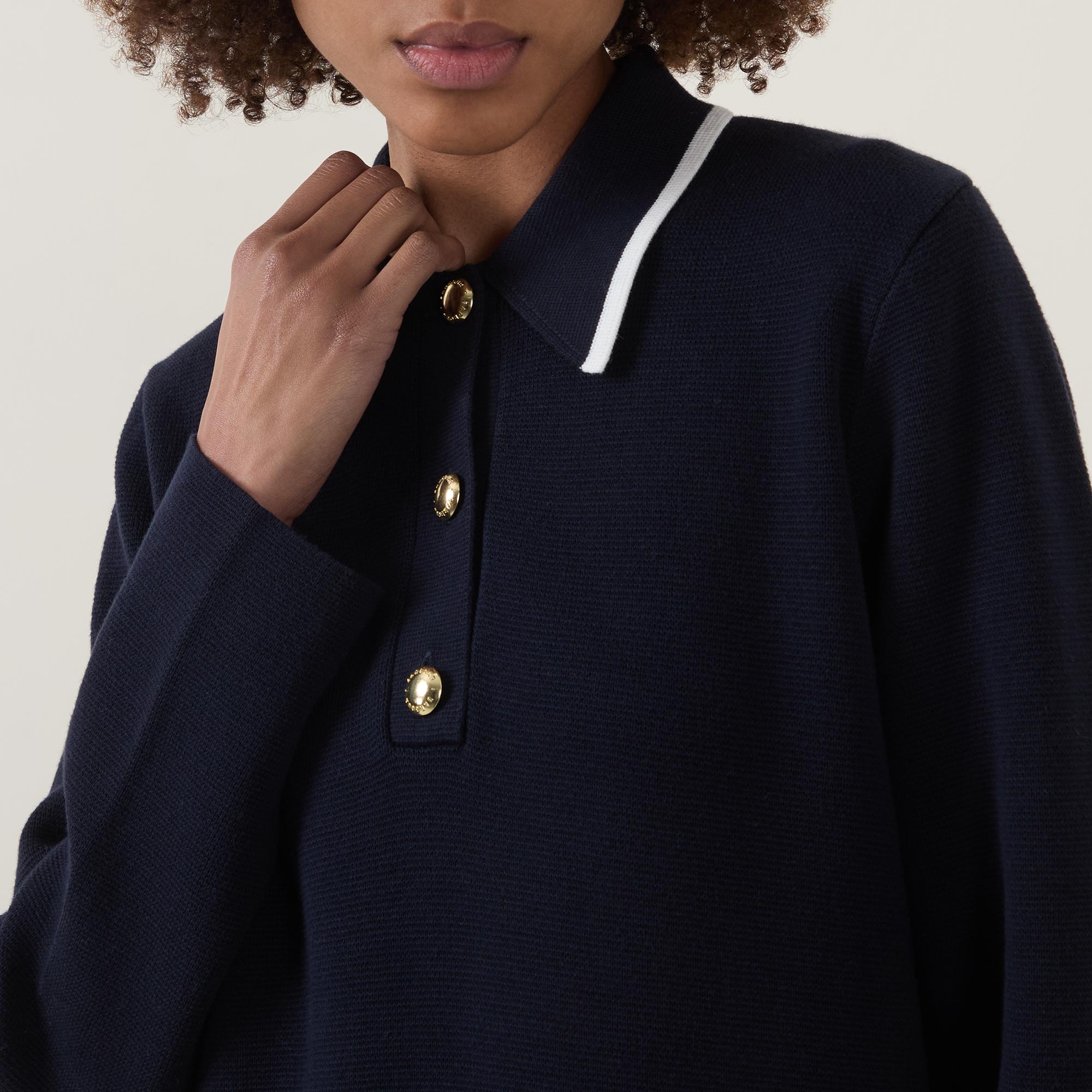 - Contrast trims, polo collar, long sleeves, mini length, knitted, faux front pockets, gold-toned buttons