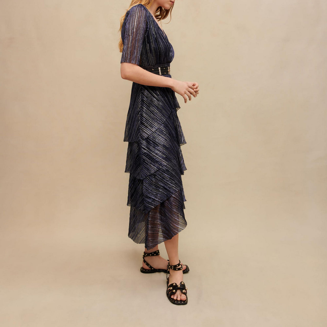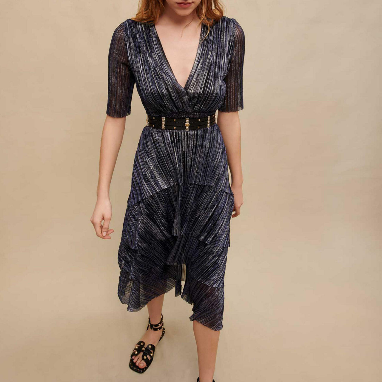 Shimmer in style with the Ruffina dress from Parisian label, Maje. This dress stands out thanks to its metallic thread and chic, tiered silhouette. Framed by a deep, V neck and a cinched waist, its falls to a midi length for a chic sign off. Dress it up with heels and accessories.
