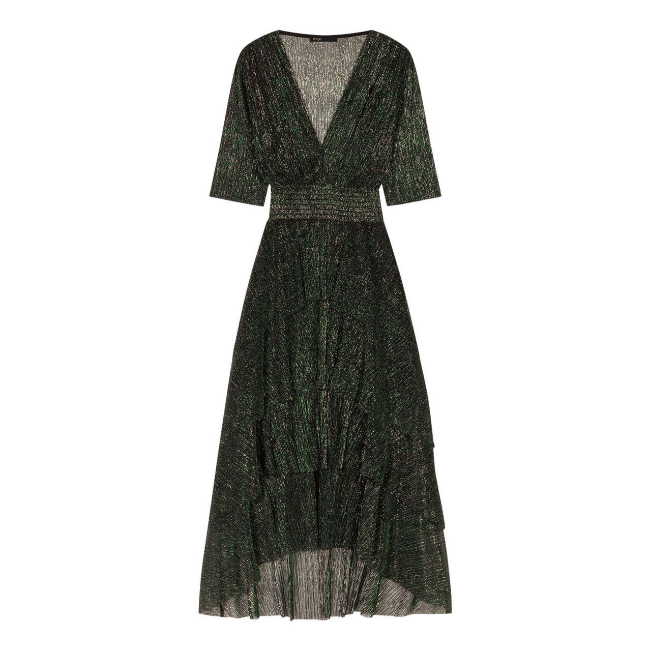 The Ruffine dress from Maje delivers endless appeal with its chic silhouette and lamé fabrication. Featuring a deep V neck and tiered midi skirt, it stands out with metallic thread for a touch of sparkle. Just add heels and accessories to create a party-ready look.