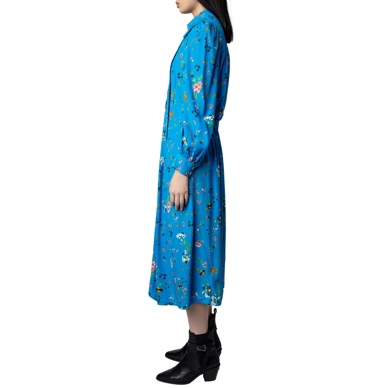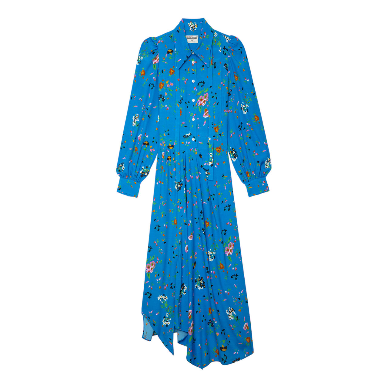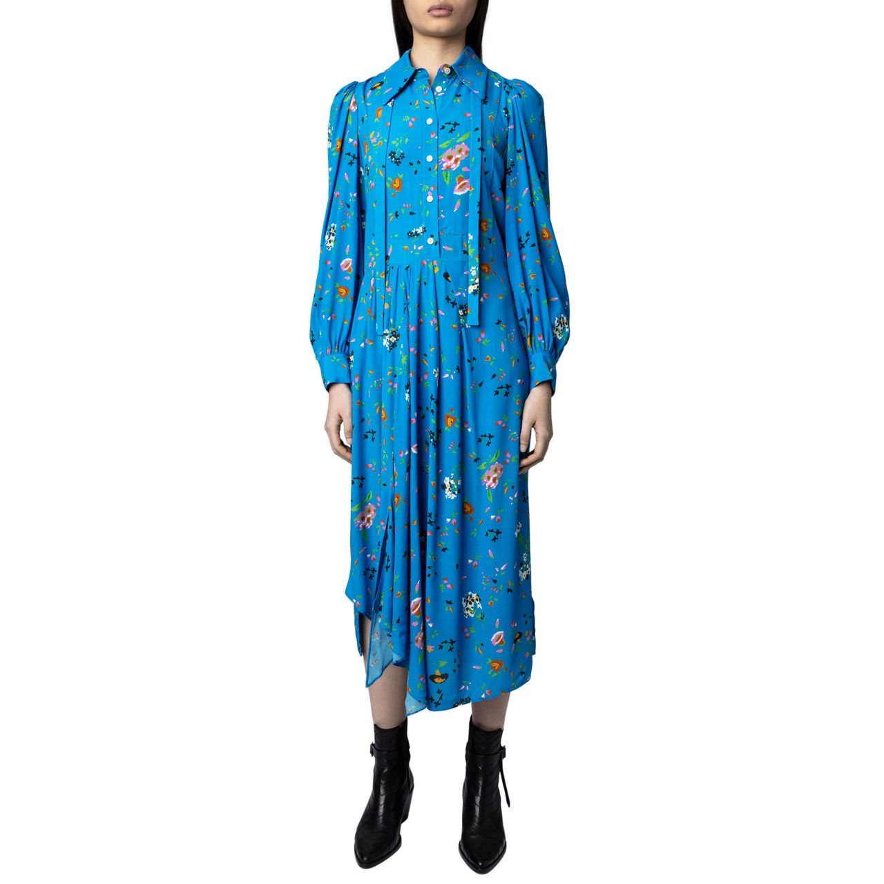 - Floral print, buttoned on the top, pussy bow collar, long sleeves with buttons, draped effect, asymmetric skirt