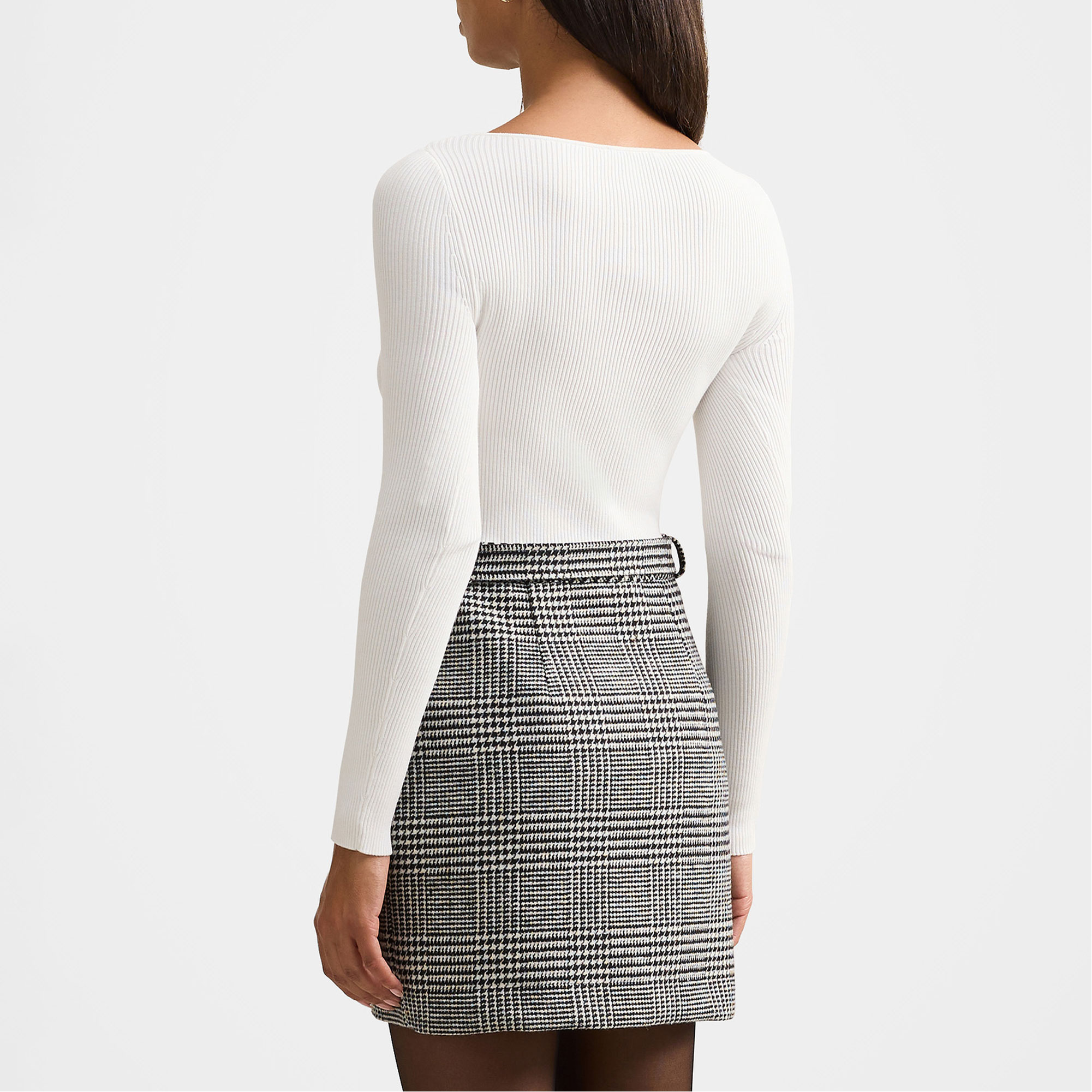 - Fitted silhouette, rib-knit top fabrication, woven crosshatch skirt, high crew neckline, long sleeves, 2-in-1 top and skirt design, non-functional jet pockets, woven belt, concealed zip fastening at side seam, lined
