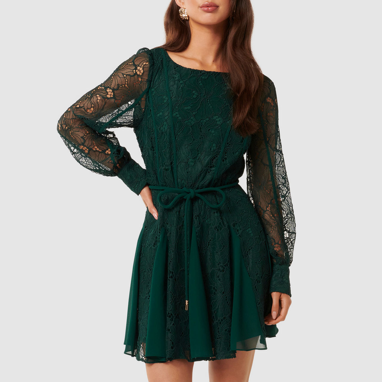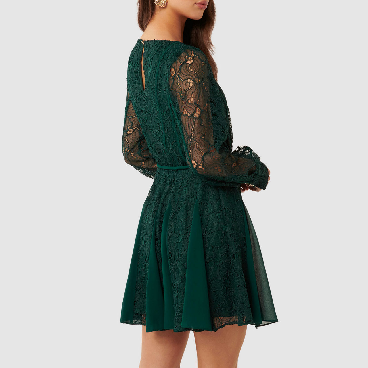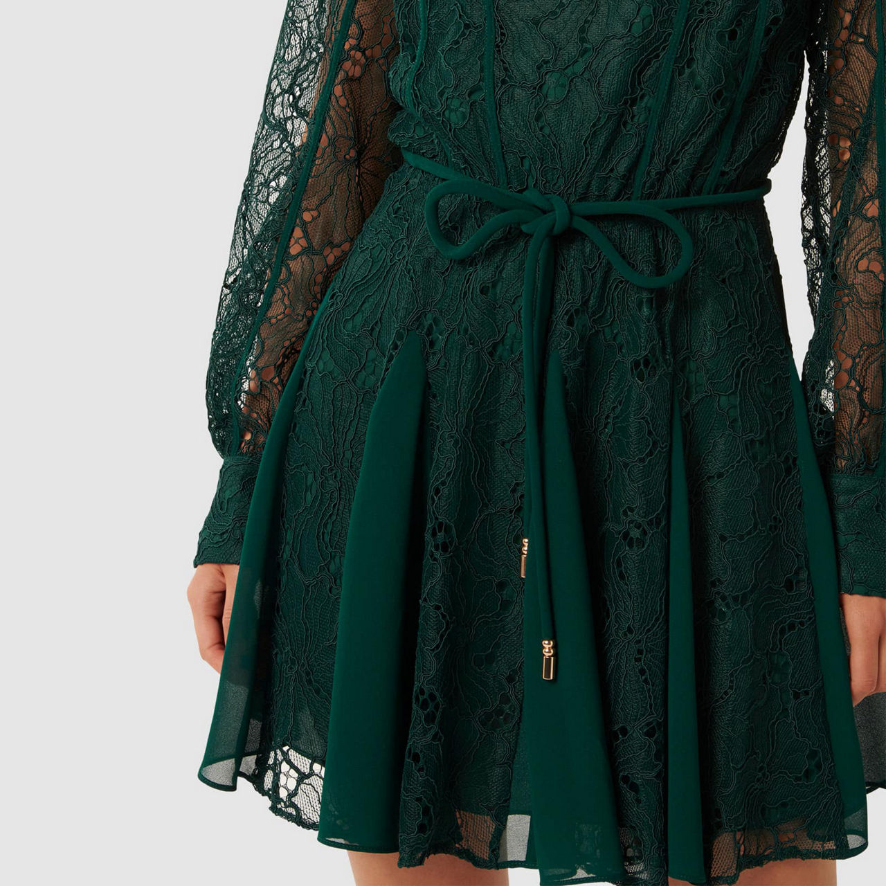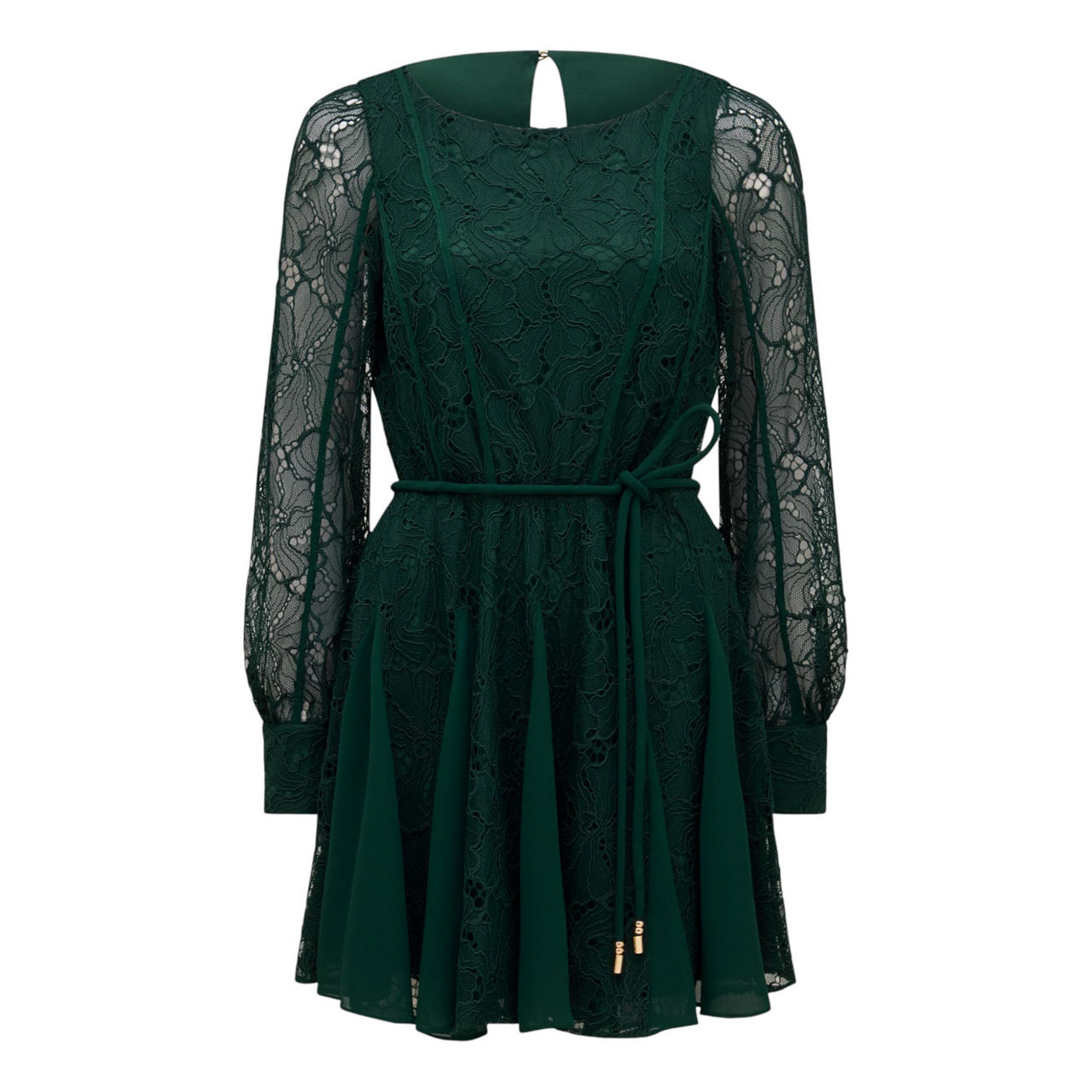 - Mini length, round neckline, long sleeves with fitted cuffs, removable self-tie belt at waist, floral lace fabrication, keyhole and button fastening, exposed seams through bodice and arms, concealed zip fastening, lined