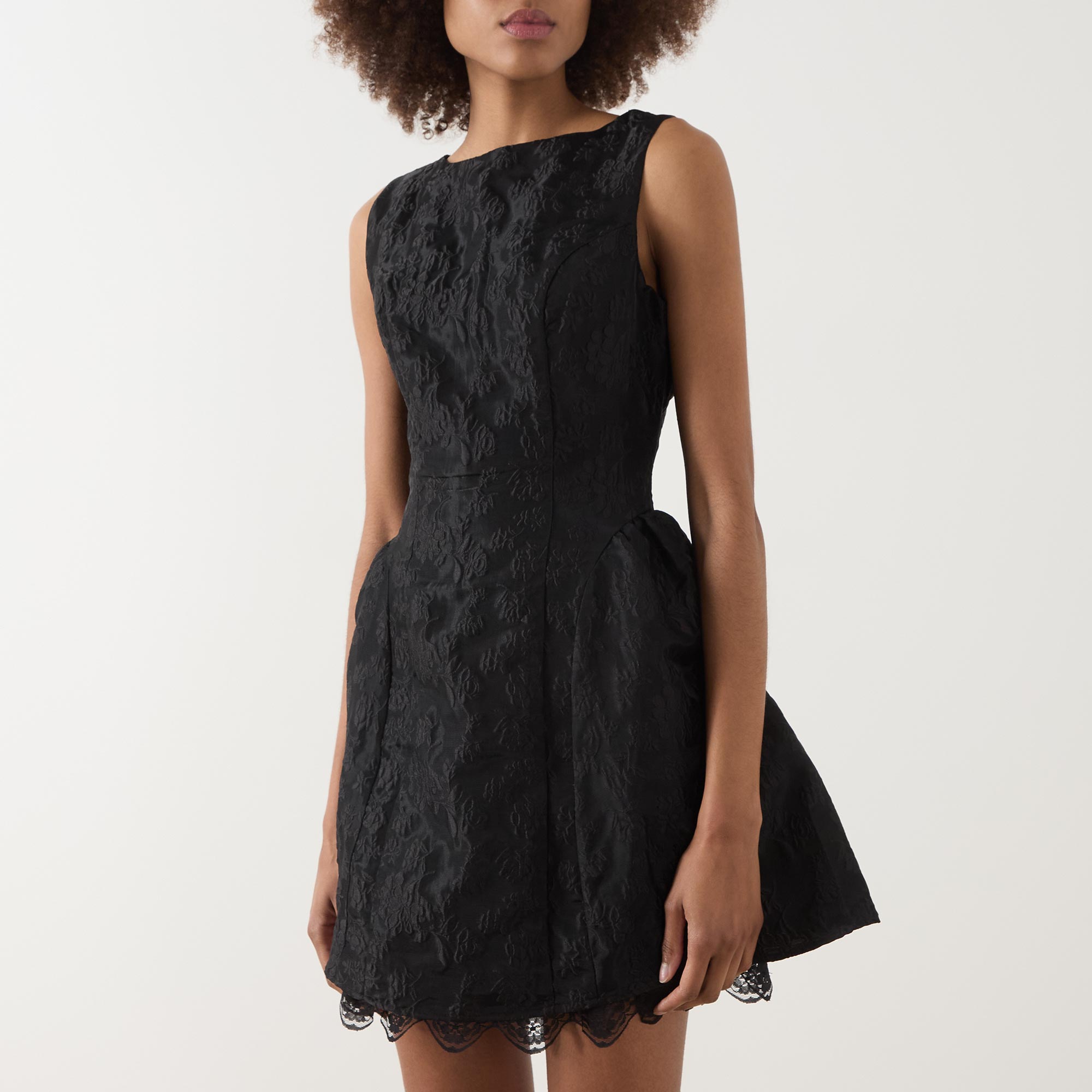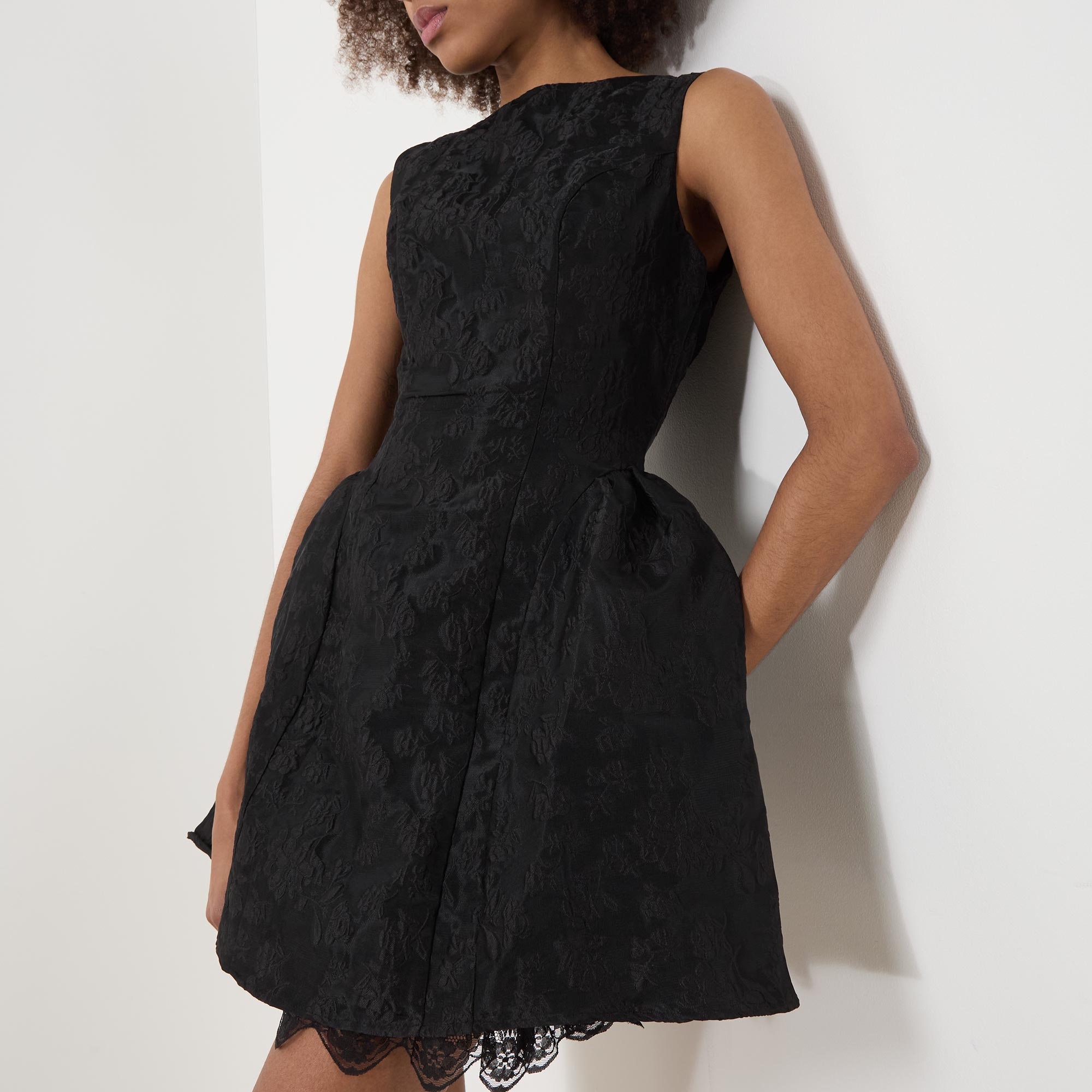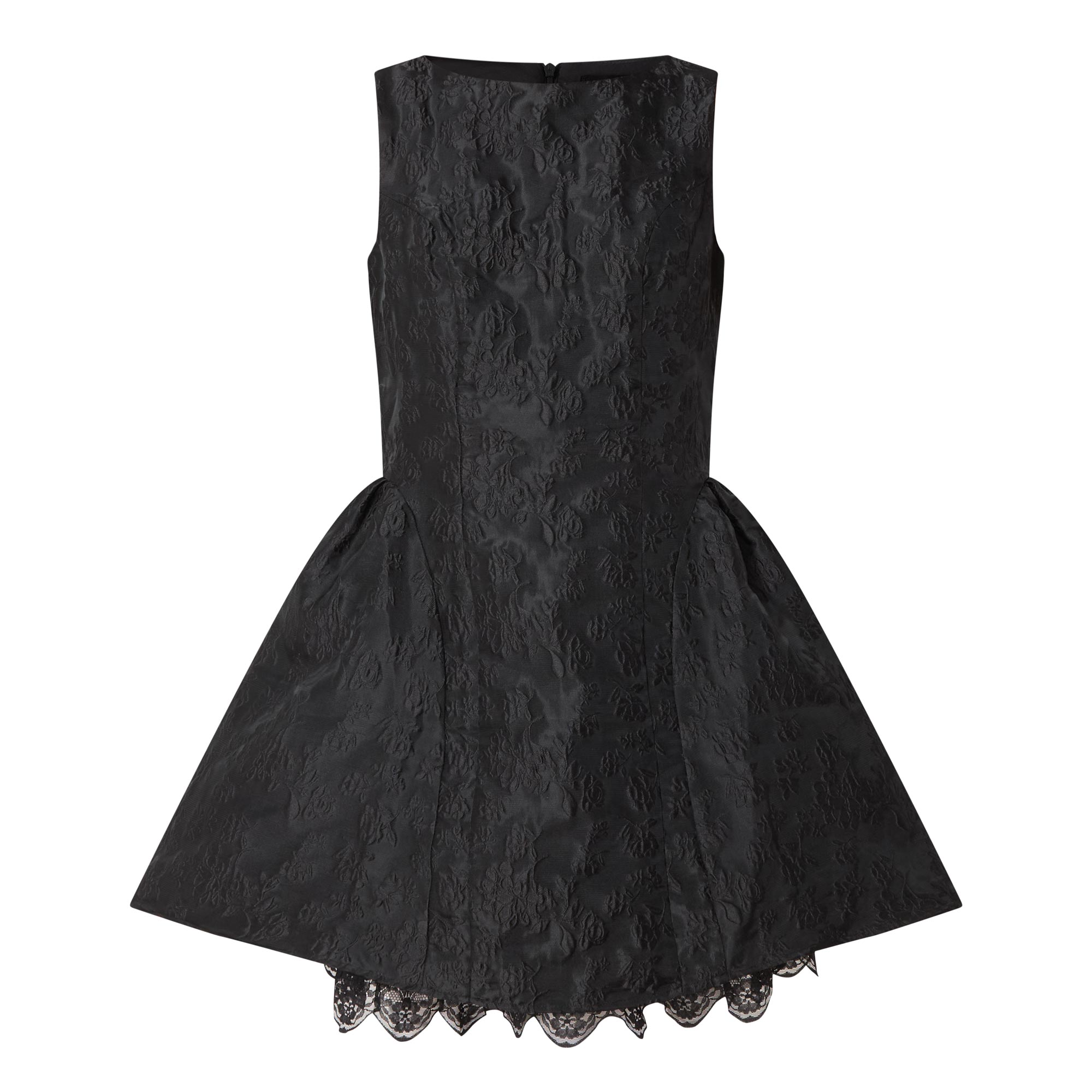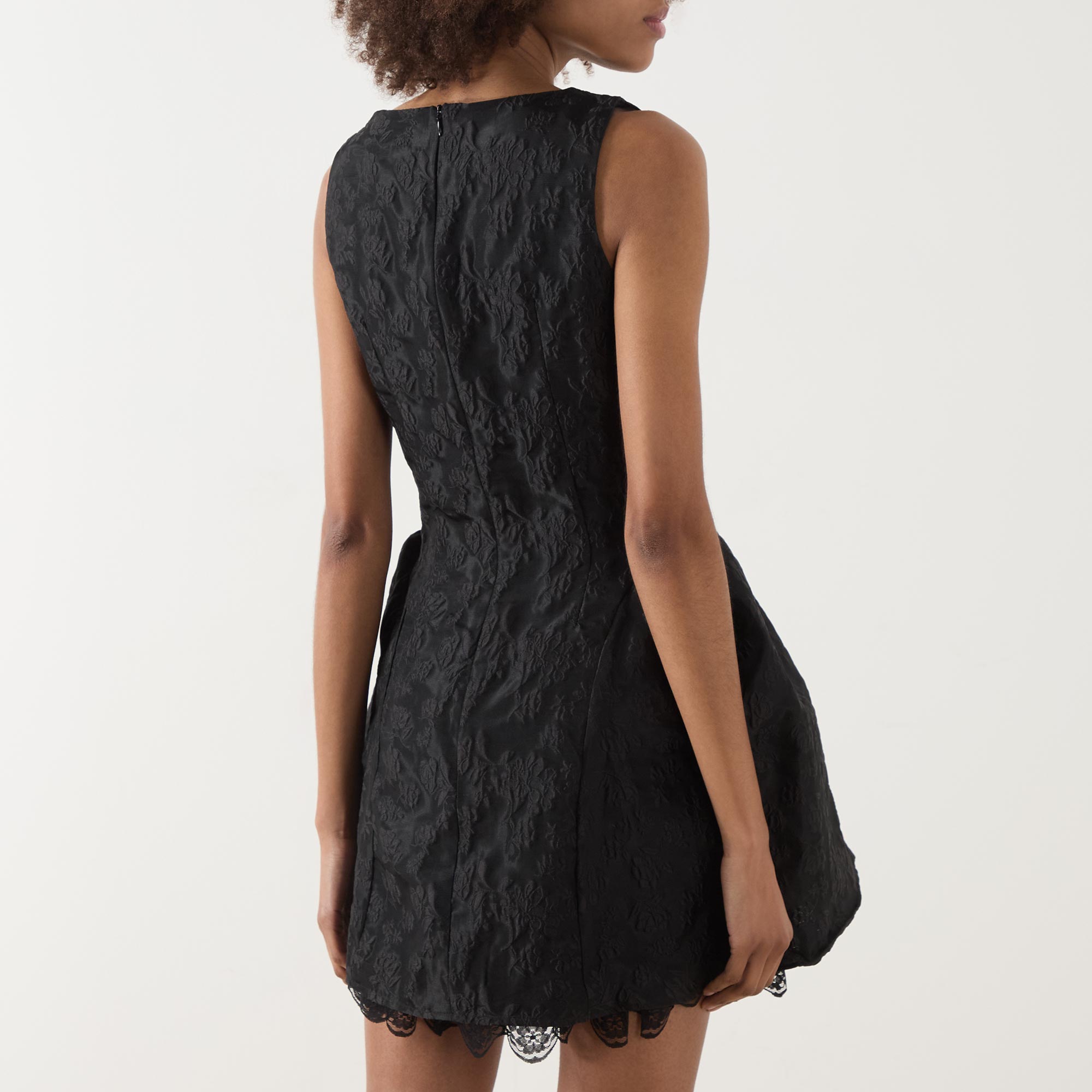 - Sleeveless, round neckline, back zip-fastening closure, tonal jacquard design, flared silhouette, lace trim hemline, mini length, textured finish
