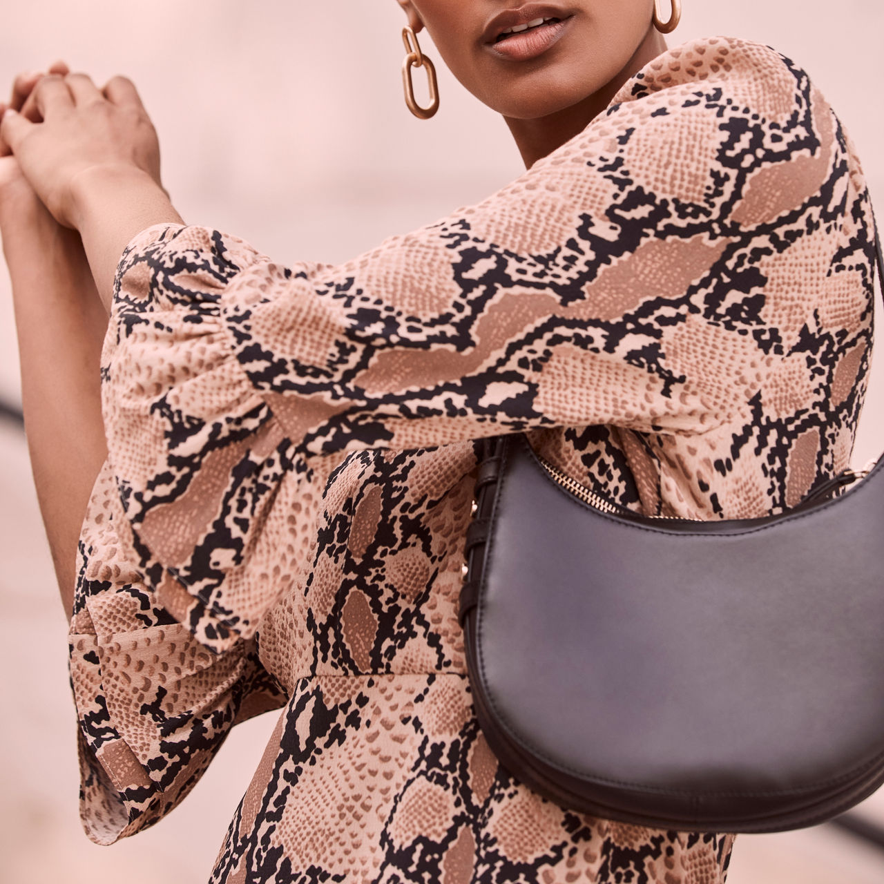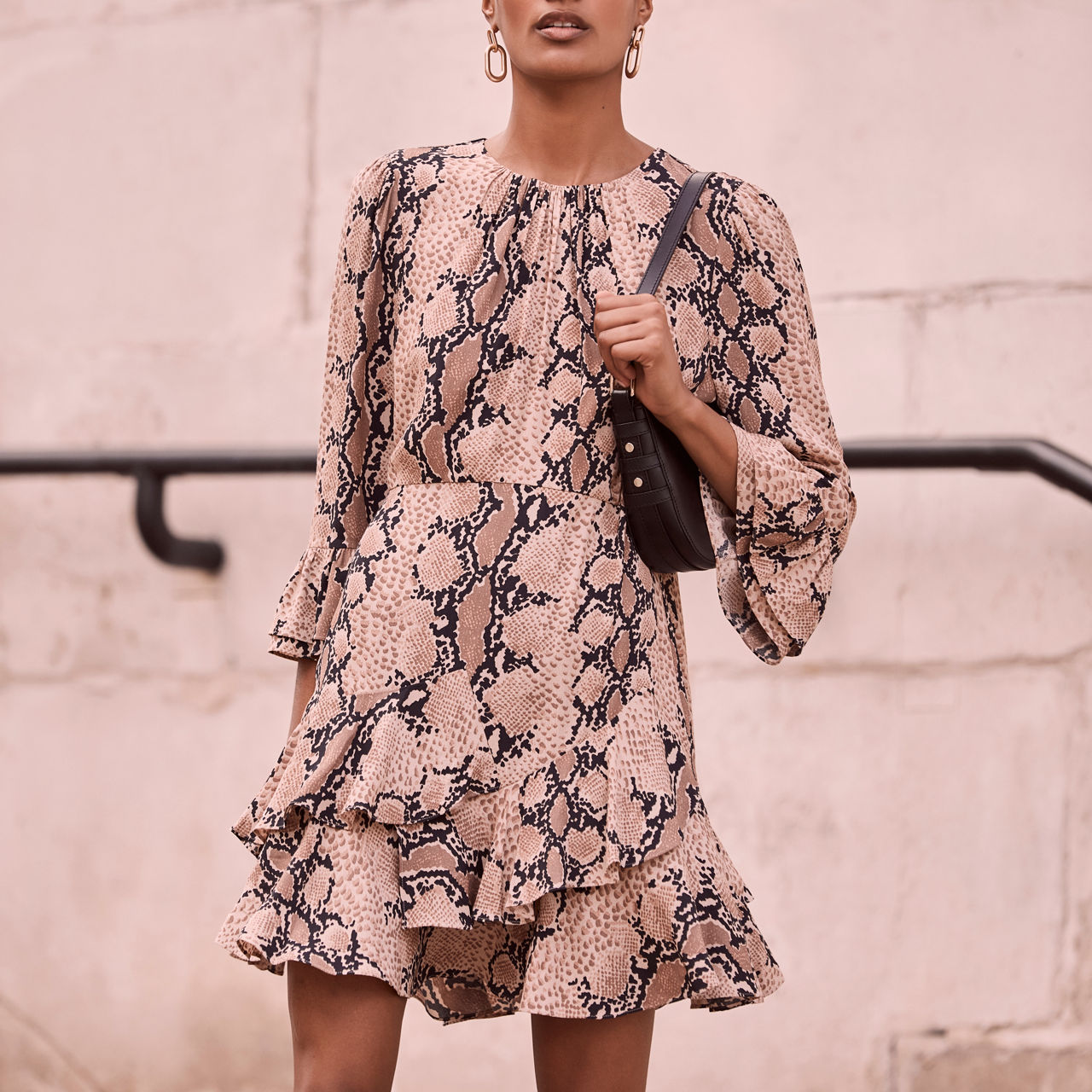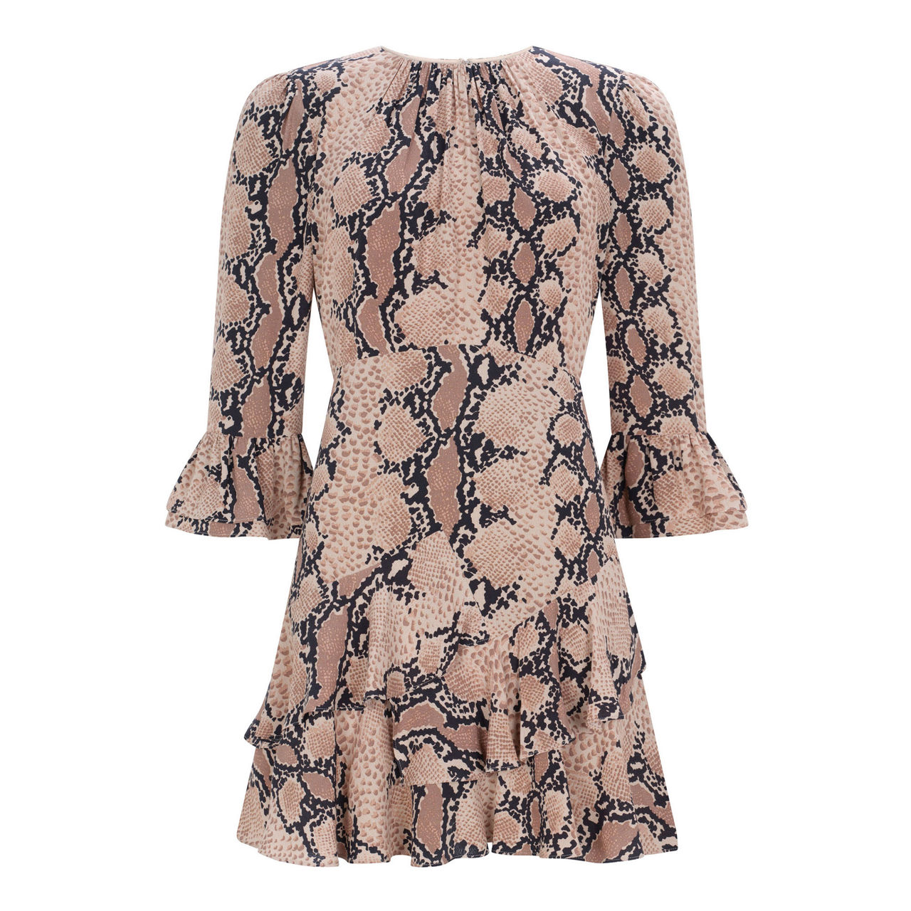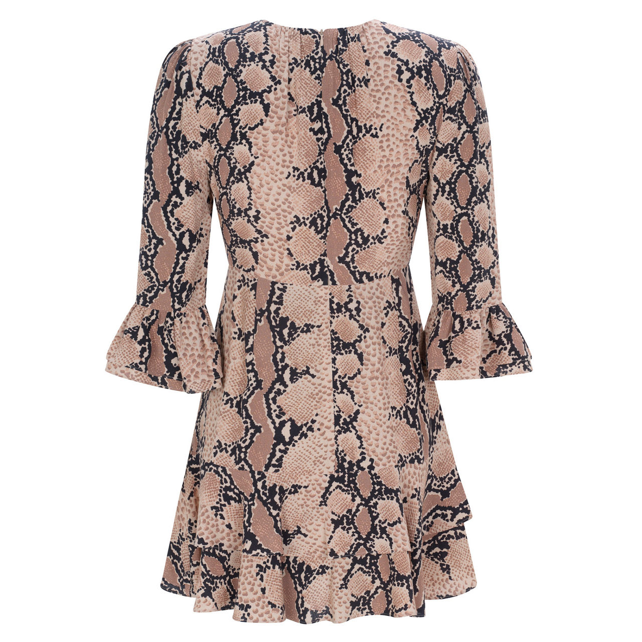 - Mini, three-quarter-length sleeves, round neckline, flared cuffs, tiered hemline, zip fastening at rear, snake print
