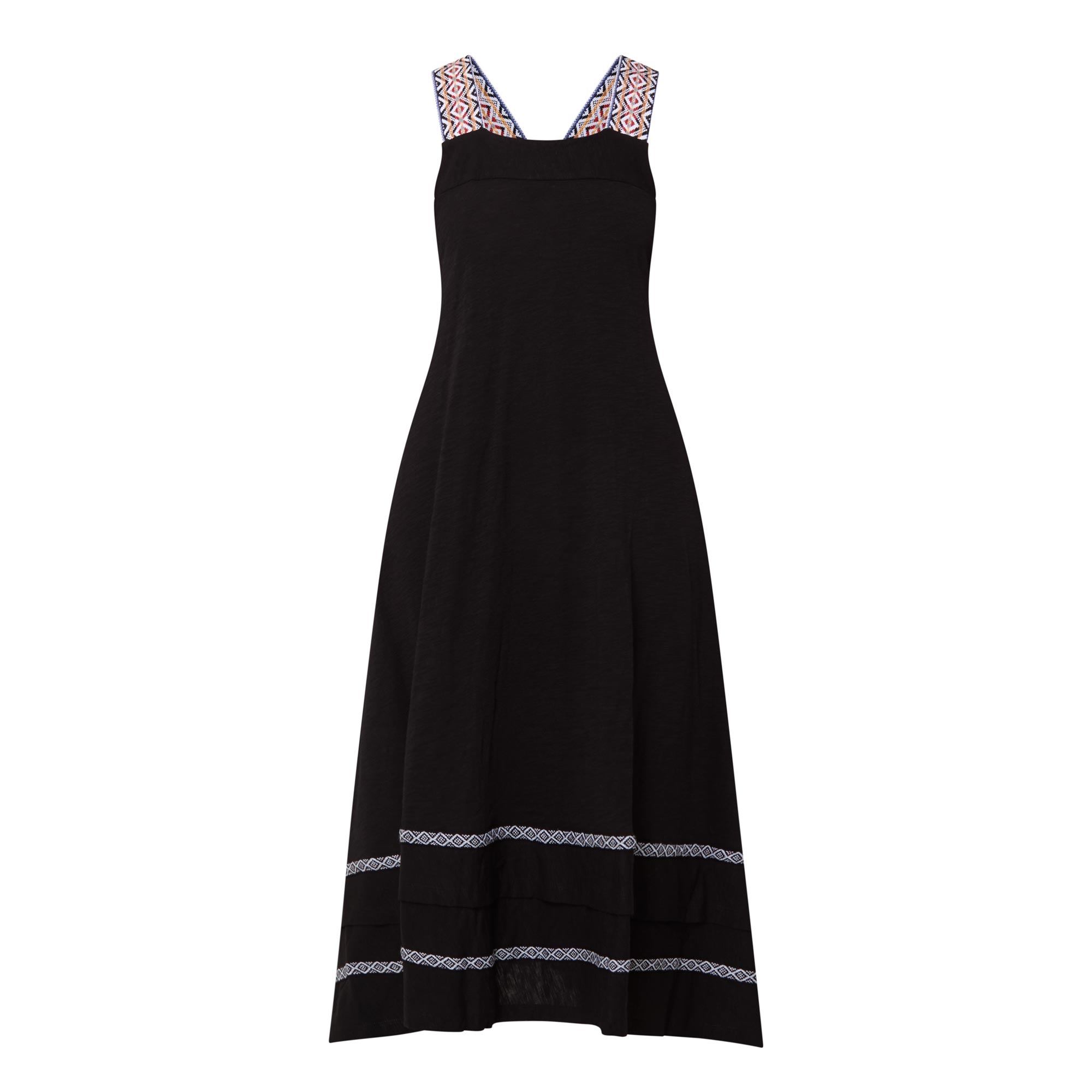 - Straight neckline, wide straps, racer-back style, double tiered layers, asymmetric hem, Inca detailing throughout, midi length
