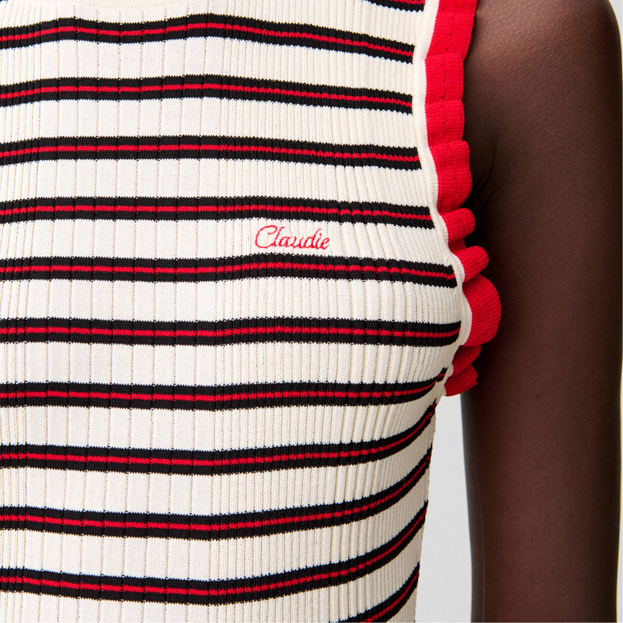 - Round neckline, striped pattern, contrast lettuce edge to armholes and hem, embroidered 'Claudie' monogram, ribbed knit