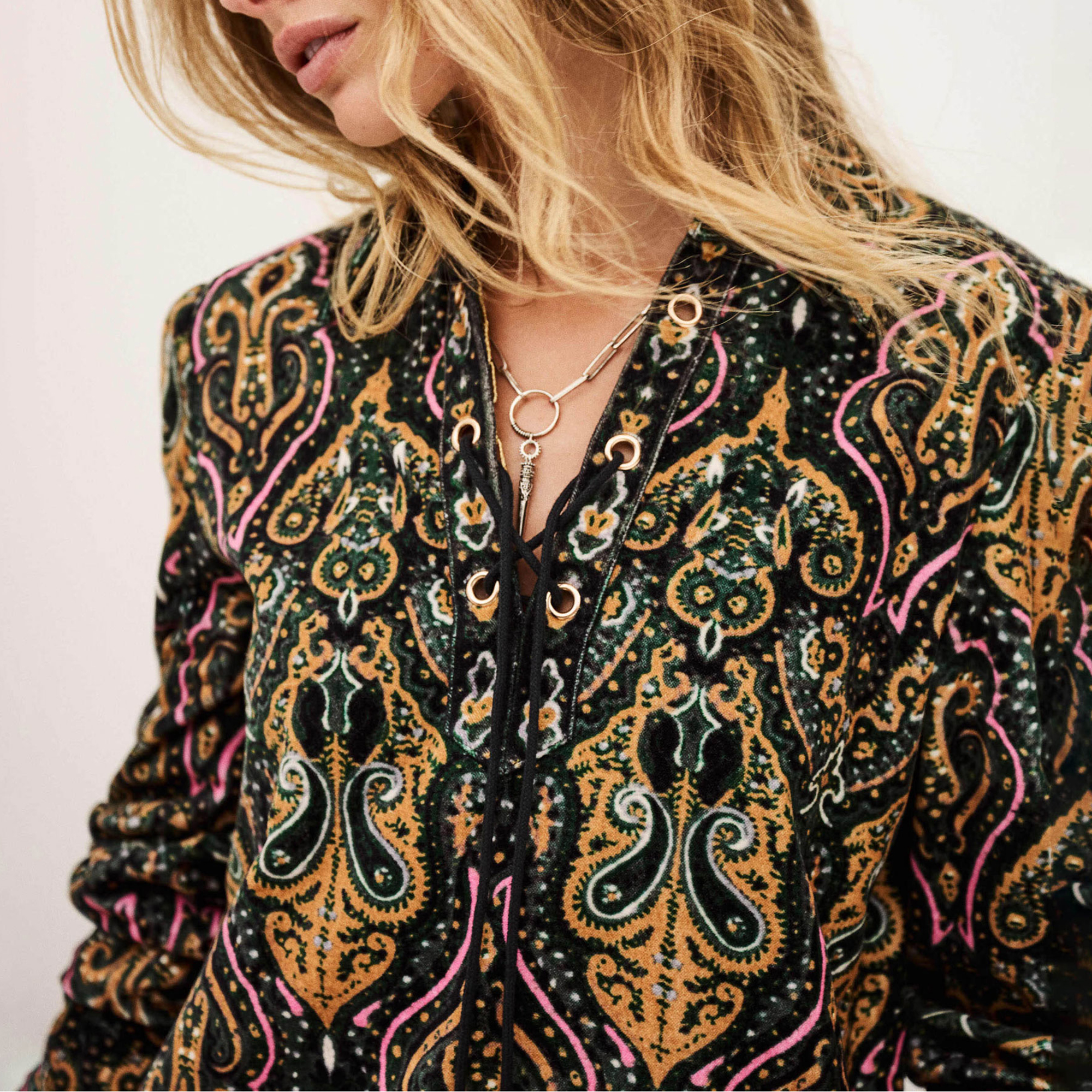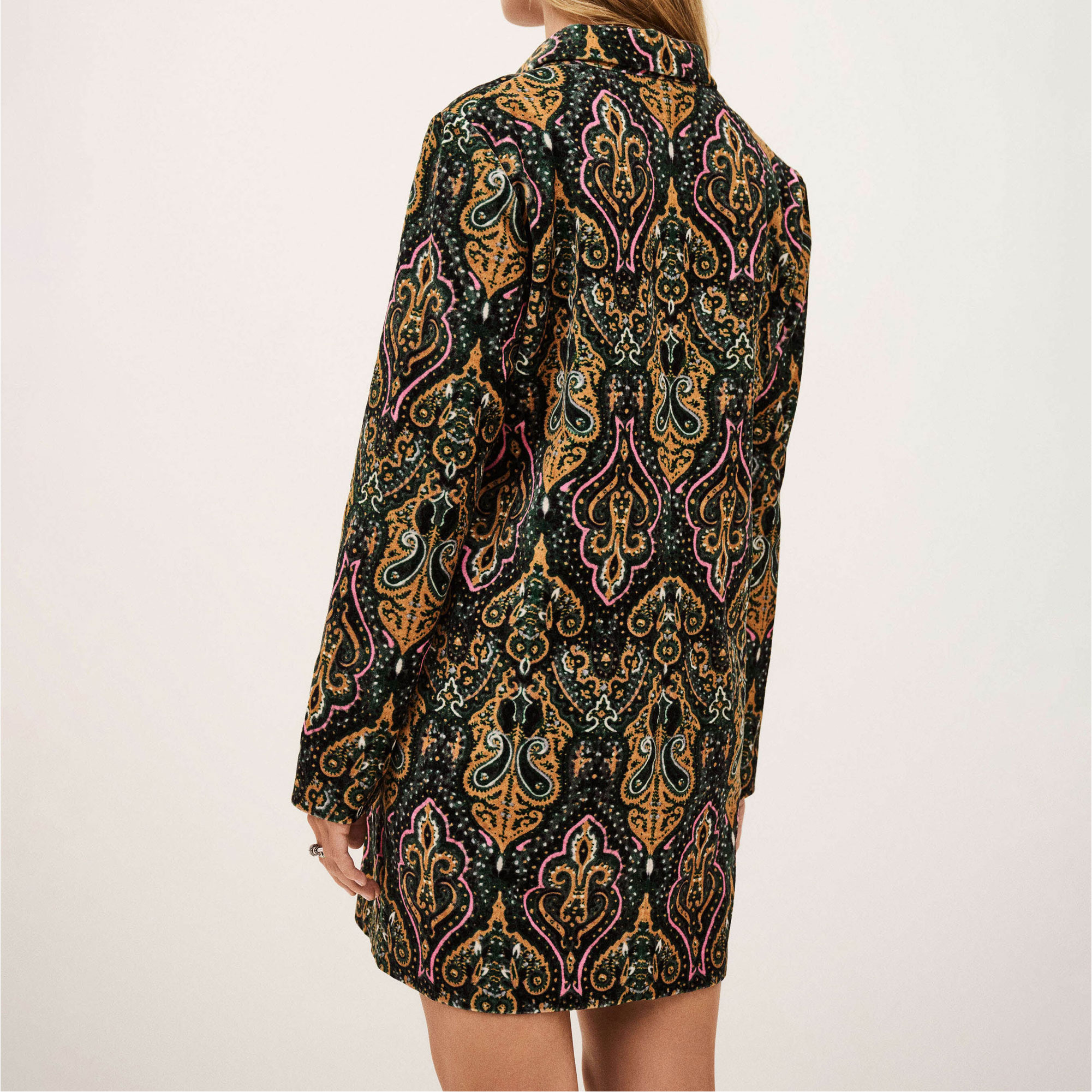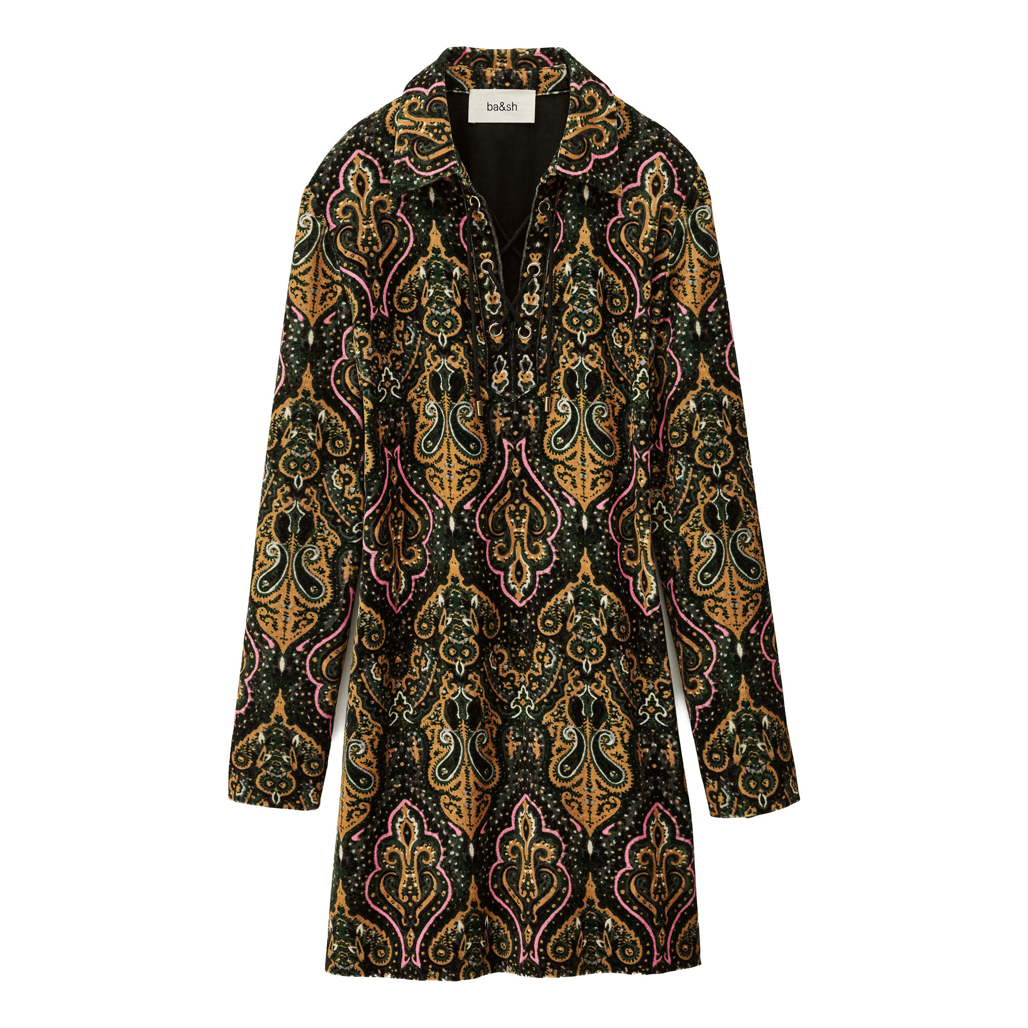 - Mini length, straight cut, shirt collar, lace-up fastening at front, top-stitched tab, side welt pockets, long sleeves, printed pattern
