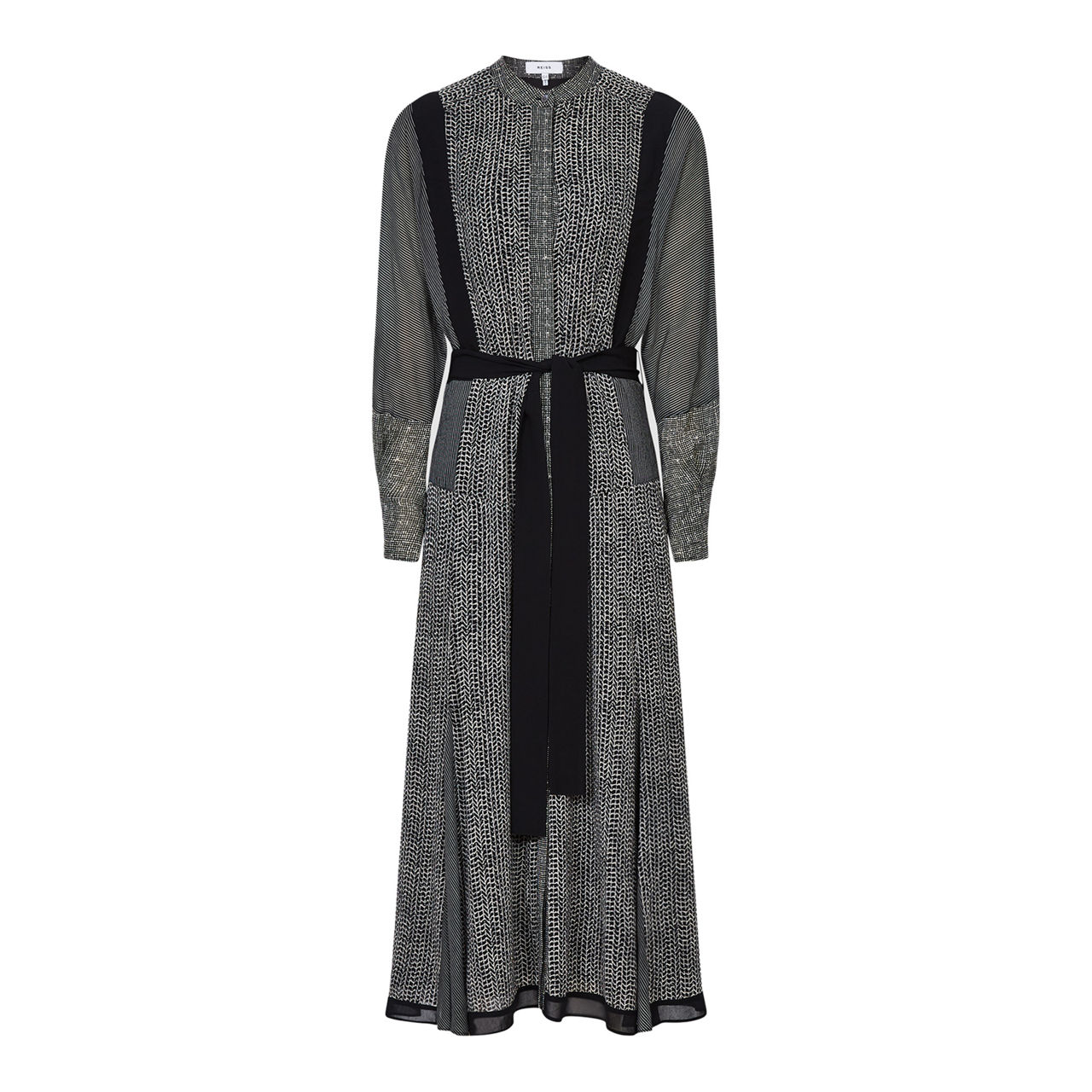 - Long sleeve, button fastening, grandad collar, midi length, belt tie detail, mixed pattern.