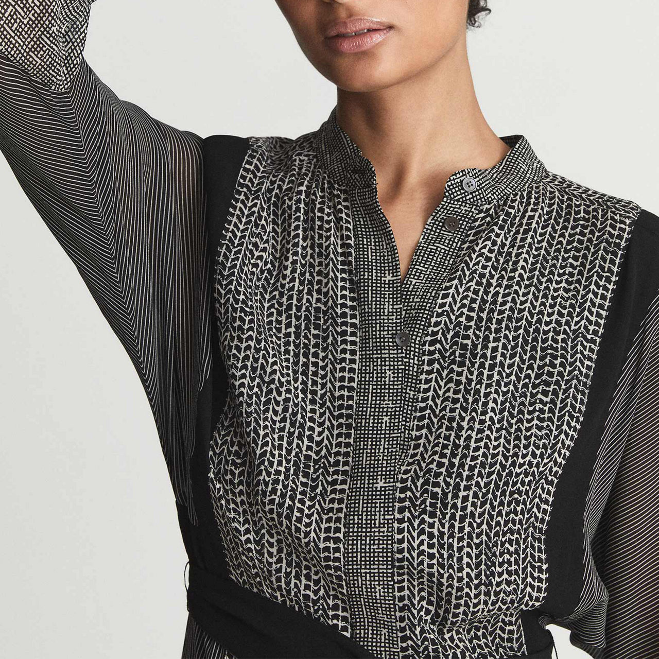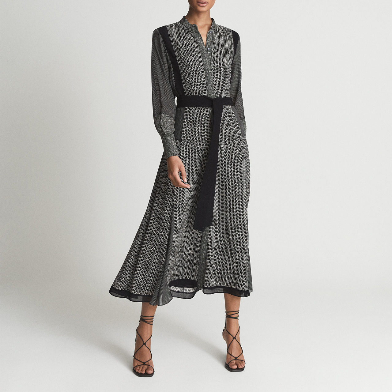 Cut from a flowing lightweight fabric, the Tanis dress from Reiss works three different patterns for an interesting yet elegant finish. With a contemporary grandad collar, it ties at the waist with a bold belt tie for a cinched look. Team with heeled ankle boots for a chic finish.