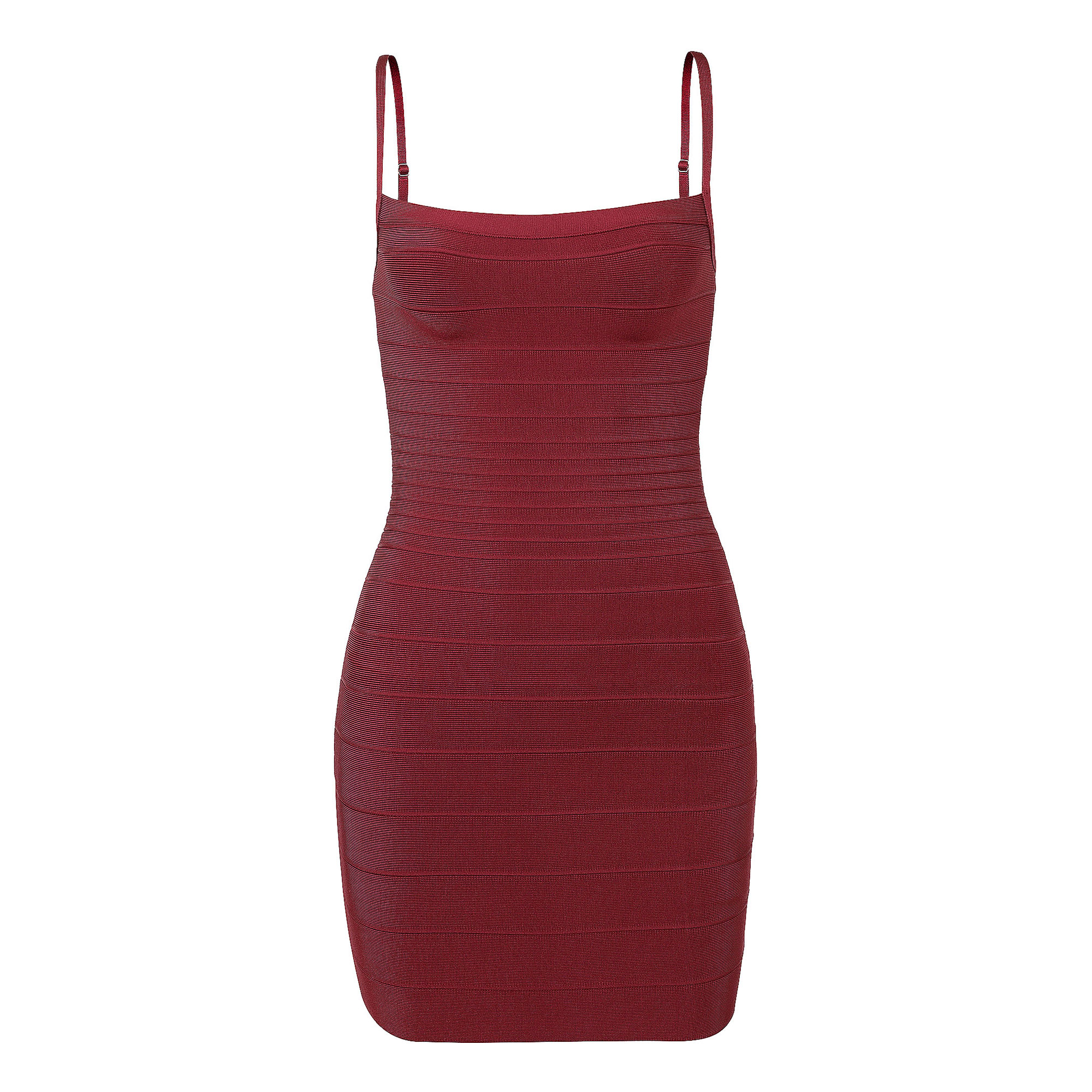 - Bandage silhouette, mini length, square neckline, adjustable thin straps, fully panelled, stretch-fused fabric, bodycon style