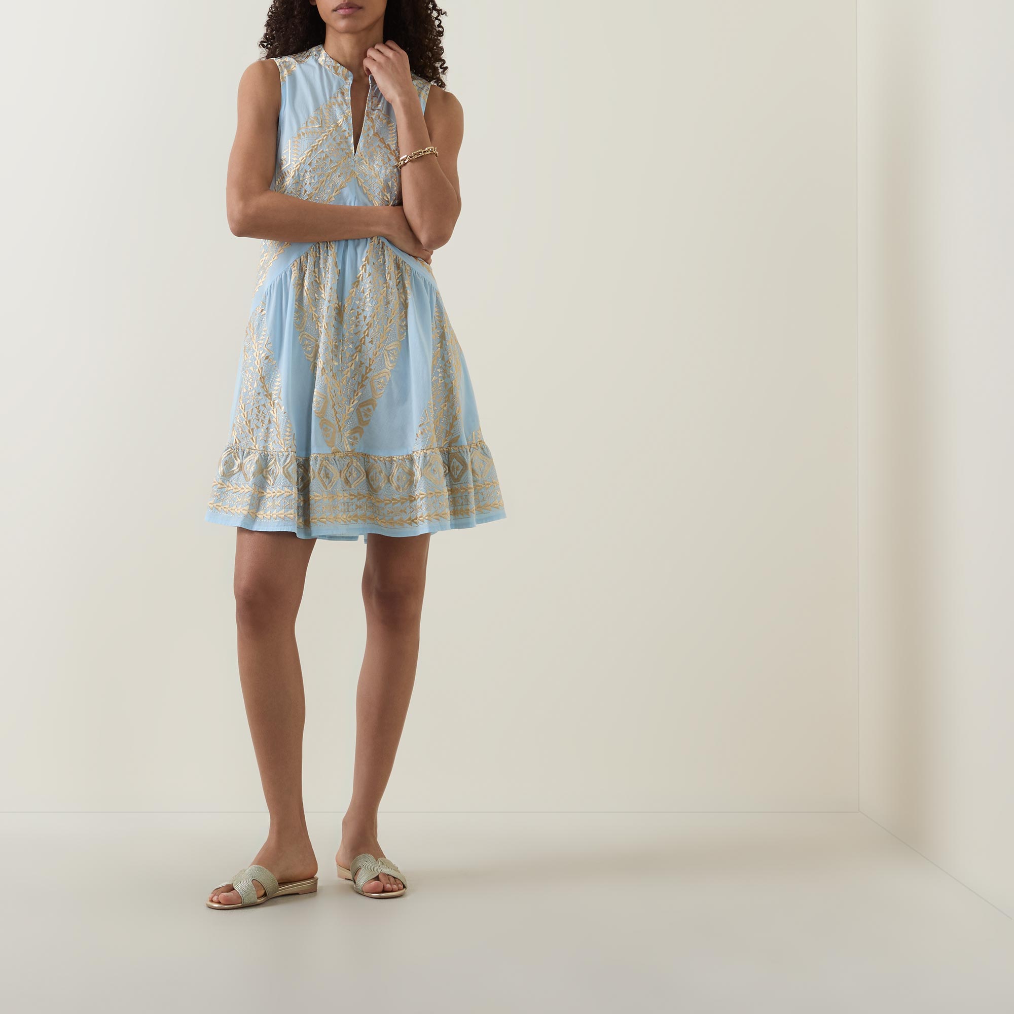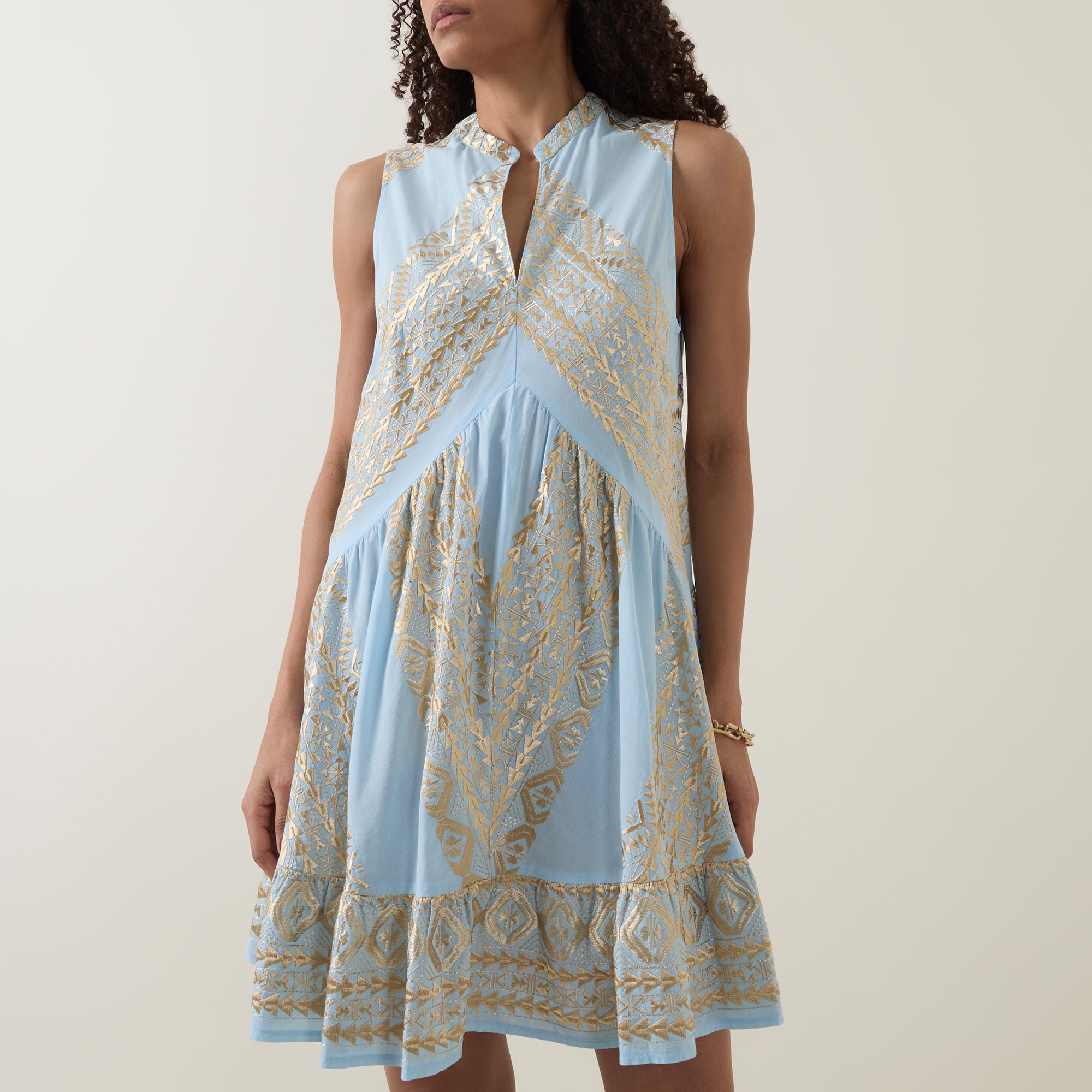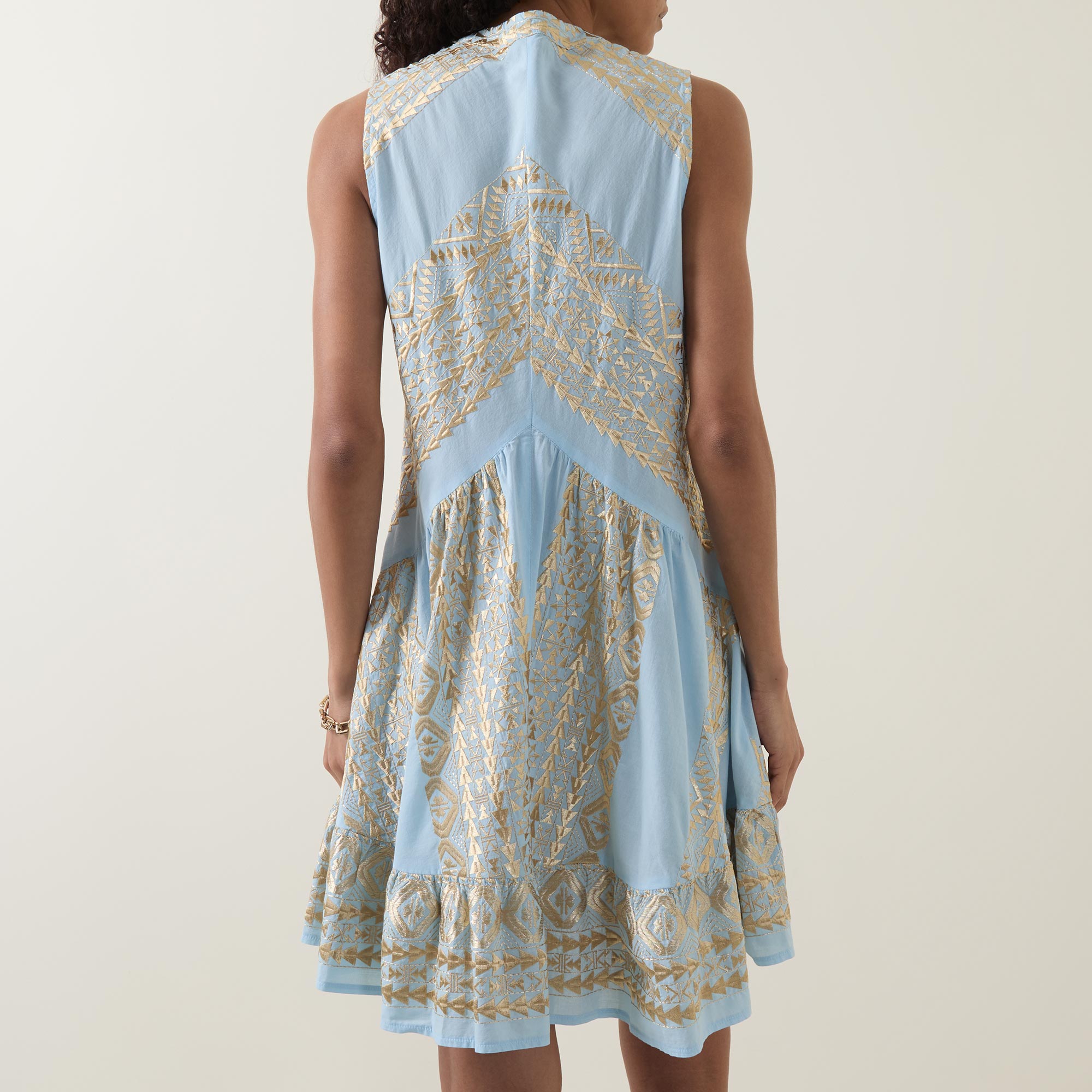 - Stand collar, V-neckline, sleeveless design, under bust stitching, dropped waistline, flared hem, embroidered detailing throughout, mini length