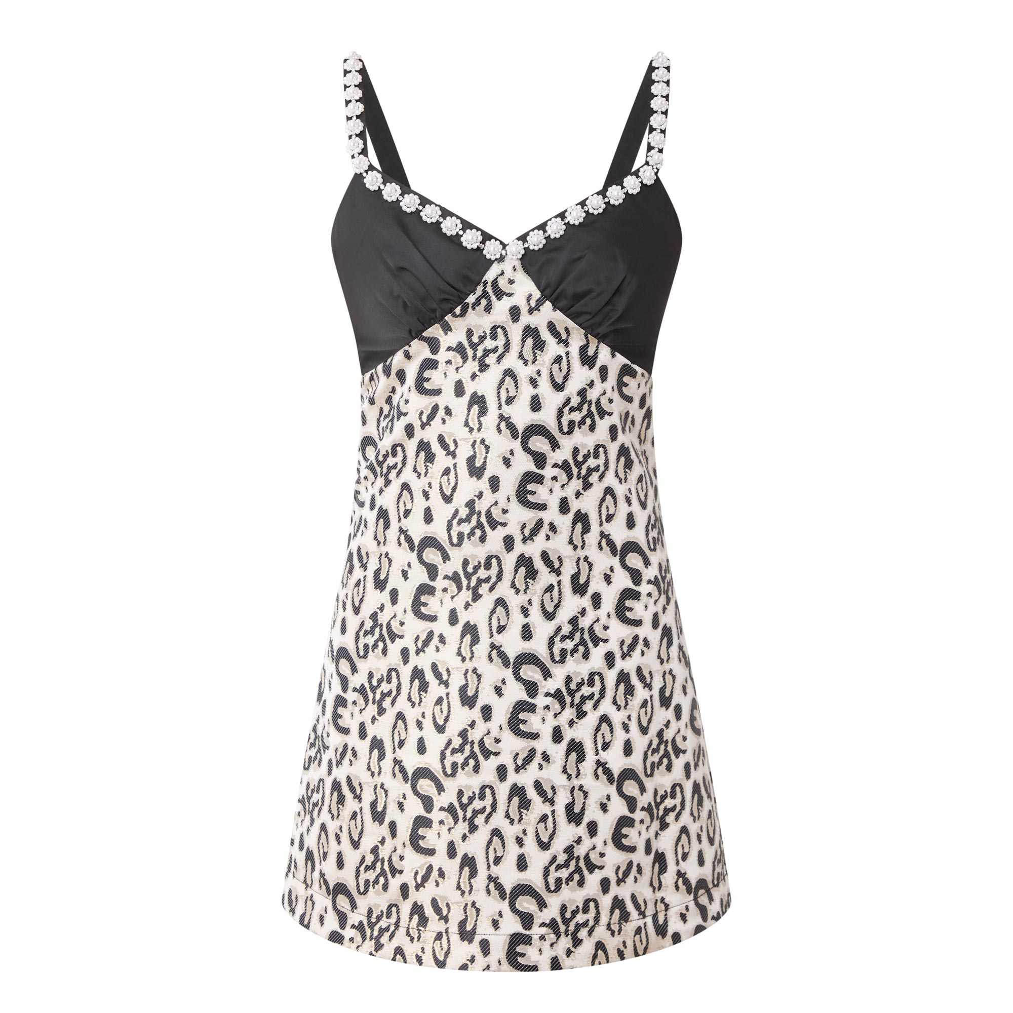 - V-neckline, fixed straps, pearl trimming, rear zip fastening, satin bodice, flared skirt, metallic leopard jacquard fabric, mini length, lined