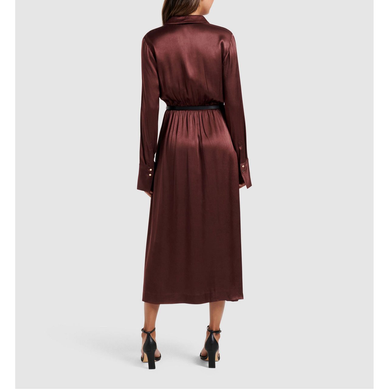 - Regular fit, lustrous satin fabrication, classic shirt collar, full-length blouson sleeves, deep cuffs, elasticised waist, flowing midi skirt, button-through front, lined.
