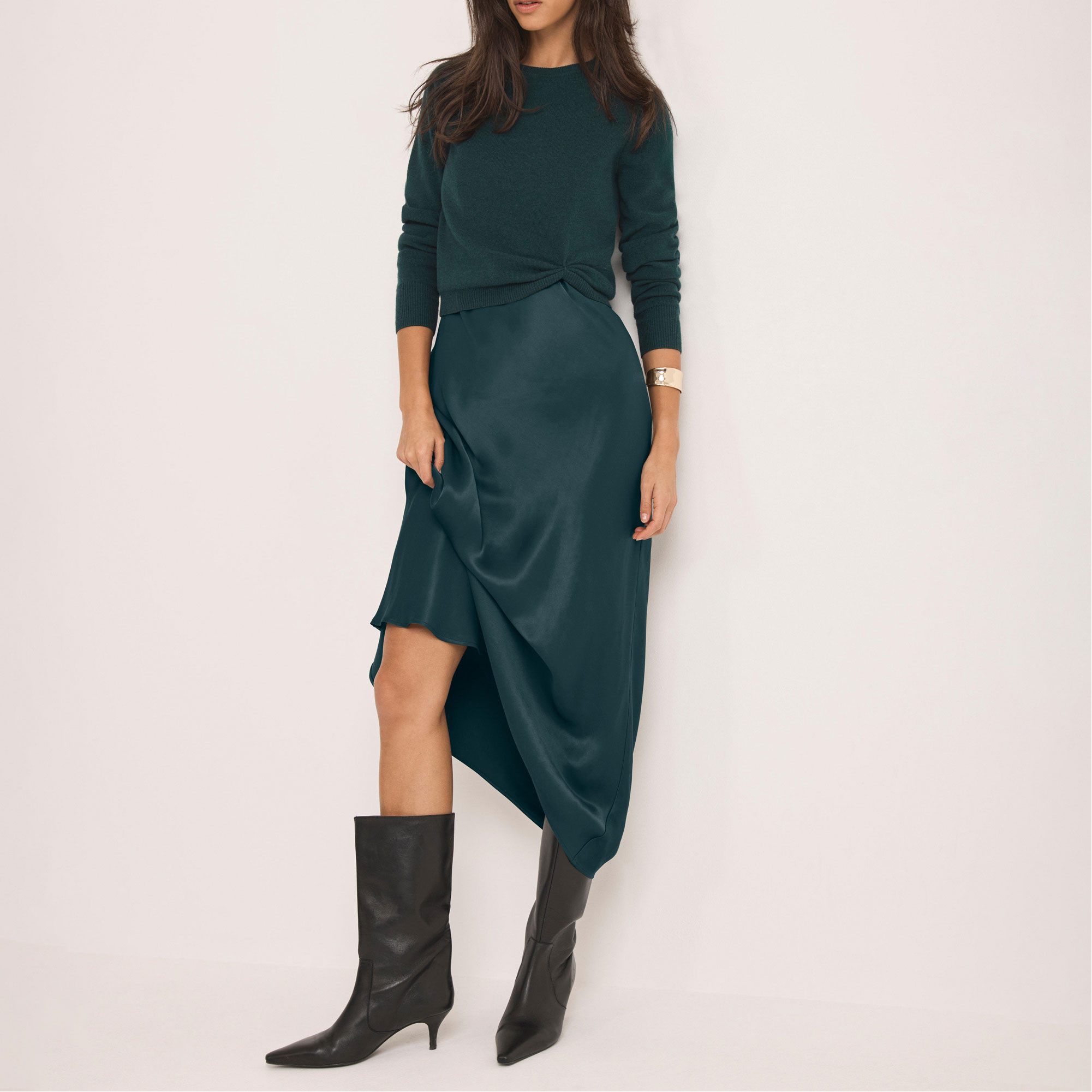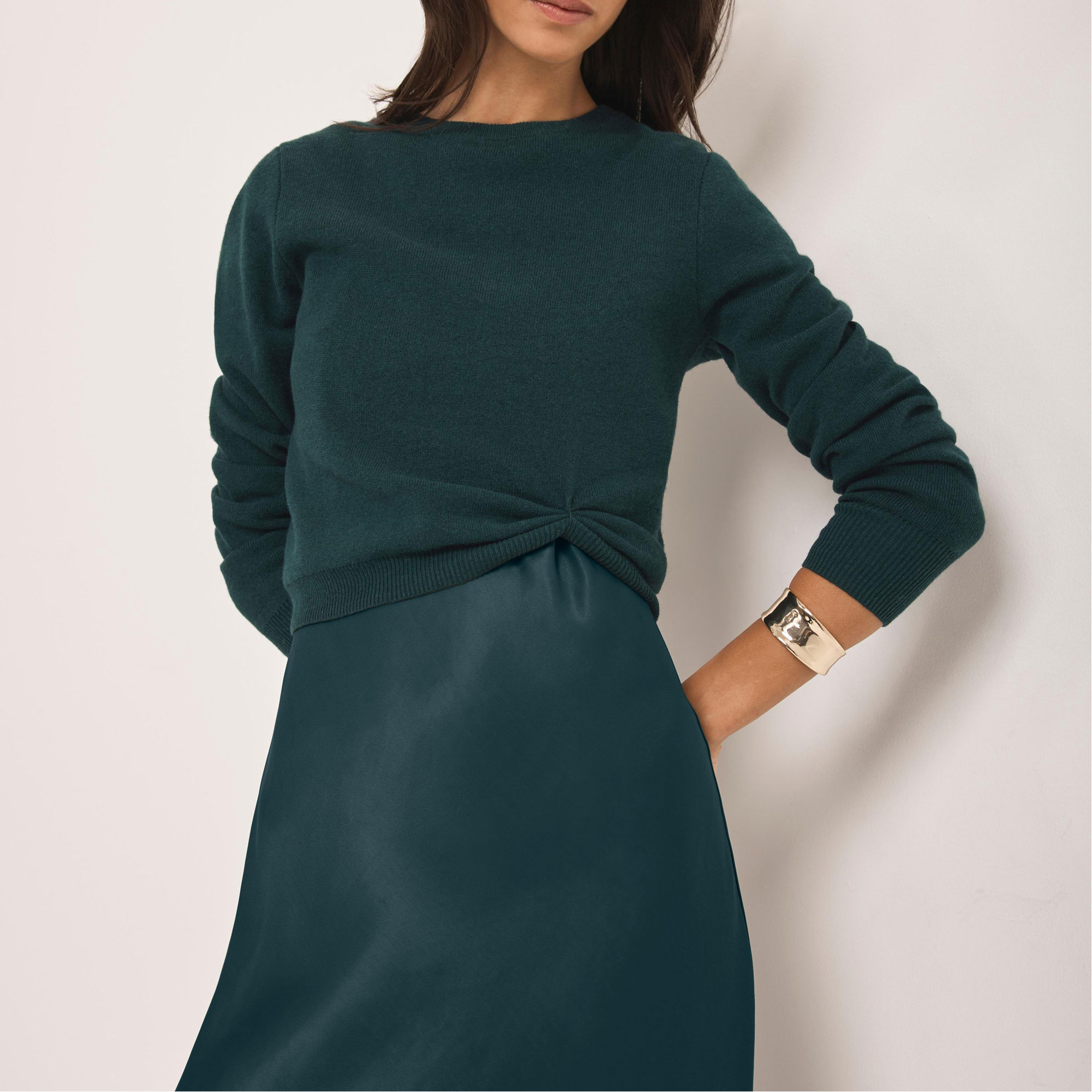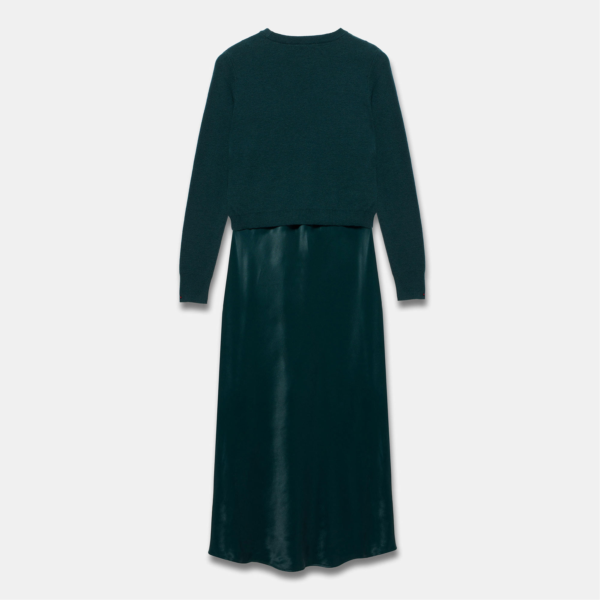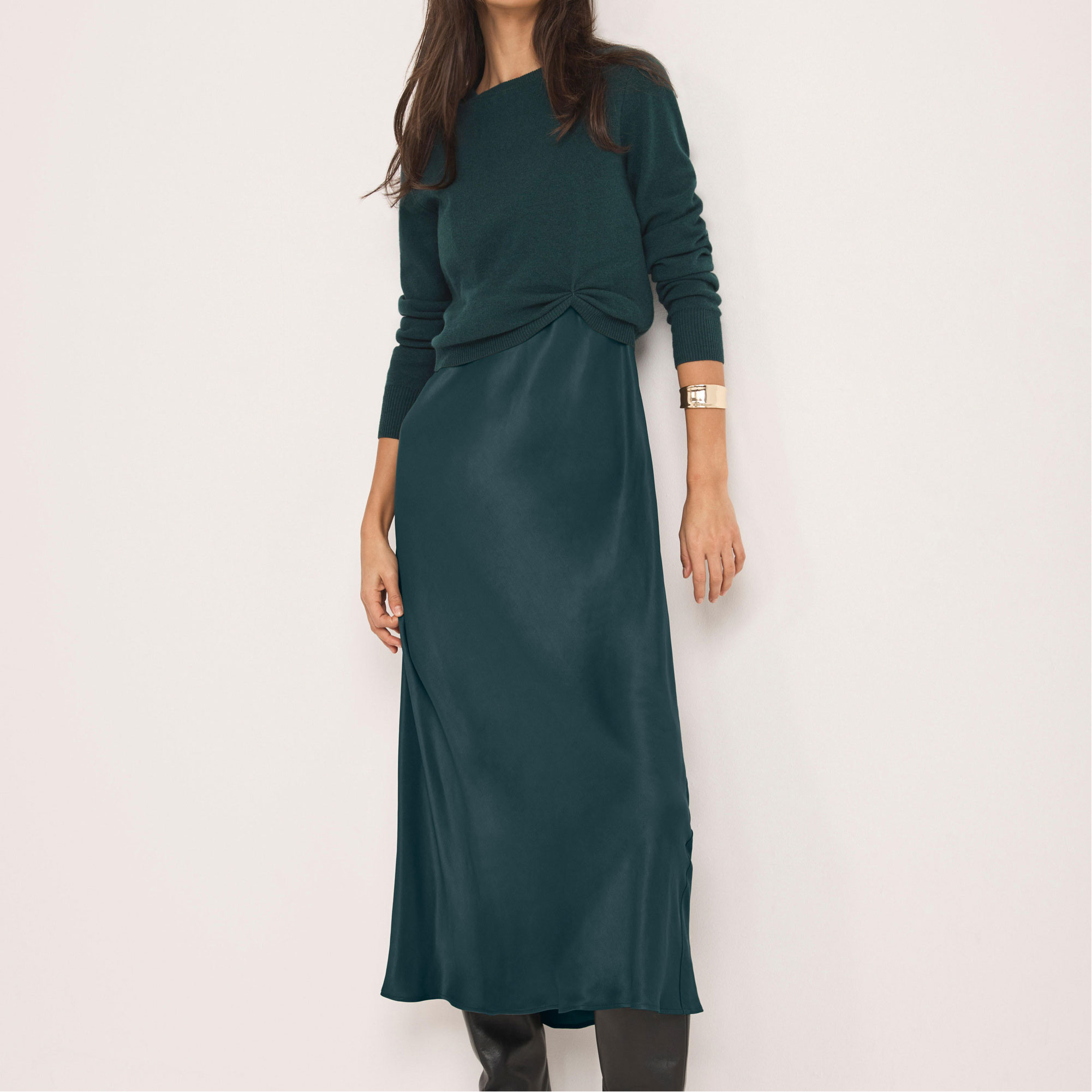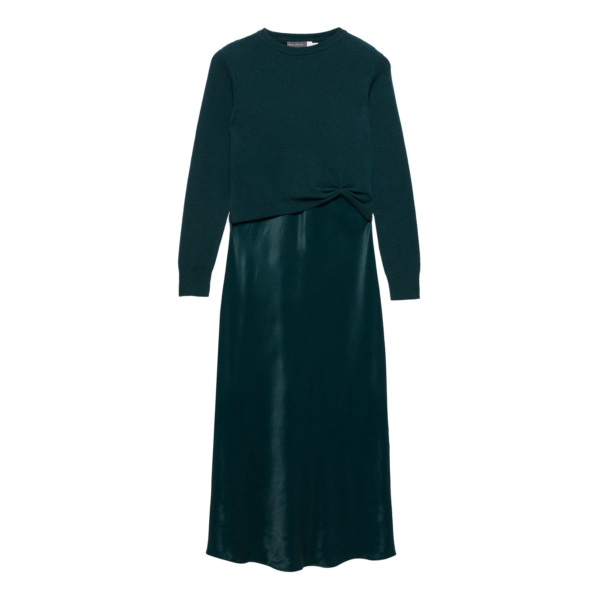 - Layered midi dress, crew neckline, long sleeves, gathered waist detail, bias cut hemline