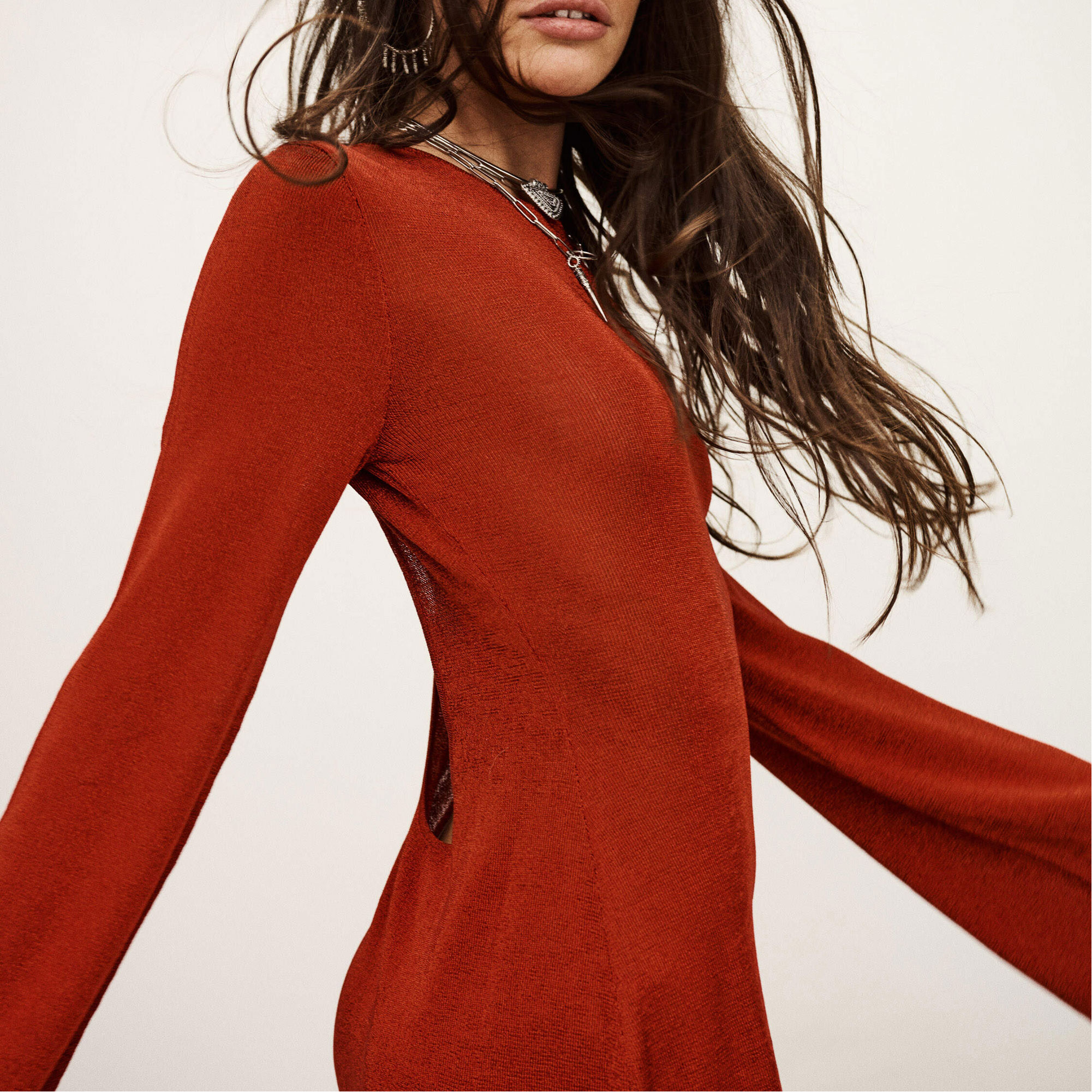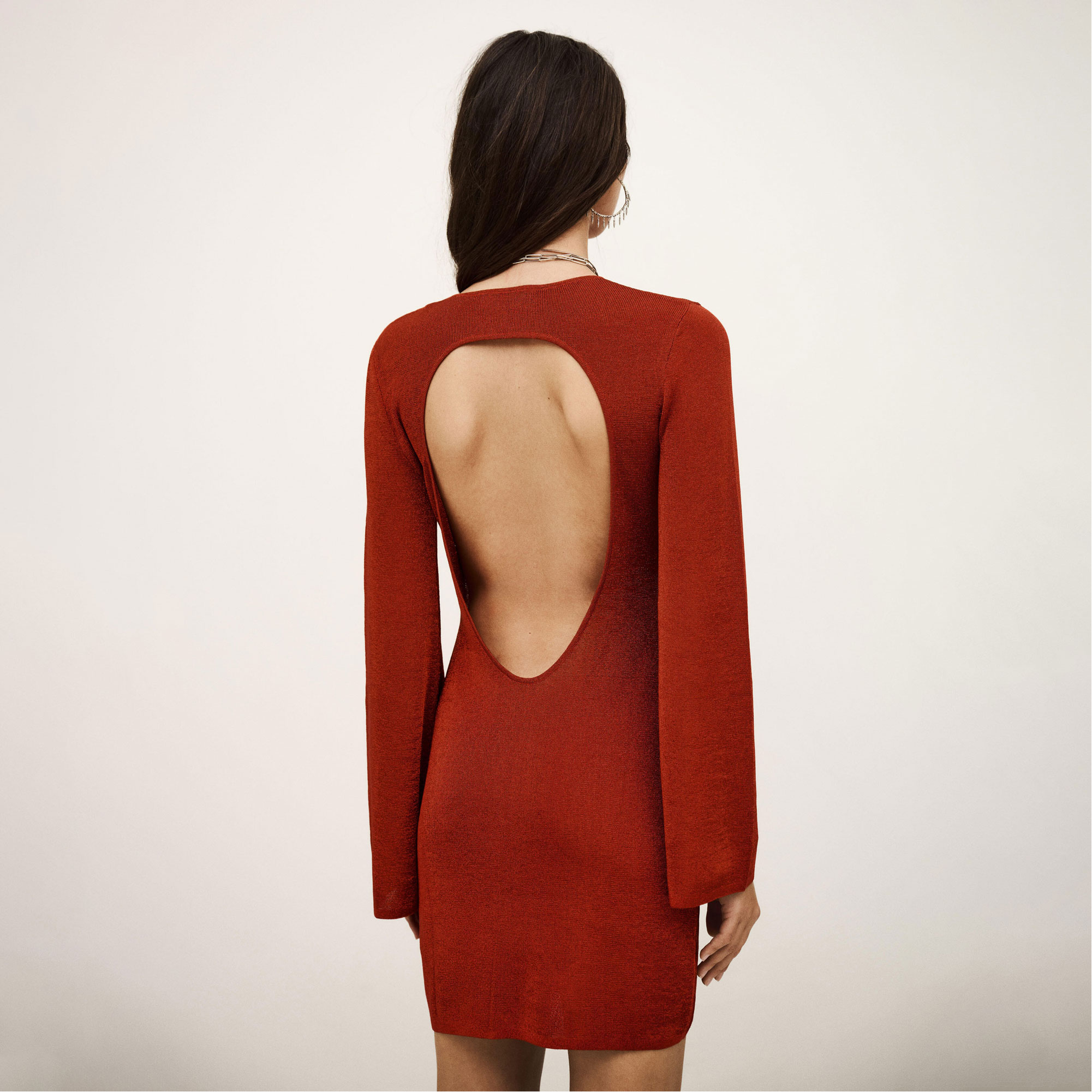 - Long sleeves, round neckline, backless style