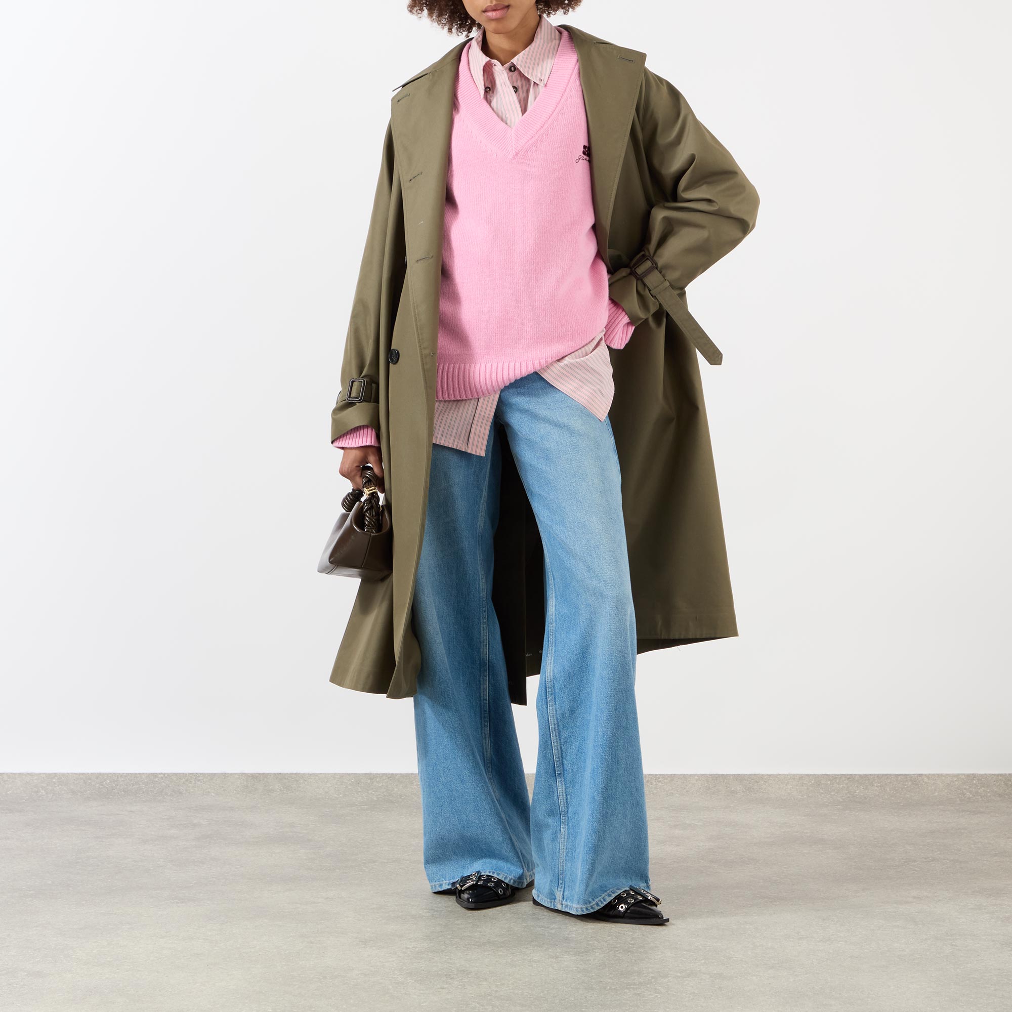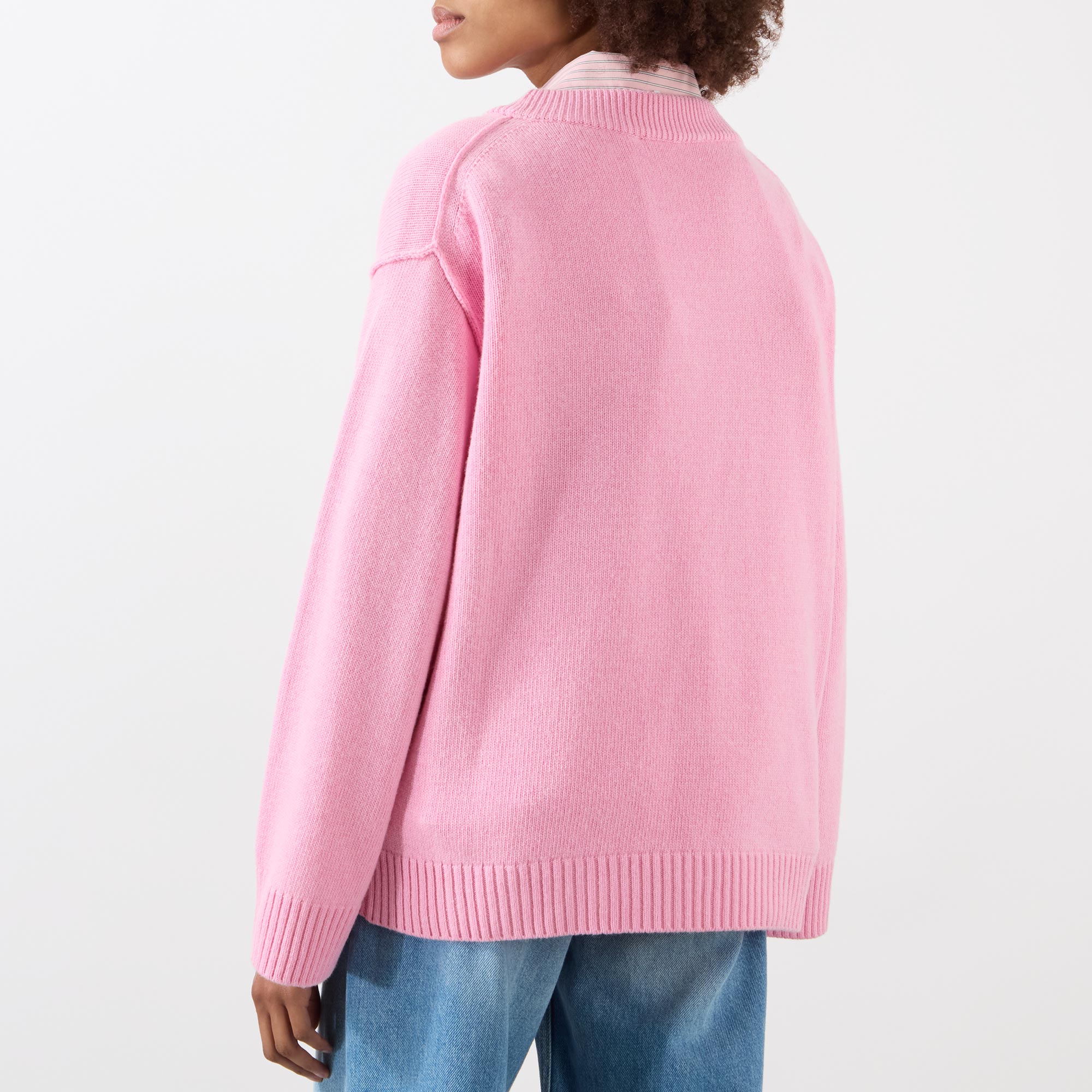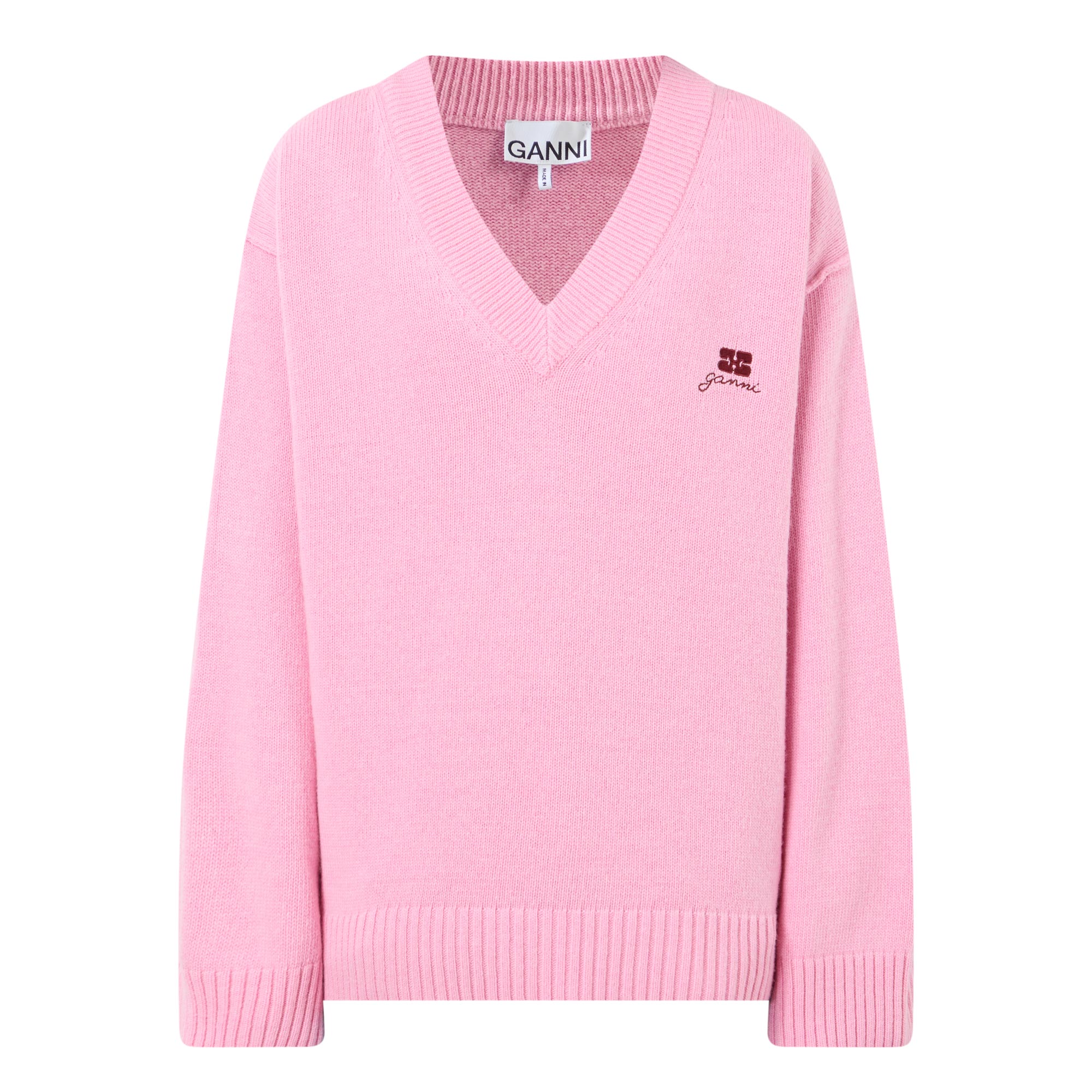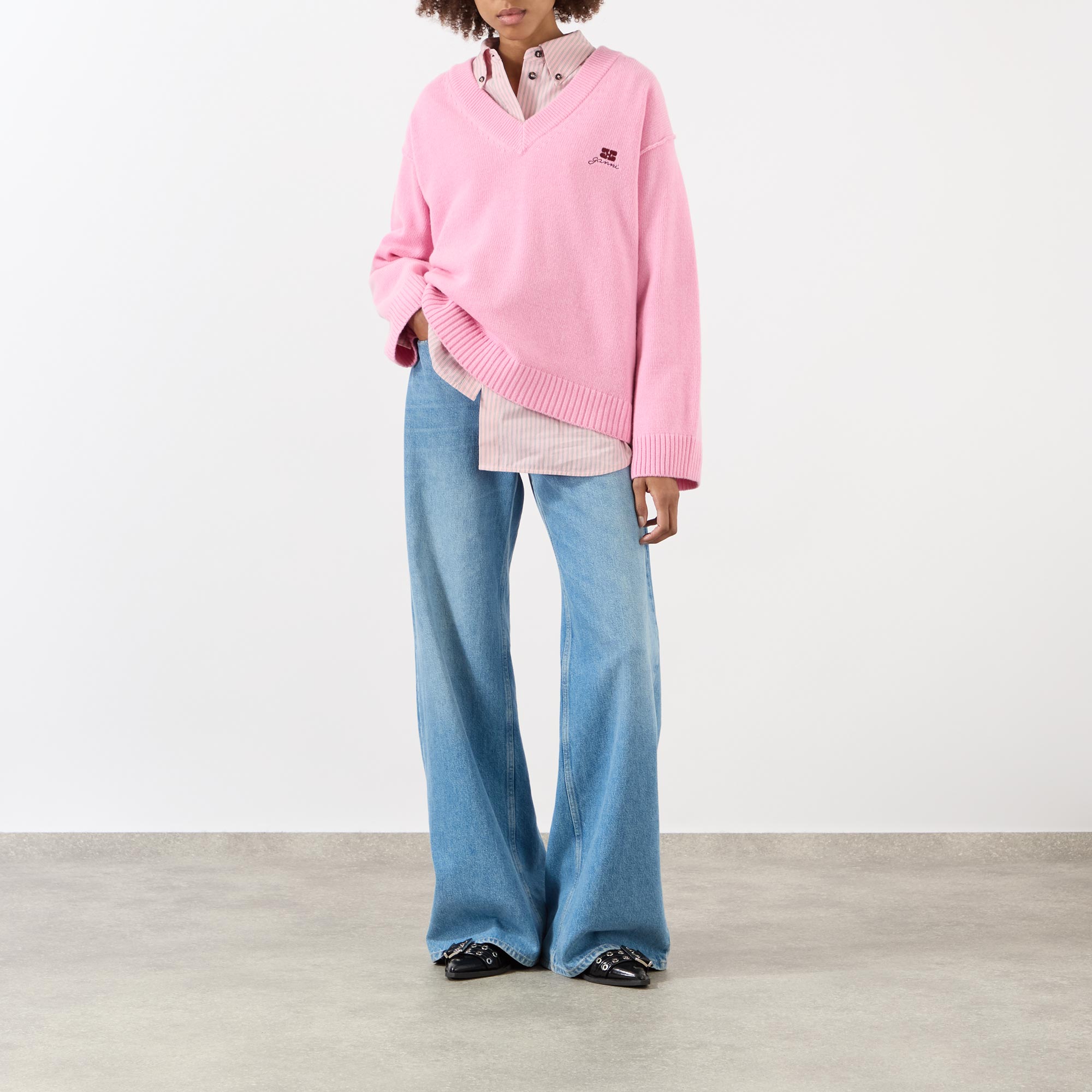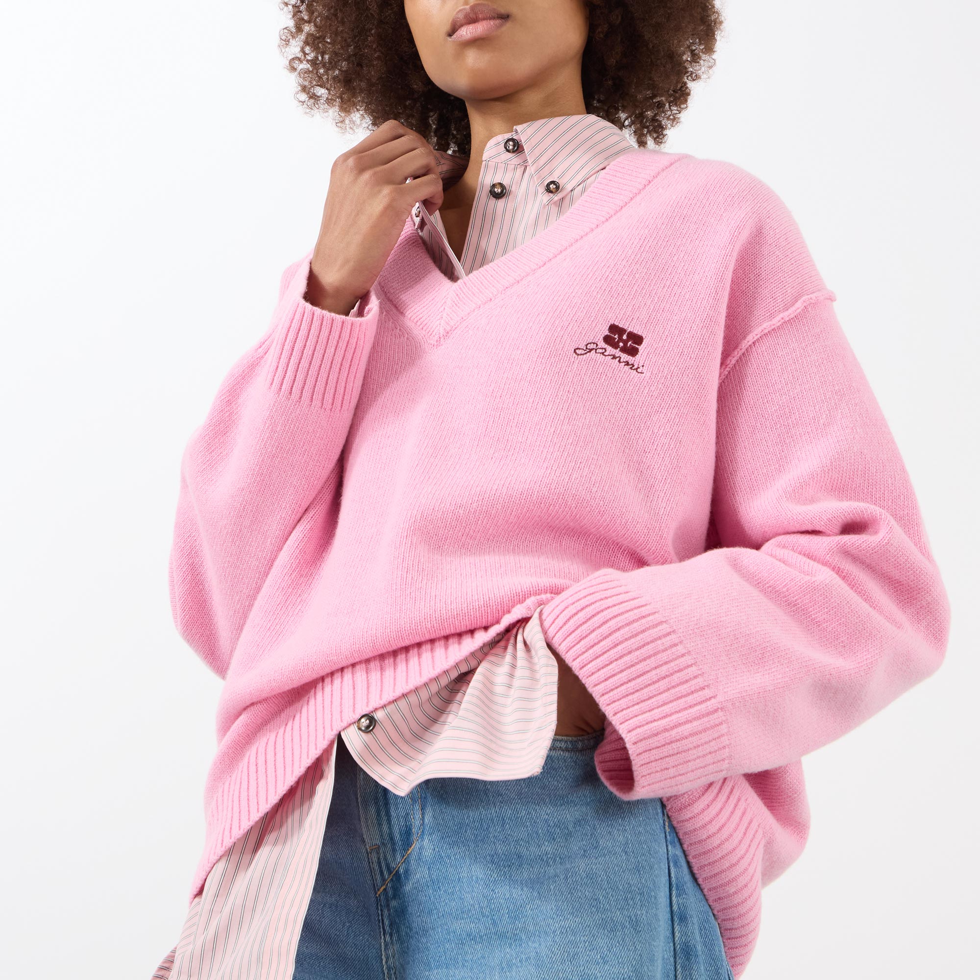 - V-neckline, long sleeves, dropped shoulders, inverted seams, ribbed trims, butterfly logo embroidery, pullover style, knitted finish