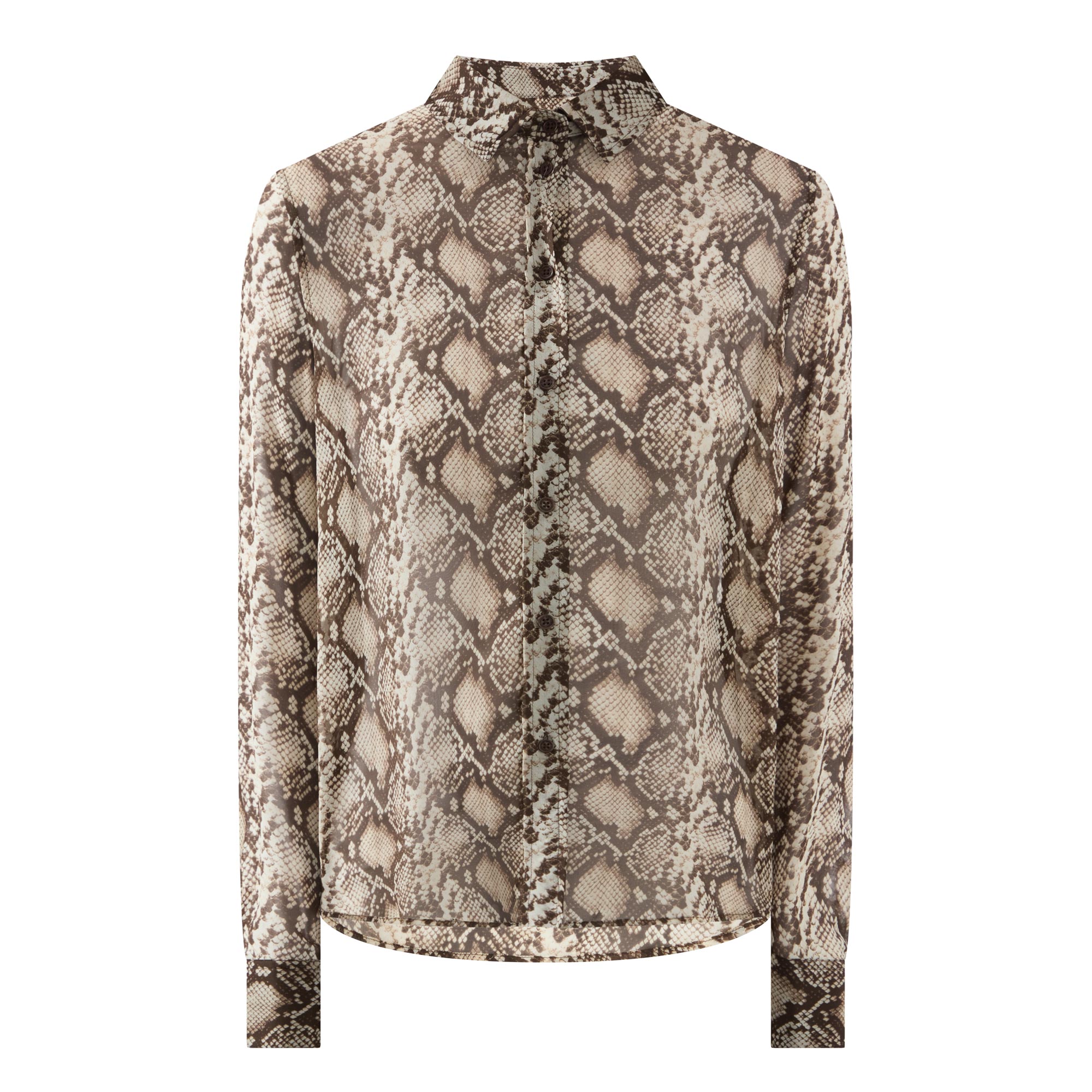 • Point collar, long sleeves, buttoned cuffs, front button fastening, curved hem, snake print pattern, semi-sheer finish