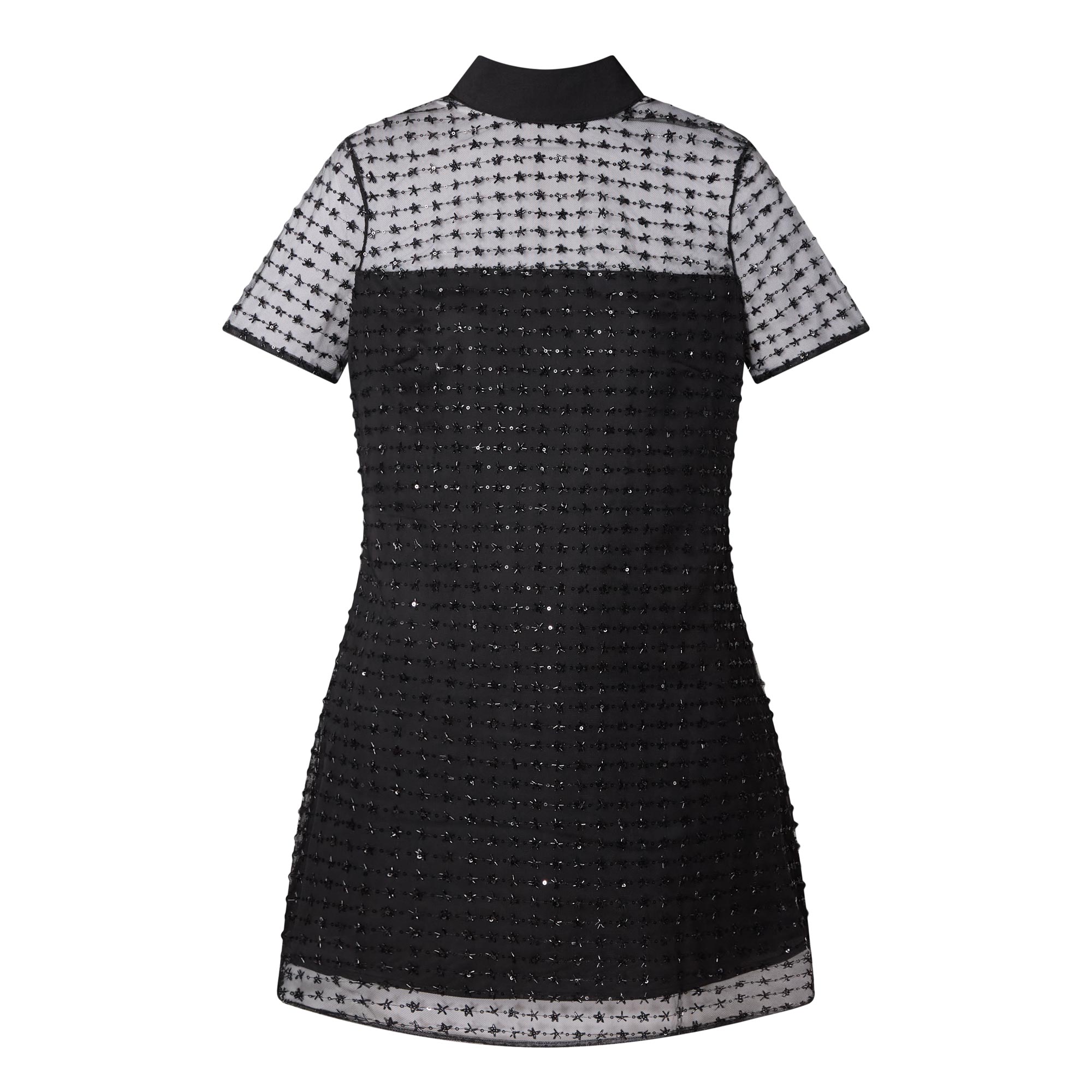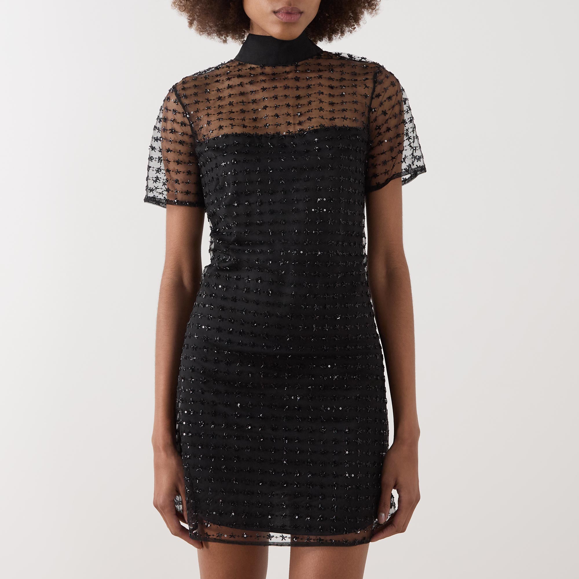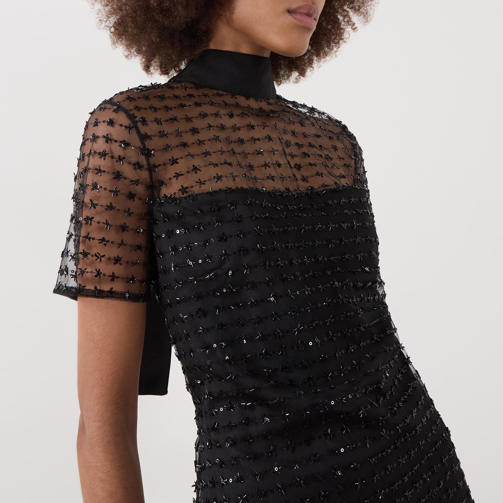 • Short sleeves, high neckline with self-tie bow, back zip-fastening closure, sheer shell crafted from embellished tulle, mini length