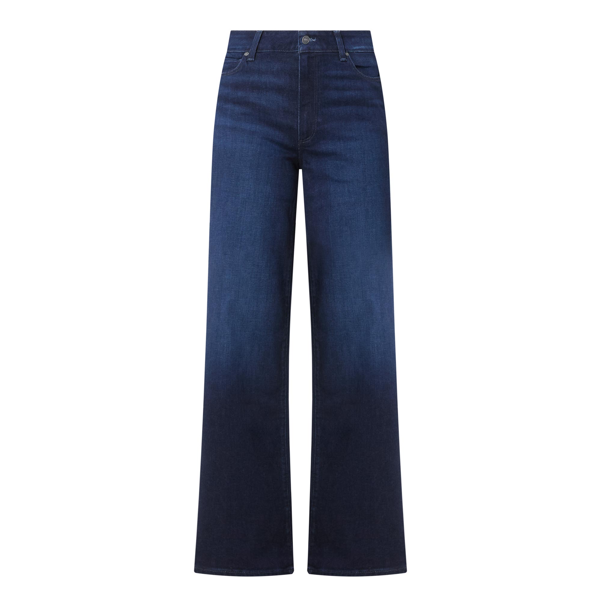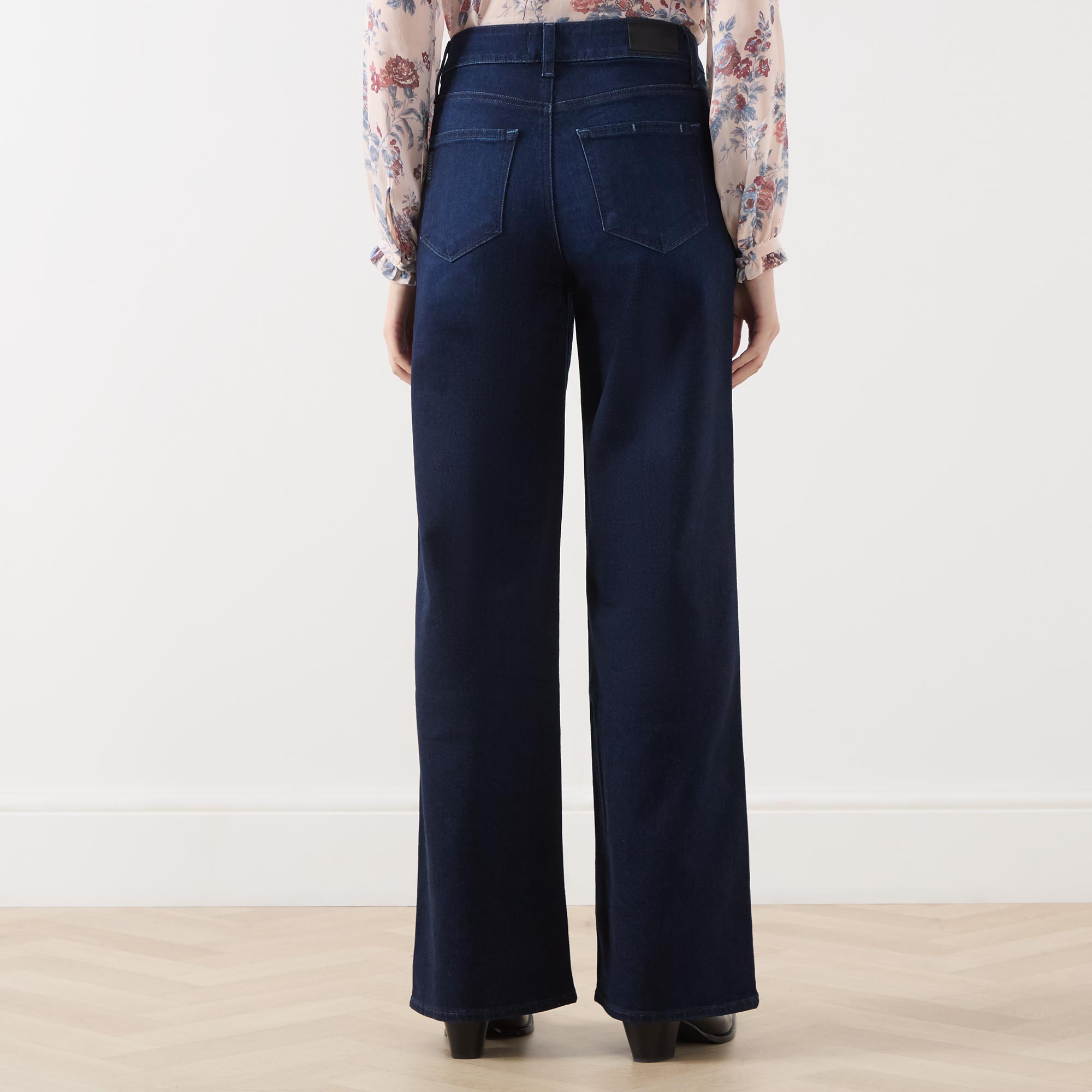 - High rise, wide leg, full length, belt loops, concealed fly and button fastening, five-pocket styling, clean hems, tonal stitching, logo patch, high stretch denim, dark wash finish