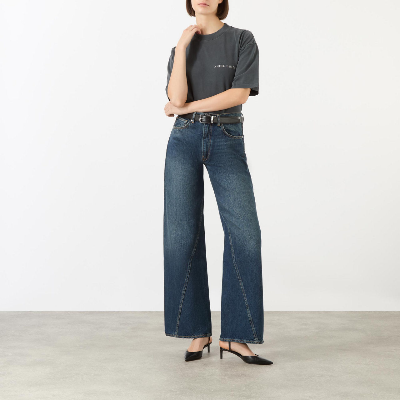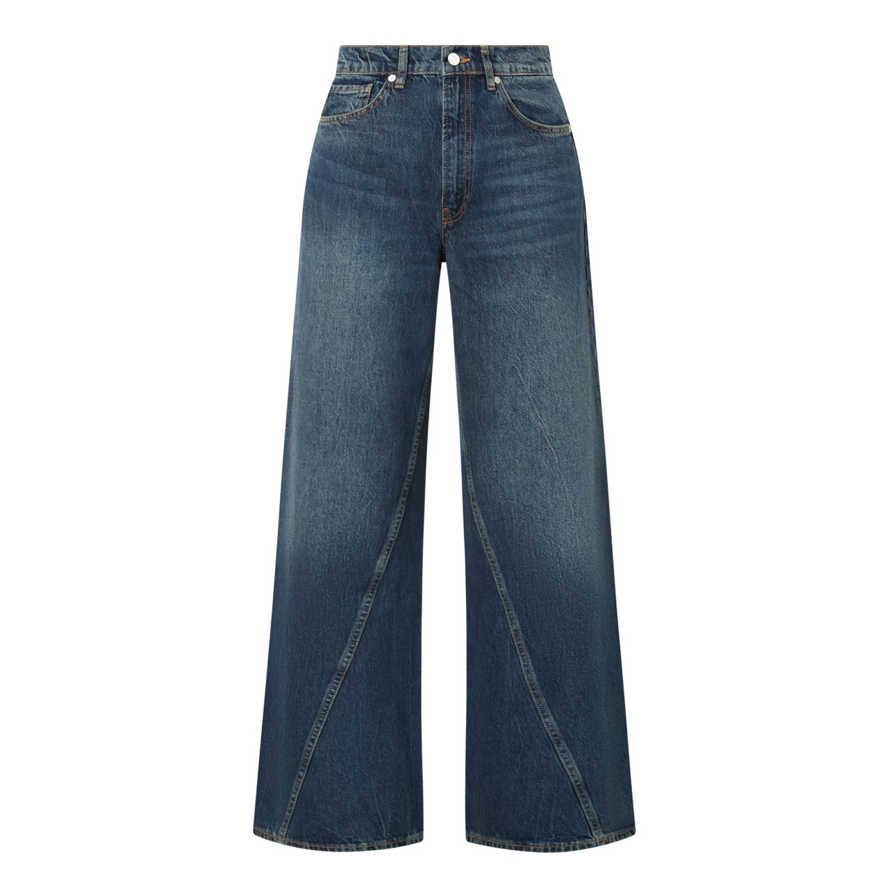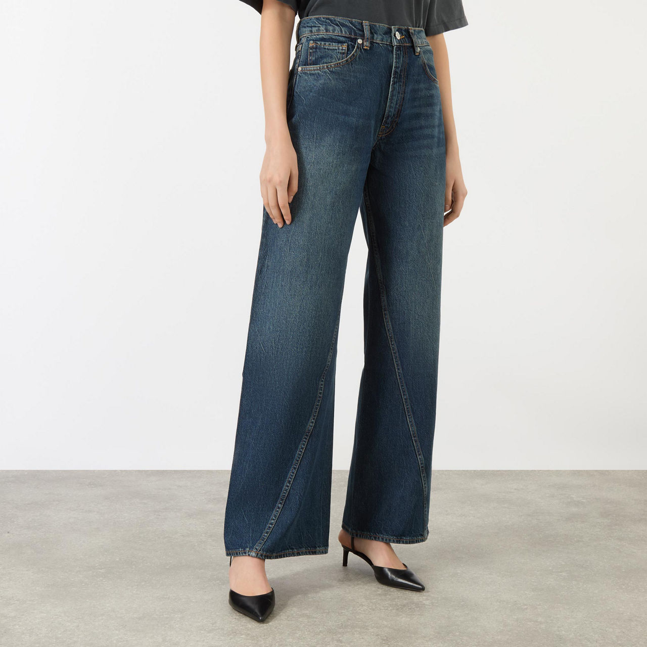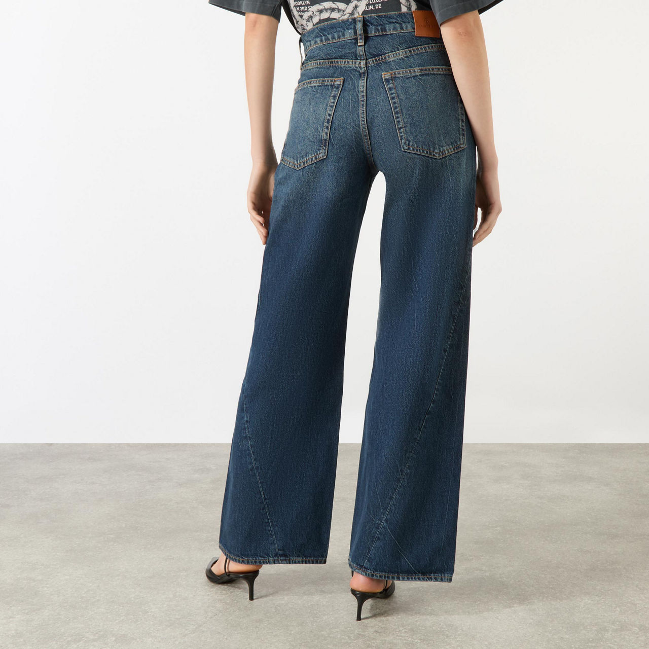 - High-rise, wide-leg, full-length, belt loops, concealed zip fly with button fastening, five-pocket styling, clean hems, contrast stitching, twisted inseam and out seam detailing, lightweight, rigid denim, subtle marbling throughout