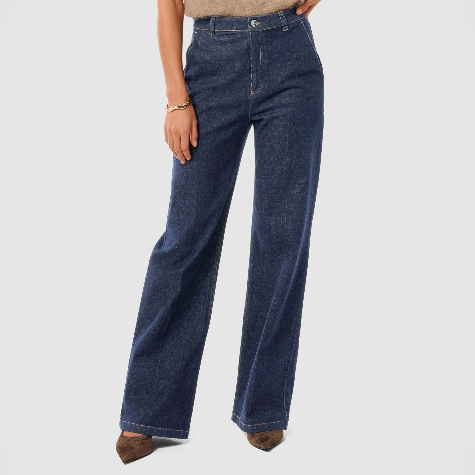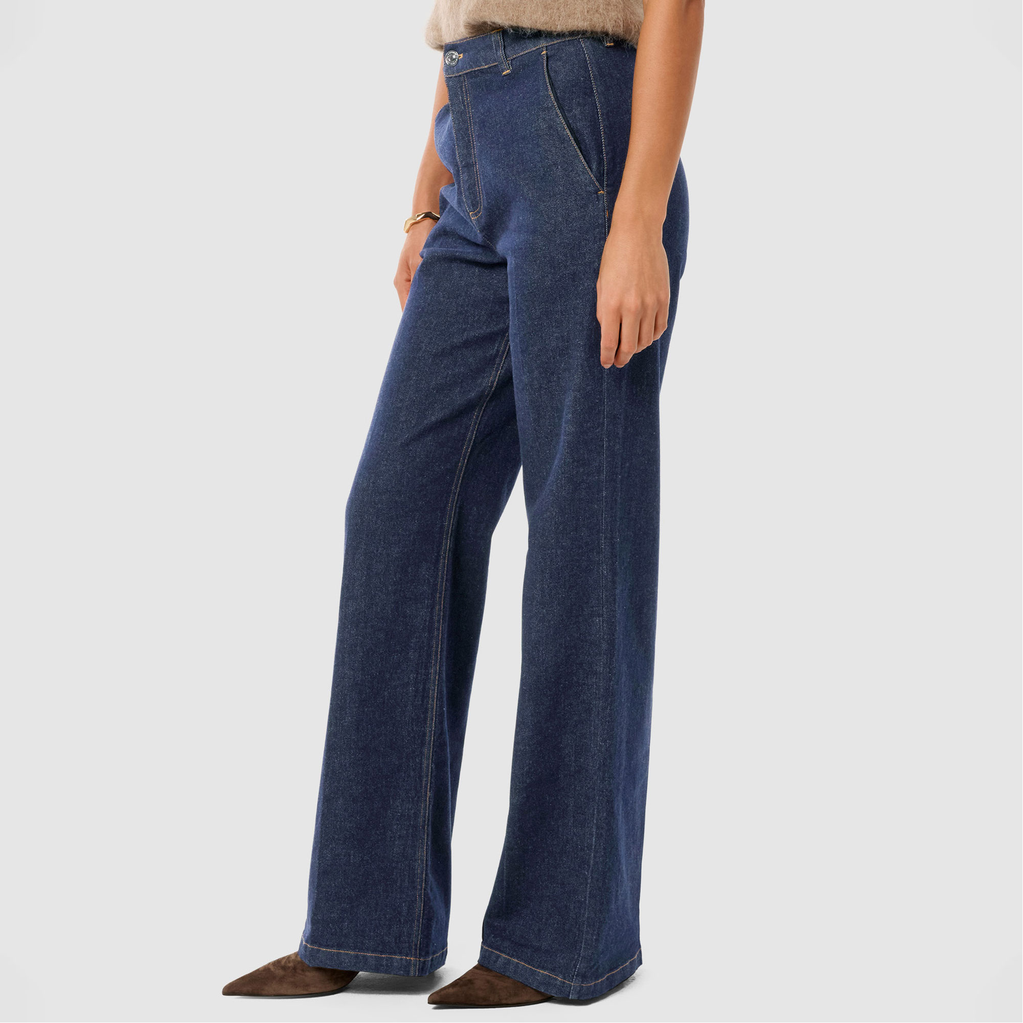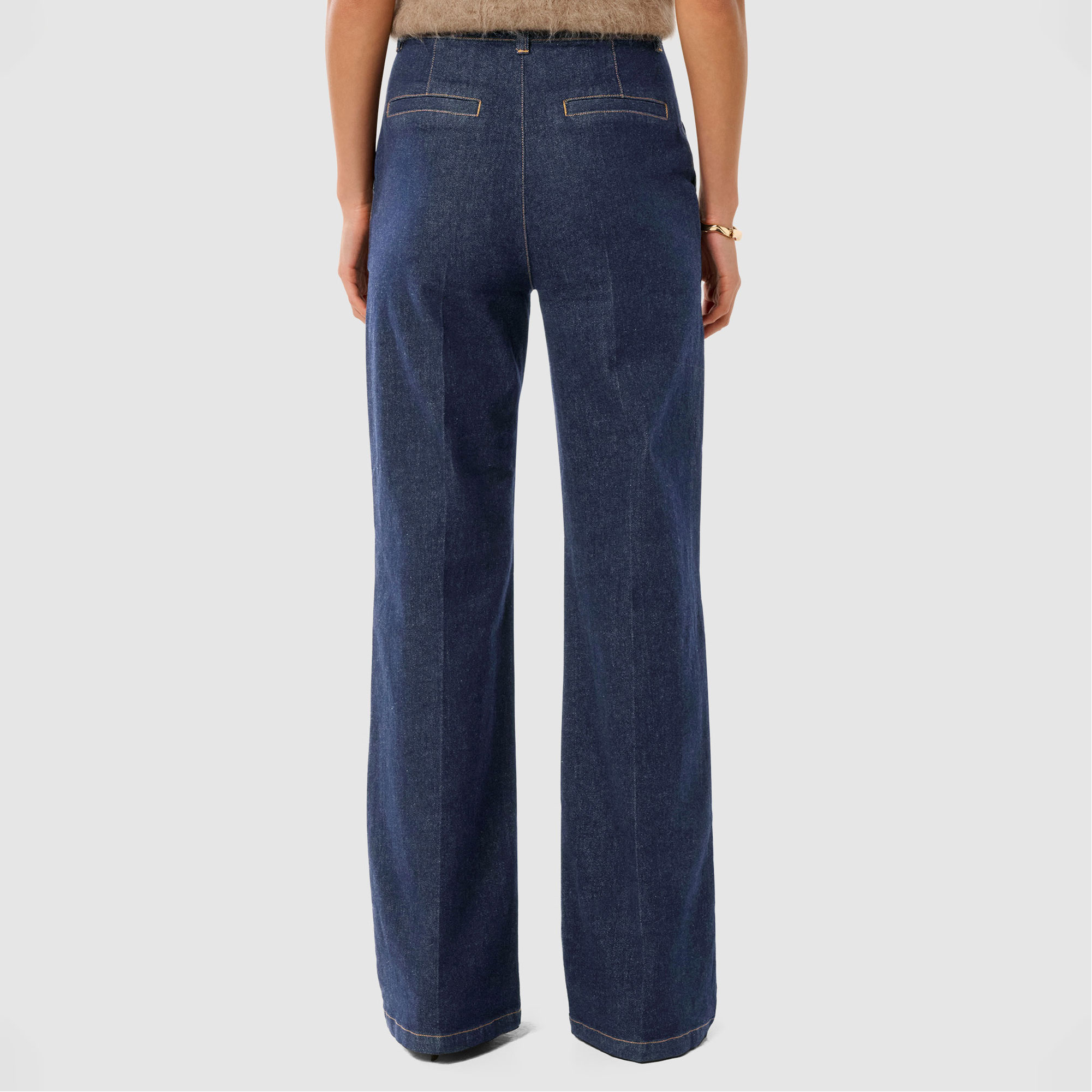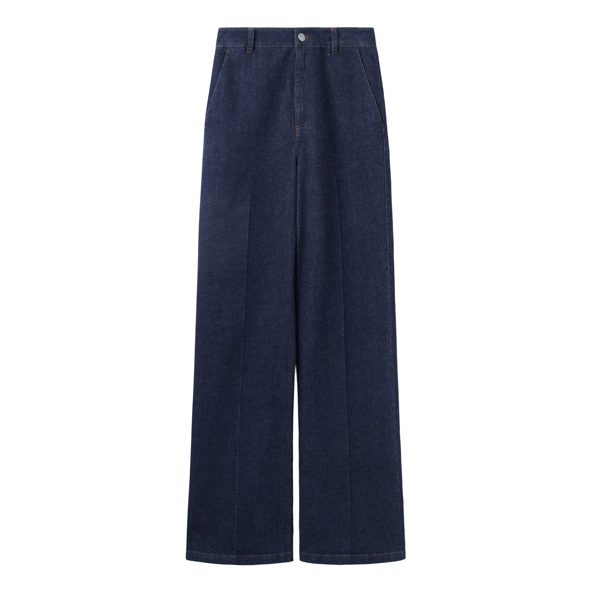 - Wide-leg silhouette, soft denim fabrication, side pockets, back welts, belt loops, zip front and button fastening