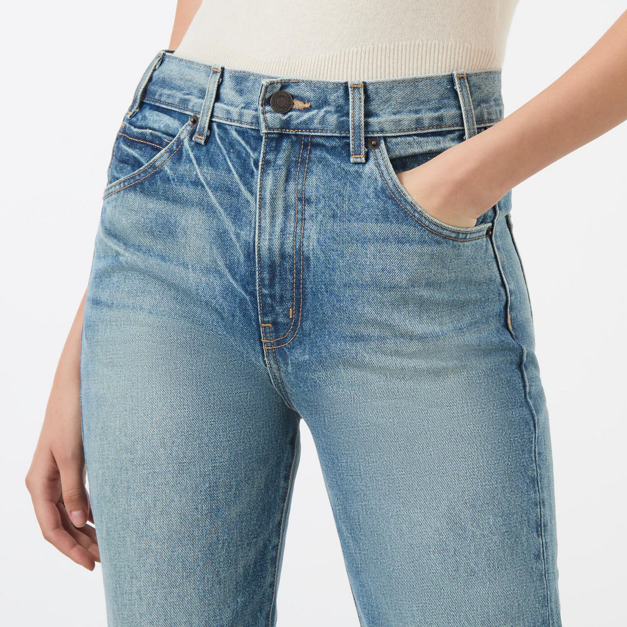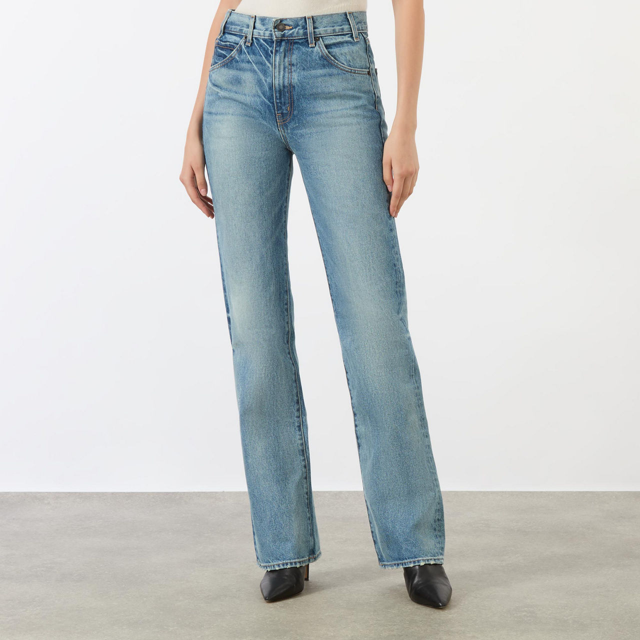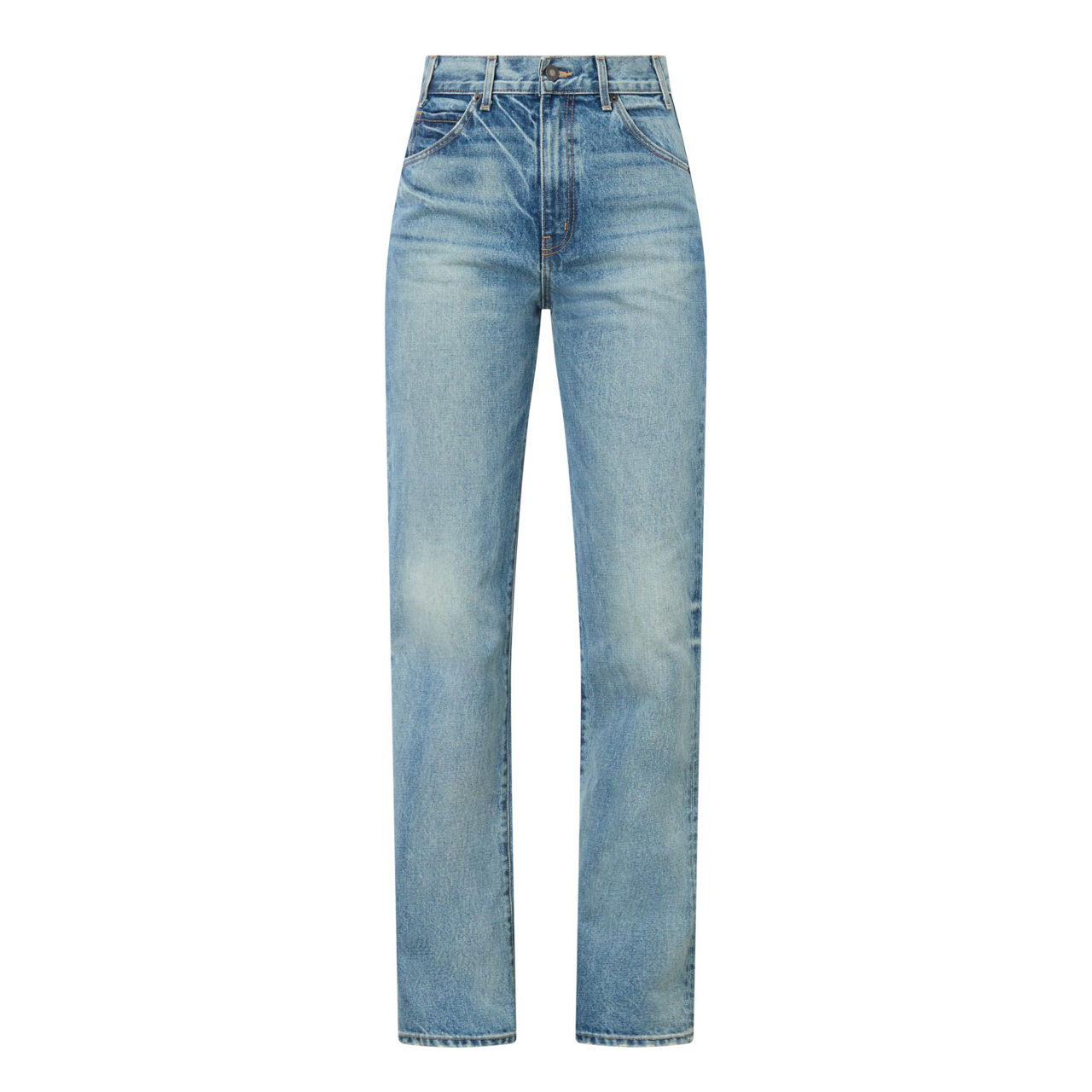 - High-rise, straight-leg, belt loops, concealed zip fly and button fastening, five-pocket styling, clean hems, washed and faded finish, contrast stitching, Japanese denim, heavyweight