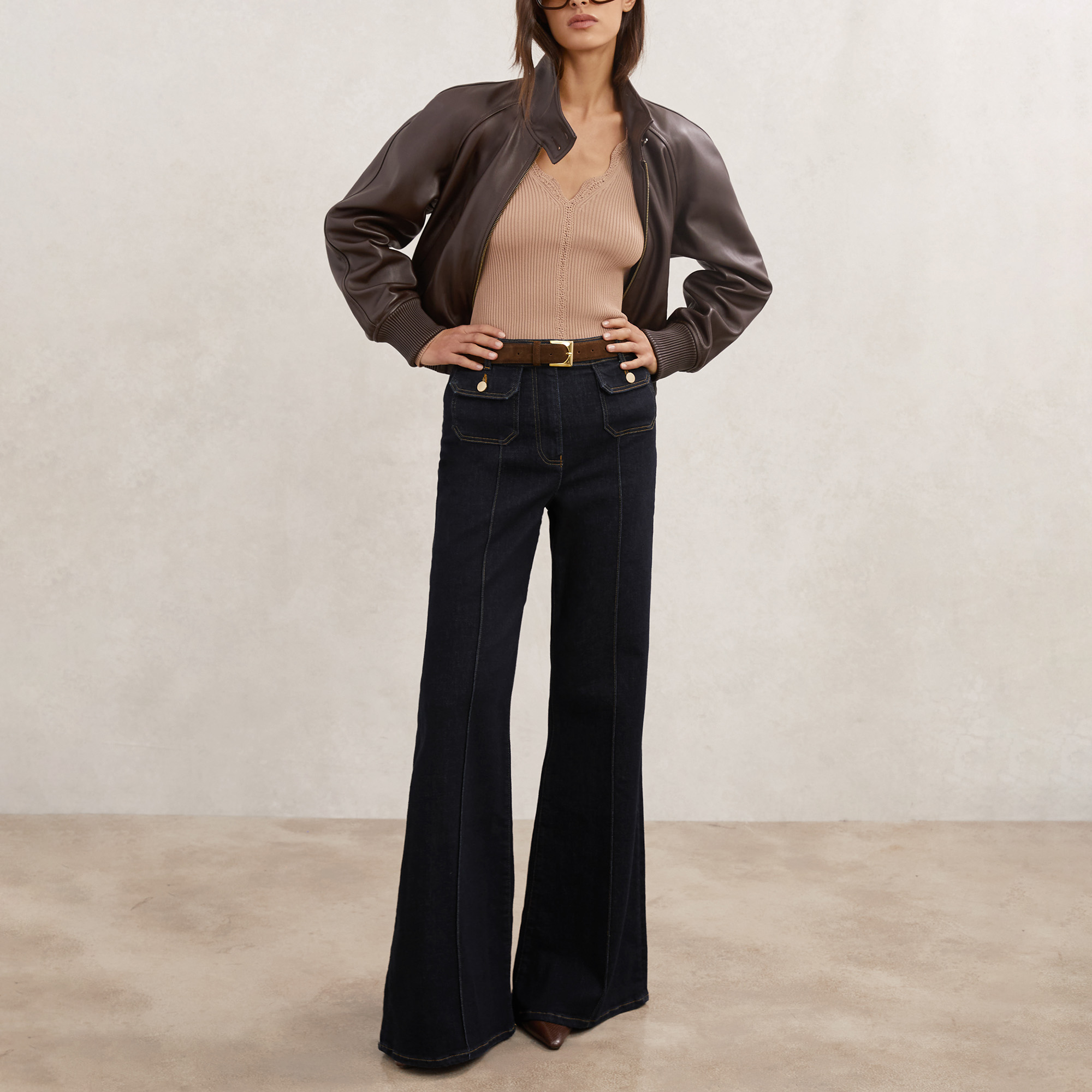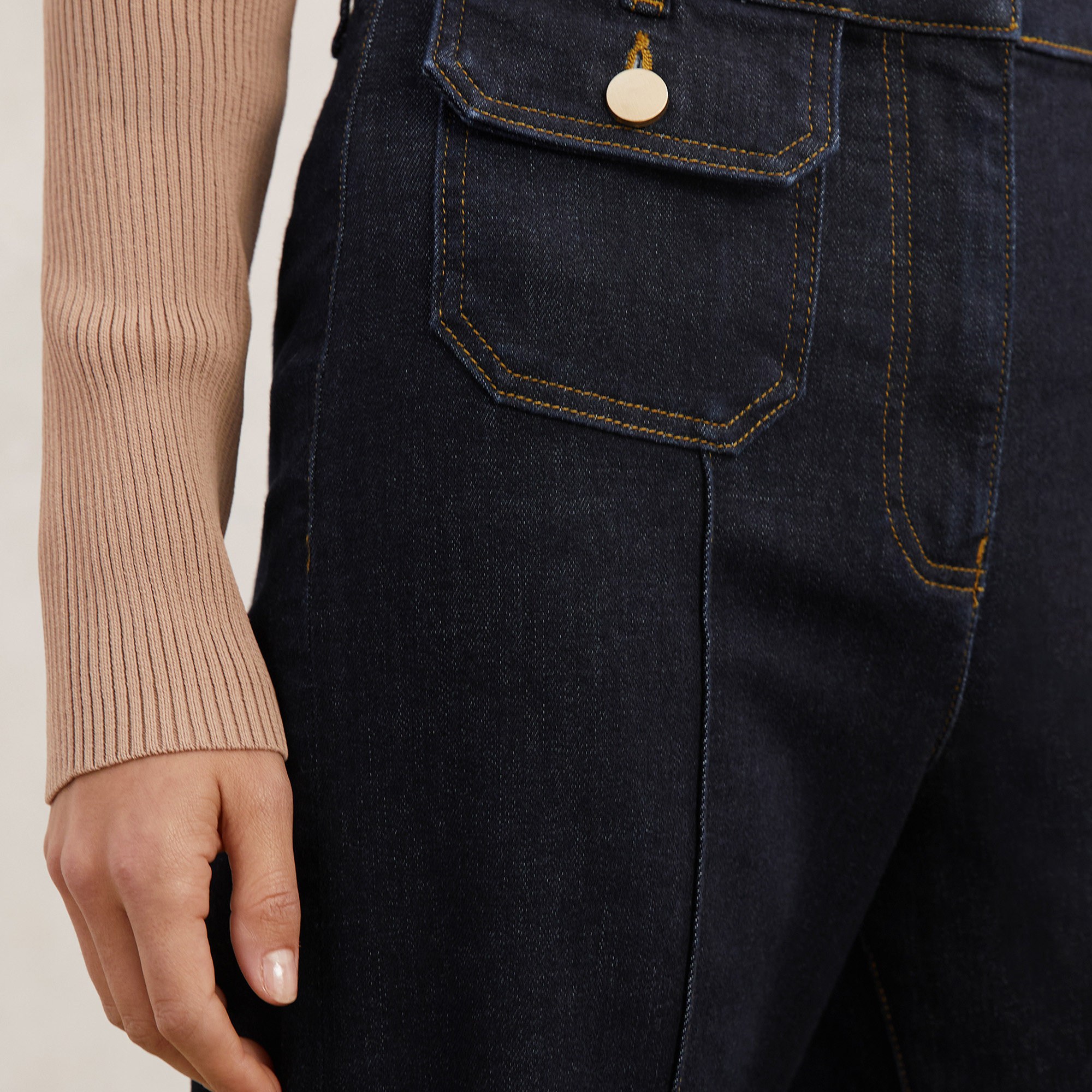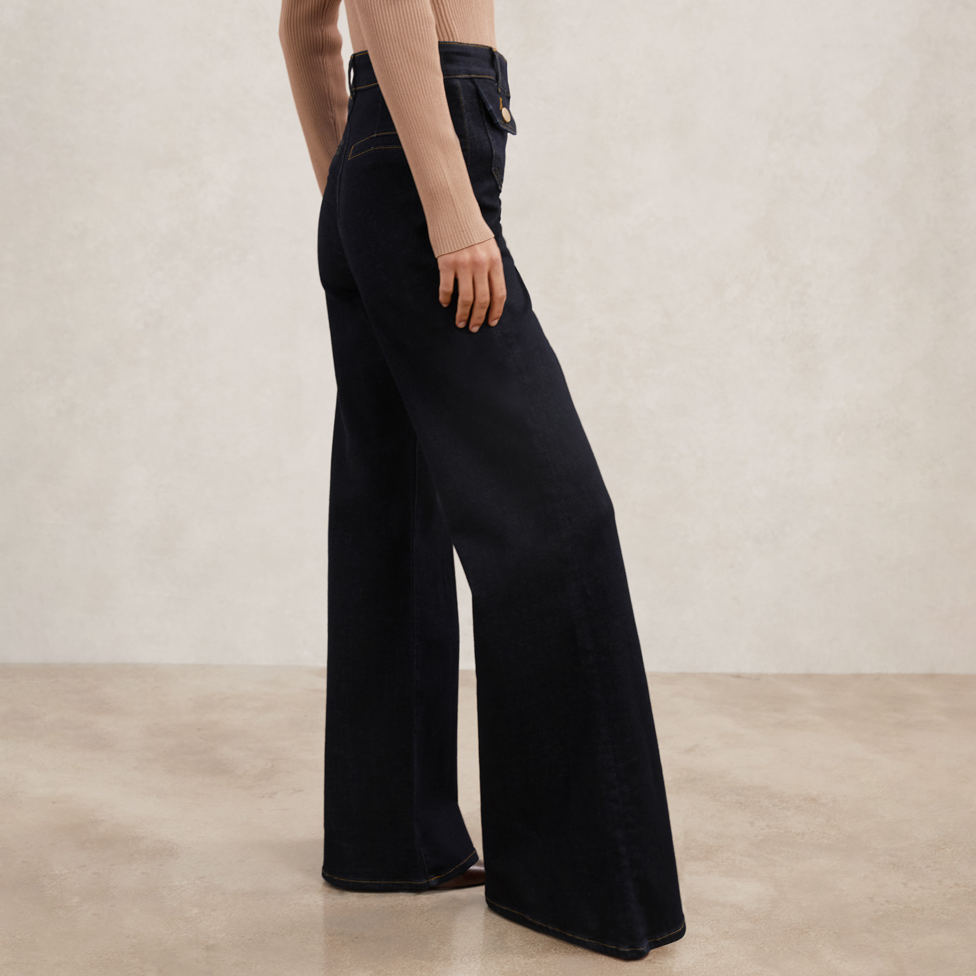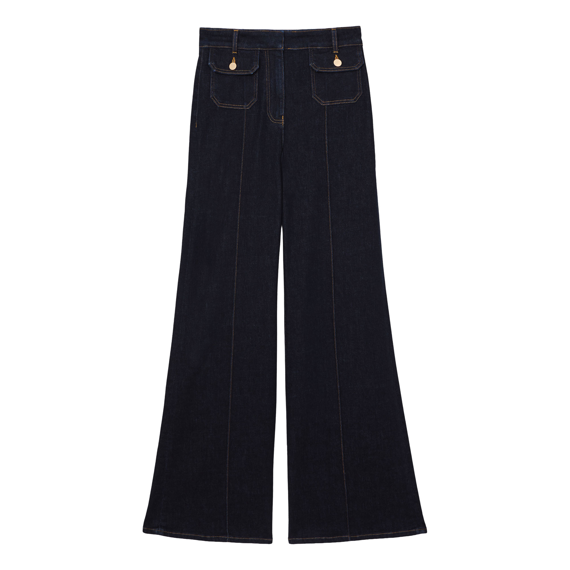 - Flared-leg silhouette, button-flap patch pockets, stretch-fused denim fabric, front pintucks, concealed zip fly fastening