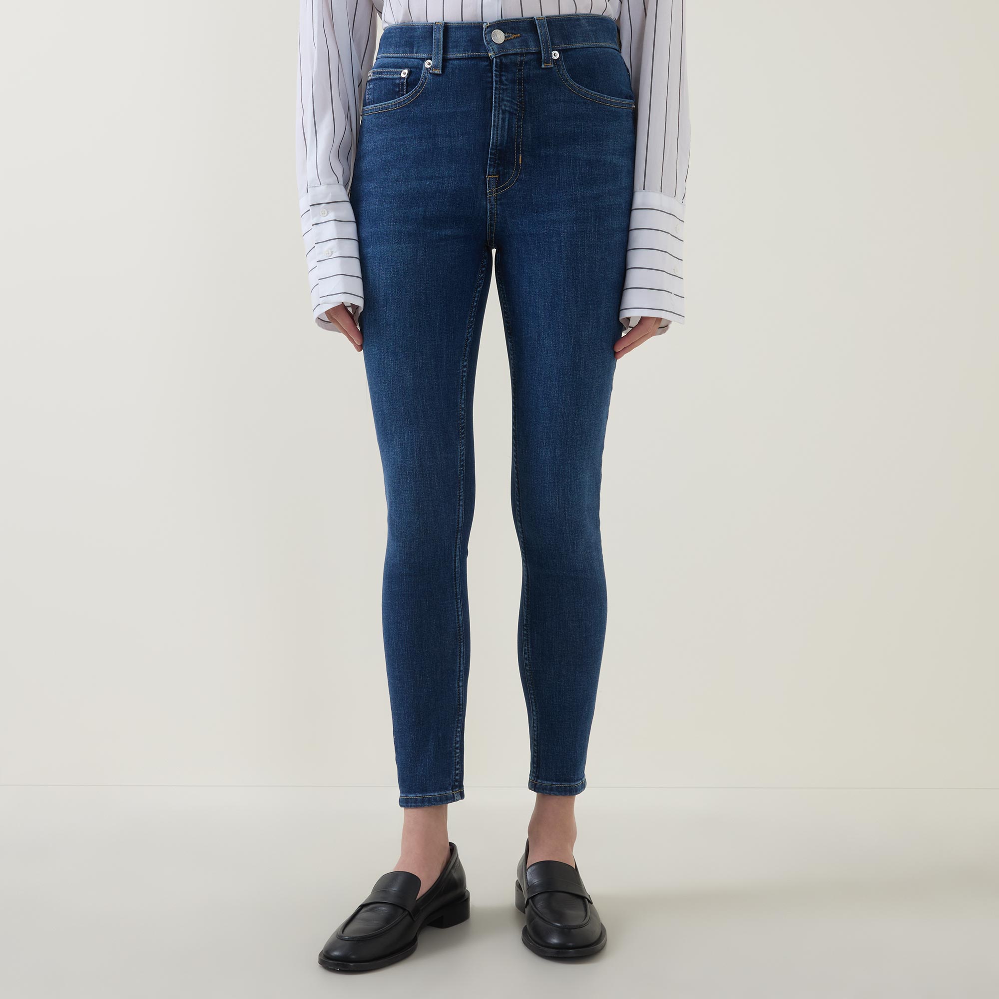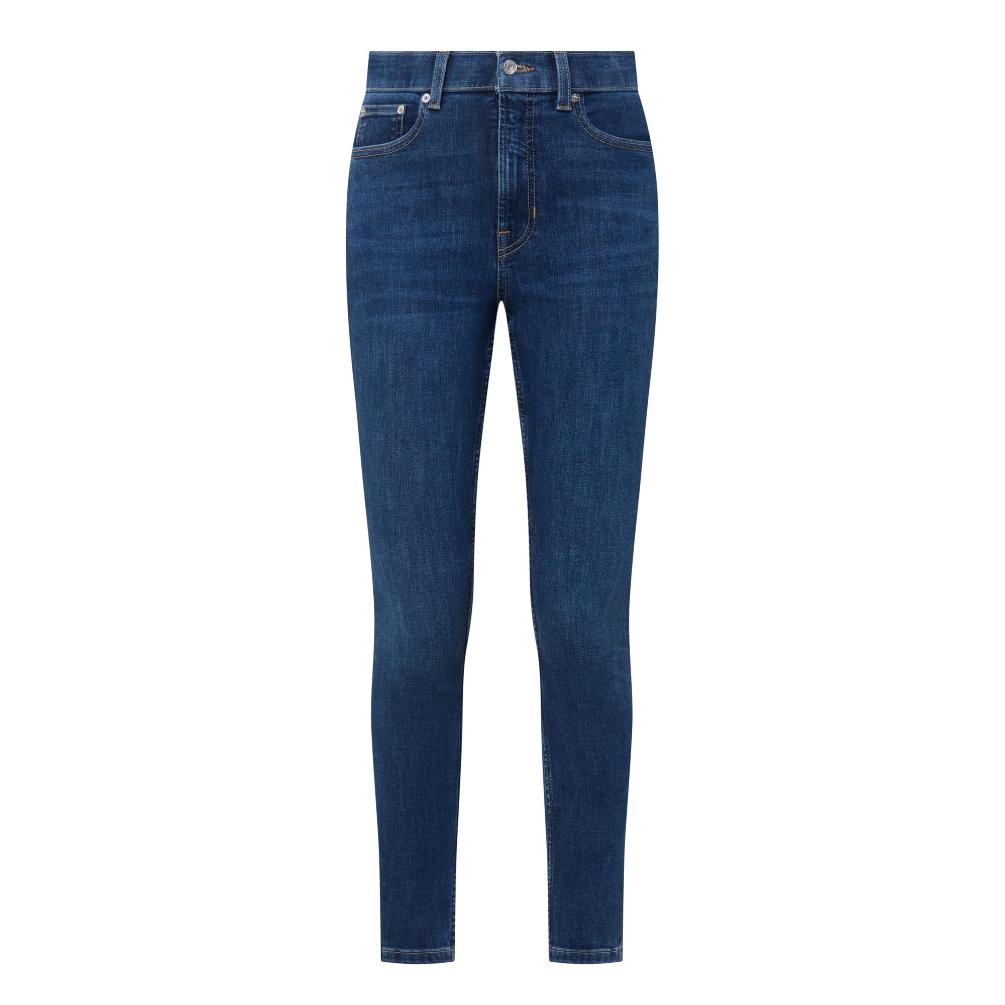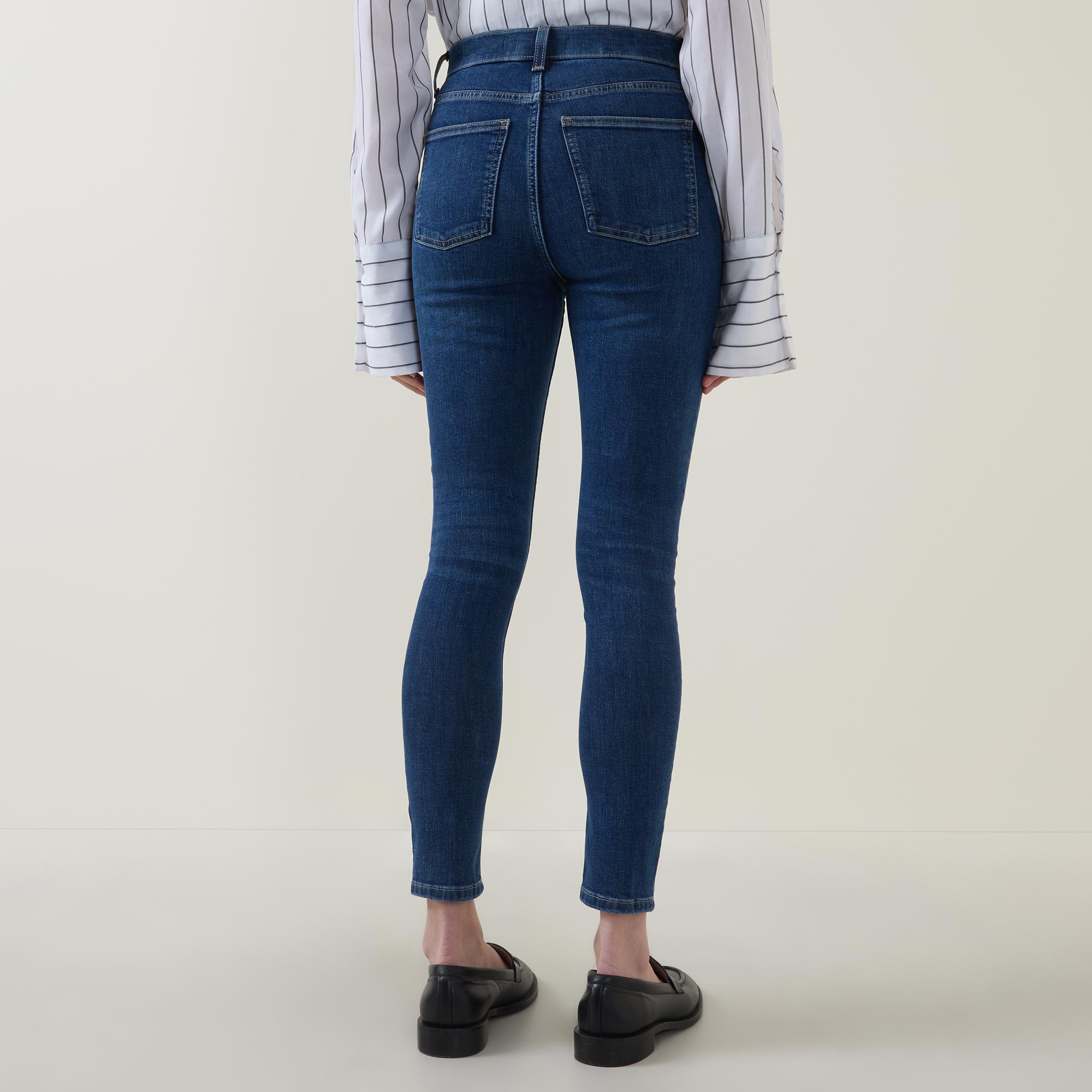 • High rise, skinny leg, belt loops, concealed fly and button fastening, five-pocket styling, clean hems, tobacco stitching, mid wash finish